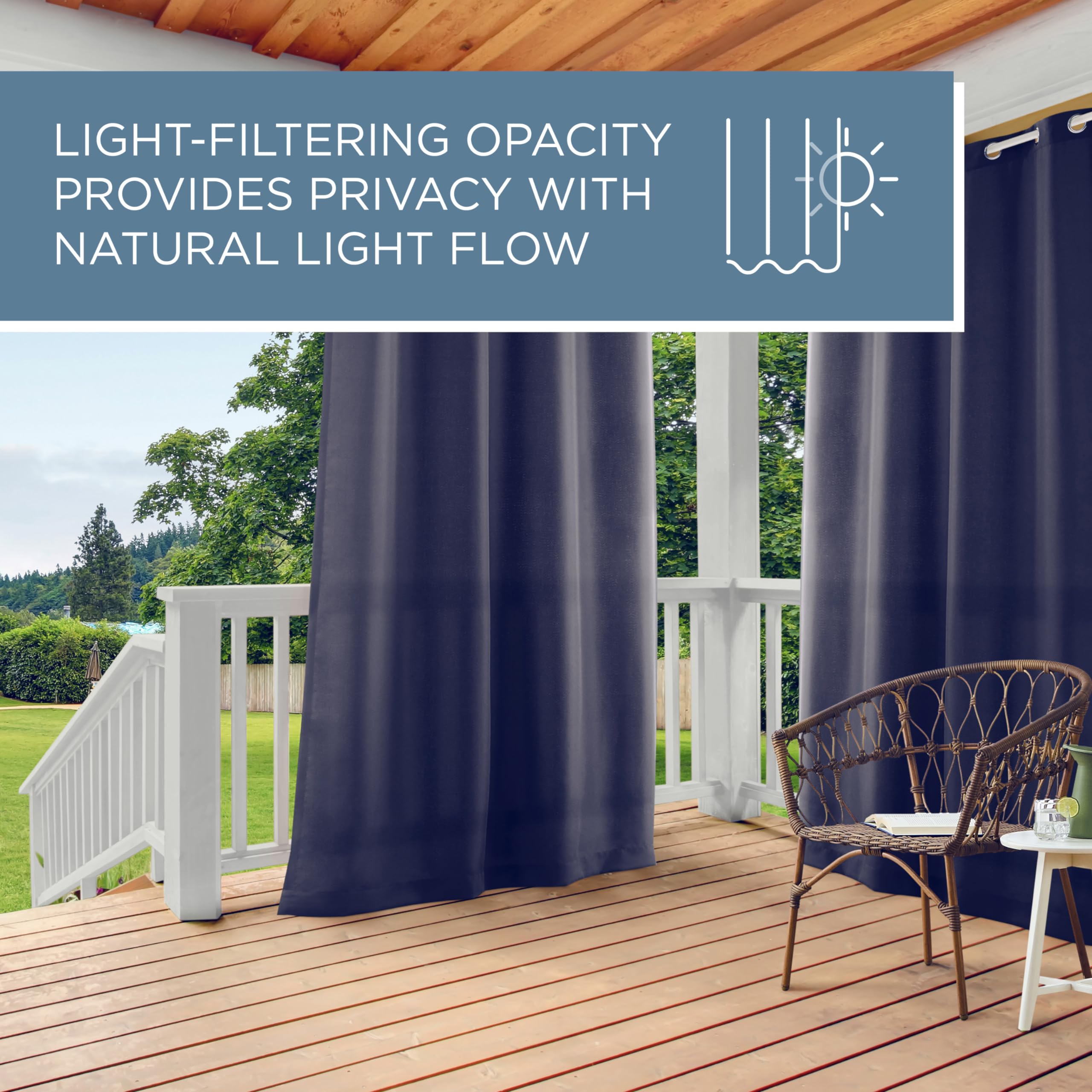 Die Cabana Vorhänge mit Lichtfilterung für drinnen und draussen sind die perfekte Ergänzung für jeden Raum. Stylen Sie diese schweren Vorhänge innen oder aussen für zusätzliche Privatsphäre, filtern Sie starkes Sonnenlicht heraus oder aktualisieren Sie einfach Ihre Innen- und Aussenräume. Dieses Vorhang-Set ist wasserabweisend und enthält acht (8) rostfreie Ösen, wodurch sie ideal für den Einsatz auf Ihrer Terrasse, Deck, Pergola, Cabana, Lanai oder Wintergarten. Diese strapazierfähigen Vorhänge passen auf jede Gardinenstange mit einem Durchmesser von bis zu 3,2 cm und können bei Bedarf leicht gereinigt werden.