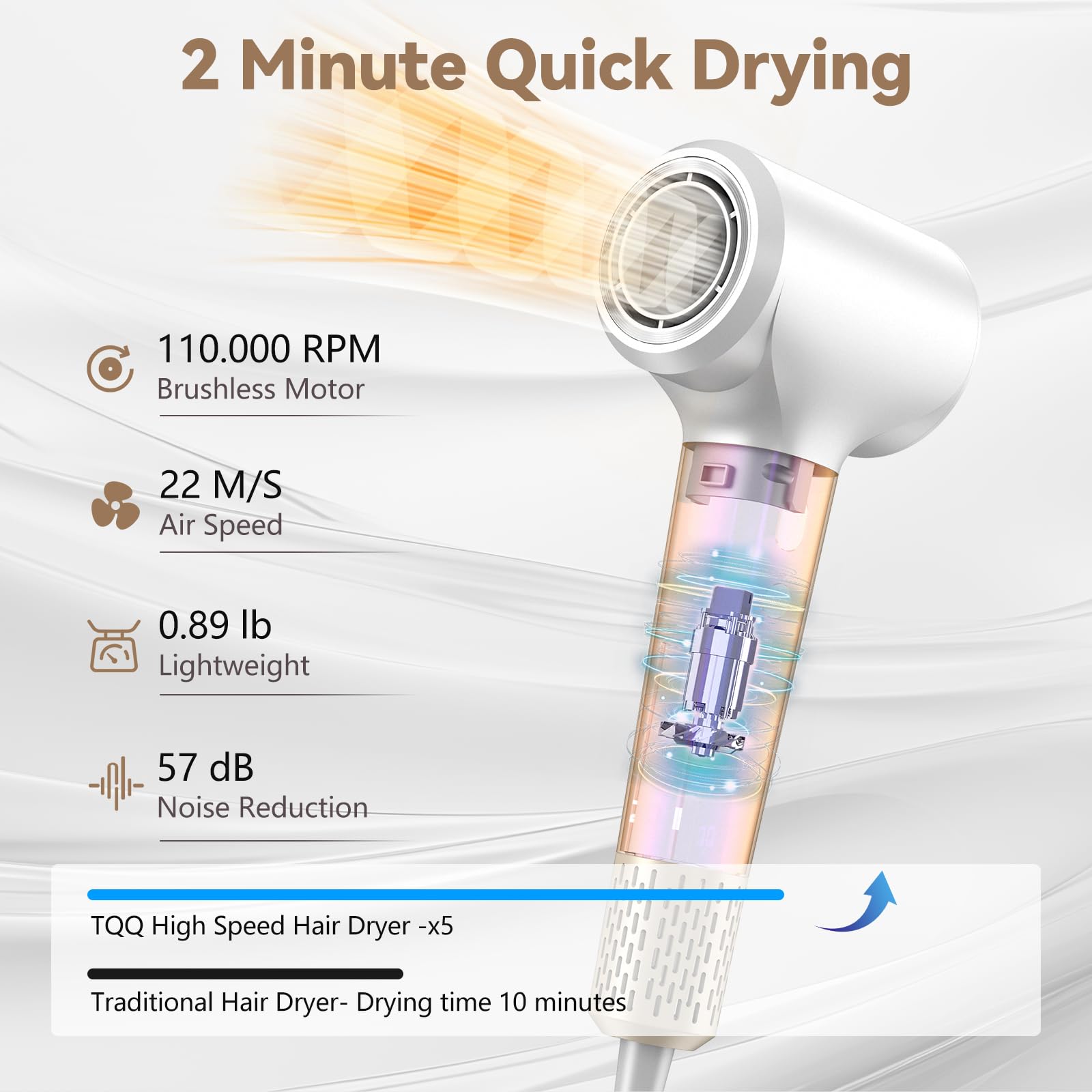 • 【2 Minuten Schnelles Trocknen】TQQ Haartrockner ist mit einem bürstenlosen Hochgeschwindigkeits motor mit 110.000 U/min ausgestattet, die Windgeschwindigkeit erreicht 22 m/s. Ein starker Luftstrom kann das Haar in kurzer Zeit trocknen, fünfmal schneller als herkömmliche Haartrockner.