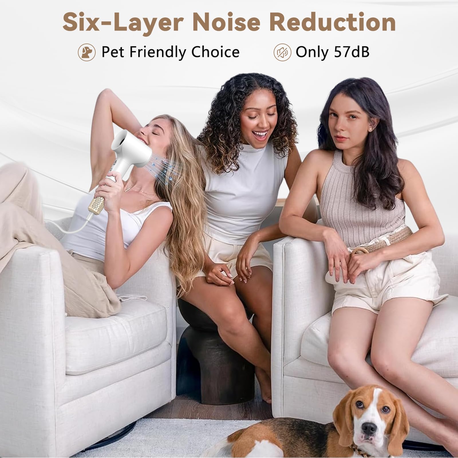 Geben Sie weniger aus und genieBen Sie mehr Der Haartrockner verfügt über eine 200-Millionen-Negativ-Ionen-Haarpflege Technologie.Neutralisiert statische Elektrizität und macht das Haar glatt und glänzend. Der Haartrockner ist einem fortschrittlichen bürstenlosen Hochgeschwindigkeitsmotor mit 110.000 U/min und einer Windgeschwindigkeit von 22 m/s ausgestattet.Der kraftvolle Luftstrom trocknet das Haar in kurzer Zeit, 5 mal schneller als herkömmliche Föhne. Das intelligente Thermo kontroll system misst den Luftstrom über 57 Grad pro Sekunde, um Ihr Haar vor extremen Hitzeschäden zu schützen. Wenn der Haartrockner in Betrieb ist, beträgt der Lärm nur 57 dB, Das Trocknen der Haare spät in der Nacht hat keinen Einfluss auf den Schlaf Ihrer Familie.