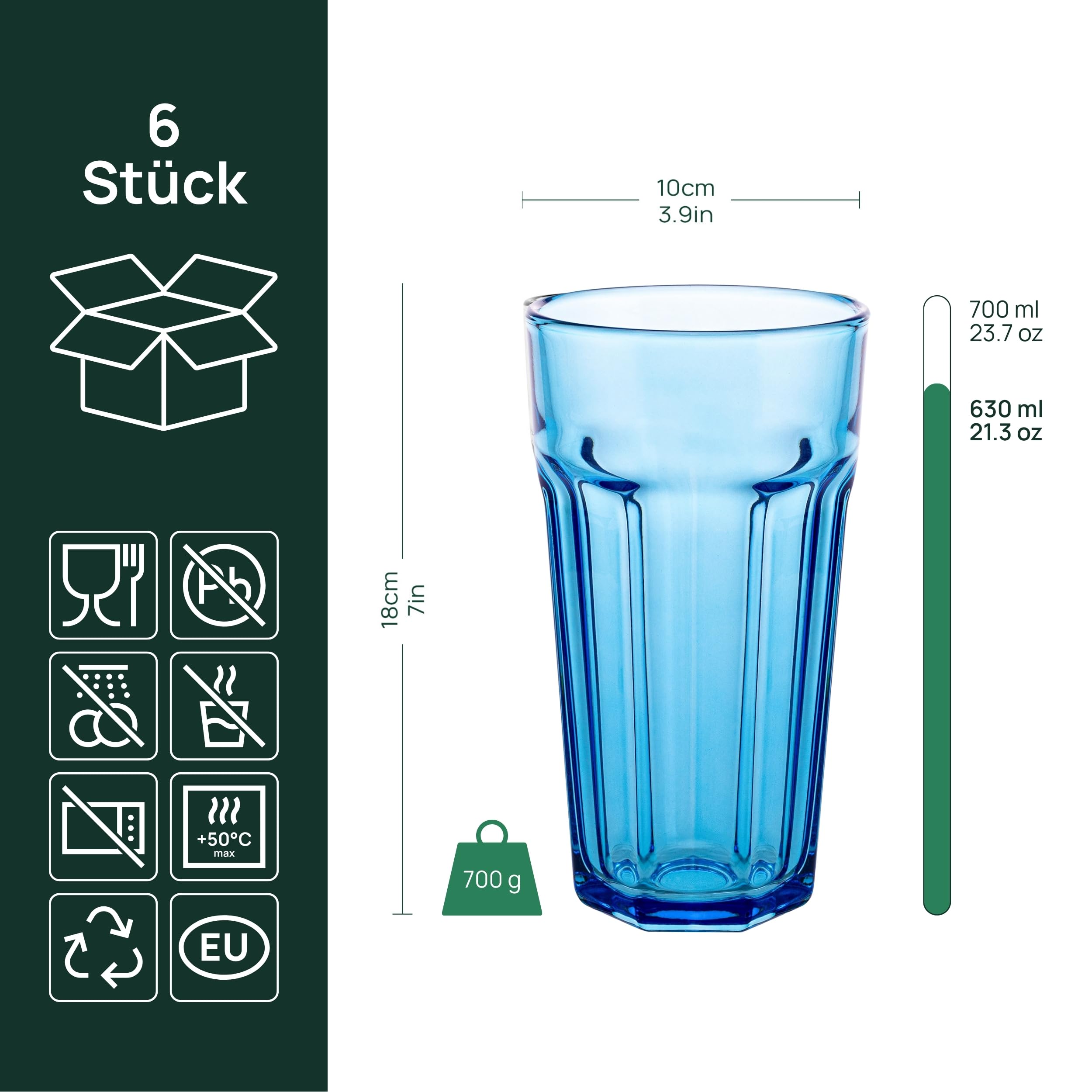 XXL-Farbgläser Gigi Rainbow Blast - Set mit 6x700 ml Diese farbenfrohen Gläser sind die perfekte Wahl für jeden Tisch! Das Set besteht aus 6 Gläsern mit einem Fassungsvermögen von jeweils 700 ml, die mit ihrem Aussehen und der XXL-Grösse beeindrucken. Jedes Glas hat eine einzigartige, transparente Farbe, was sie ideal für Geburtstagsfeiern, Picknicks oder tägliche Mahlzeiten macht, indem sie jeder Gelegenheit Freude und Charme verleihen. Sie eignen sich hervorragend für Säfte, kalte Getränke, Cocktails, Smoothies, und sogar für gefrorenen Kaffee. Vermeiden Sie plötzliche Temperaturänderungen über 50°C. Nicht in der Spülmaschine waschen. Bei der Handwäsche keine scharfen Gegenstände verwenden; es wird empfohlen, eine feuchte Tuch zu benutzen (sanfte Reinigung wird vorgeschlagen). Aus Sicherheitsgründen sollten kleine Kinder Glaswaren nur unter Aufsicht von Erwachsenen verwenden.