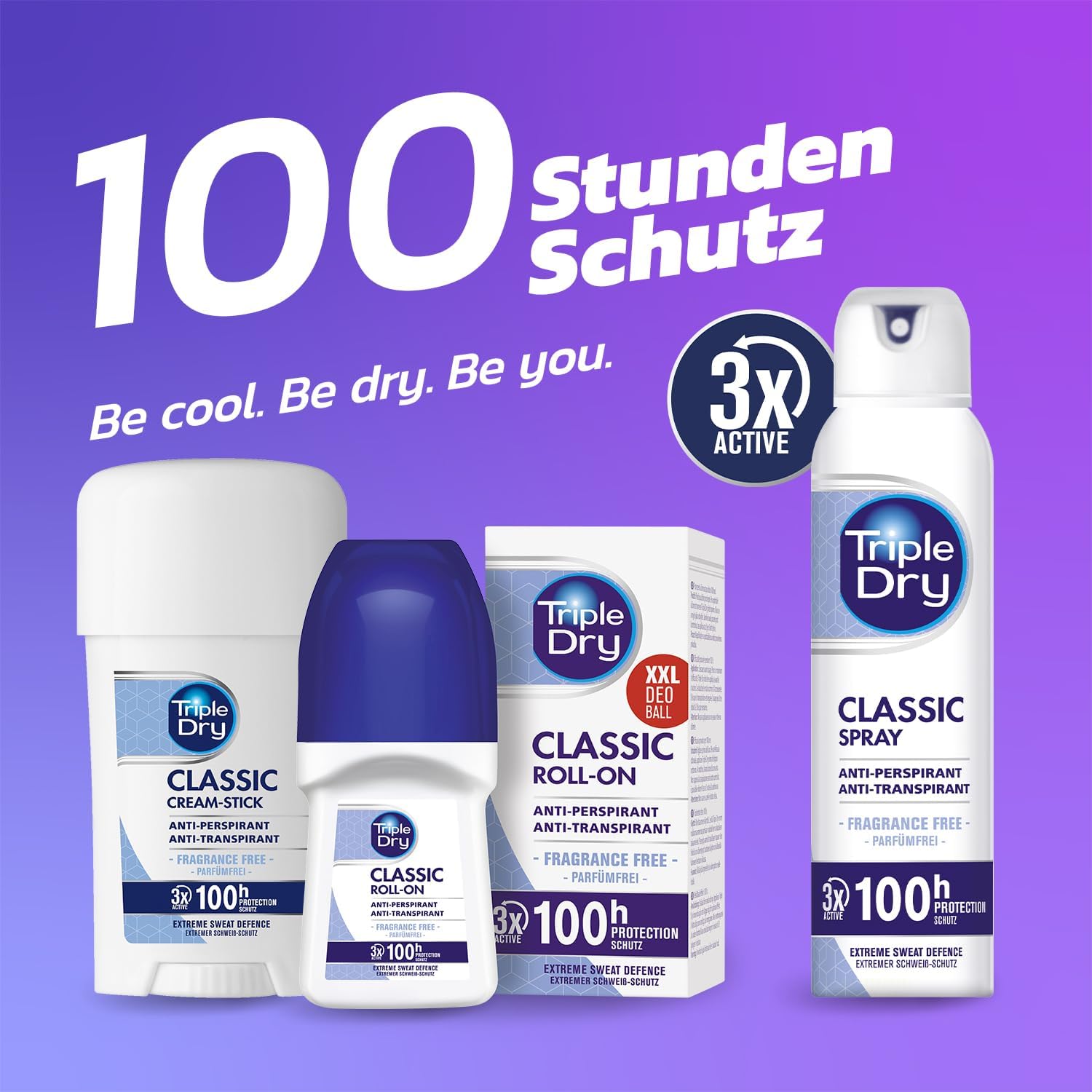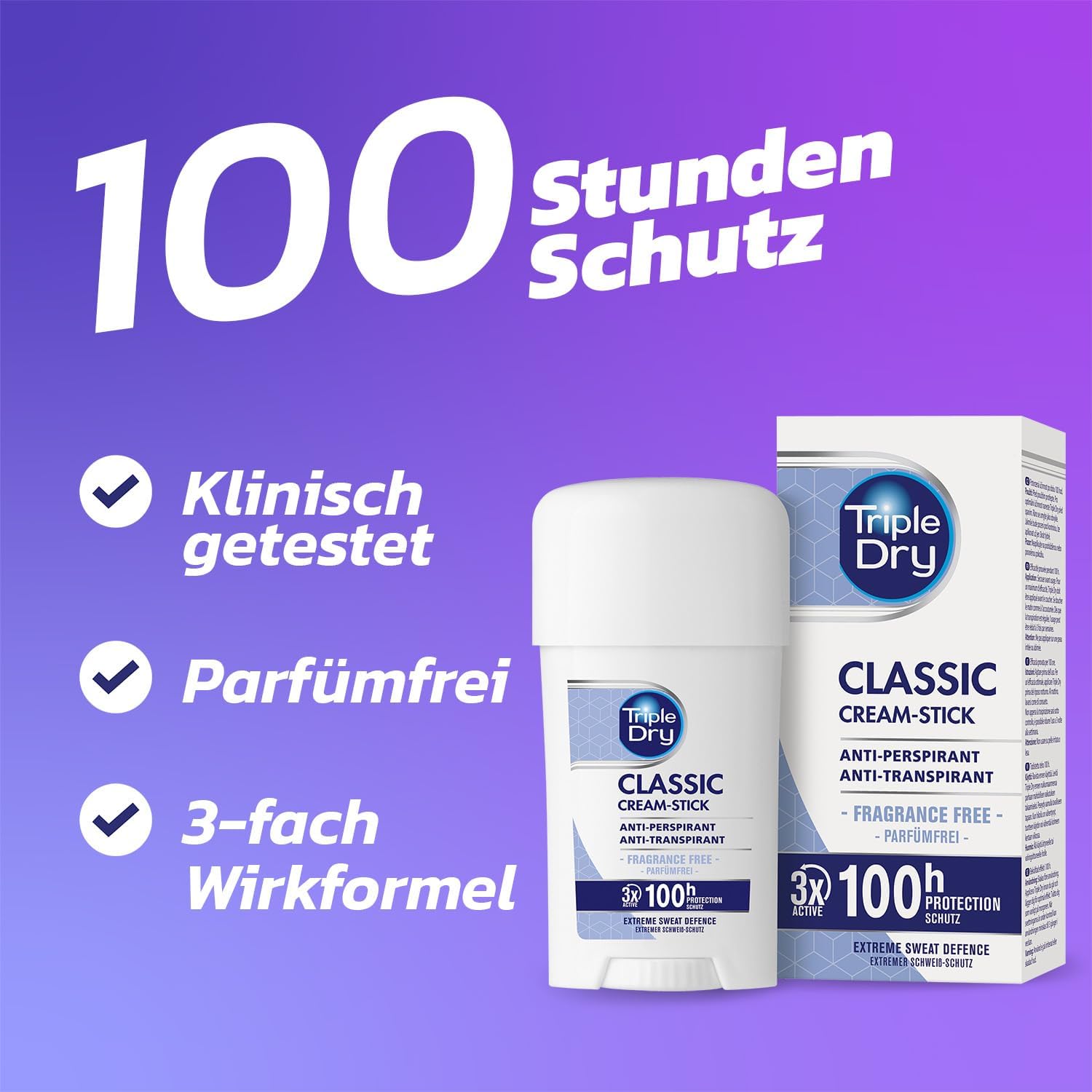 Der Triple Dry Classic Anti-Transpirant Creme-Stick ist fuer alle gedacht, die bei starkem bis extrem starkem Schwitzen eine klare Loesung wollen: parfuemfrei, schnell anwendbar und bis zu 100 Stunden wirksam (Herstellerangabe). Die cremige Textur laesst sich leicht und gleichmaessig auftragen und ist damit ideal fuer den taeglichen Einsatz. Weil die Formel ohne Parfuem auskommt, kannst du sie problemlos mit deinem eigenen Duft oder Parfum kombinieren, ohne dass sich Gerueche mischen.