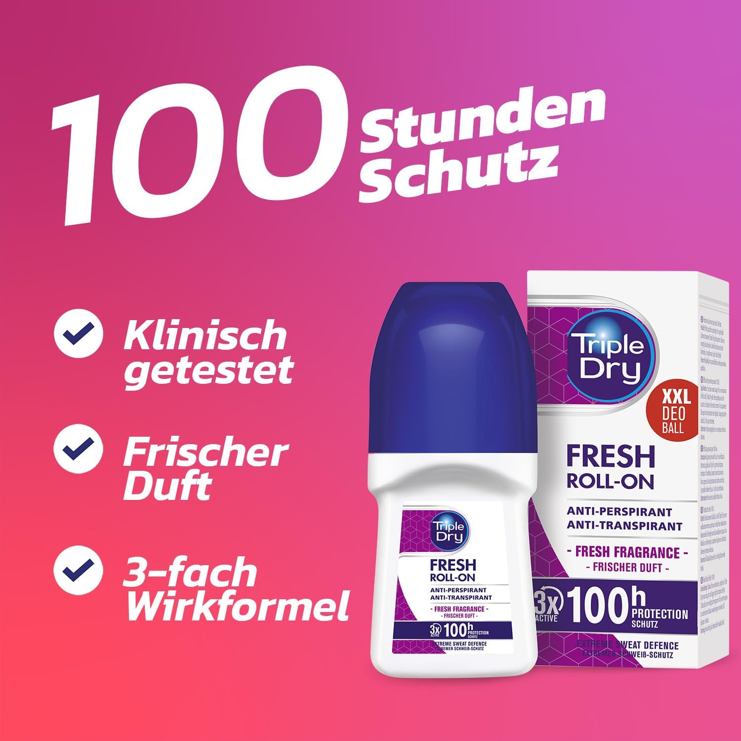 Der Triple Dry Fresh Roll-On ist ein leistungsstarkes Anti-Transpirant gegen starke Achselnaesse und bietet nachweislich mindestens 100 Stunden Schutz vor Transpiration (Herstellerangabe). Der Duft ist dezent frisch, die Wirkung antibakteriell ausgerichtet und damit klar auf das Problem Schweiss und Schweissgeruch fokussiert. Im Unterschied zu klassischen Deos, die vor allem Geruch ueberdecken, setzt ein Anti-Transpirant direkt bei der Schweissbildung an und hilft, die Transpiration langfristig zu kontrollieren.