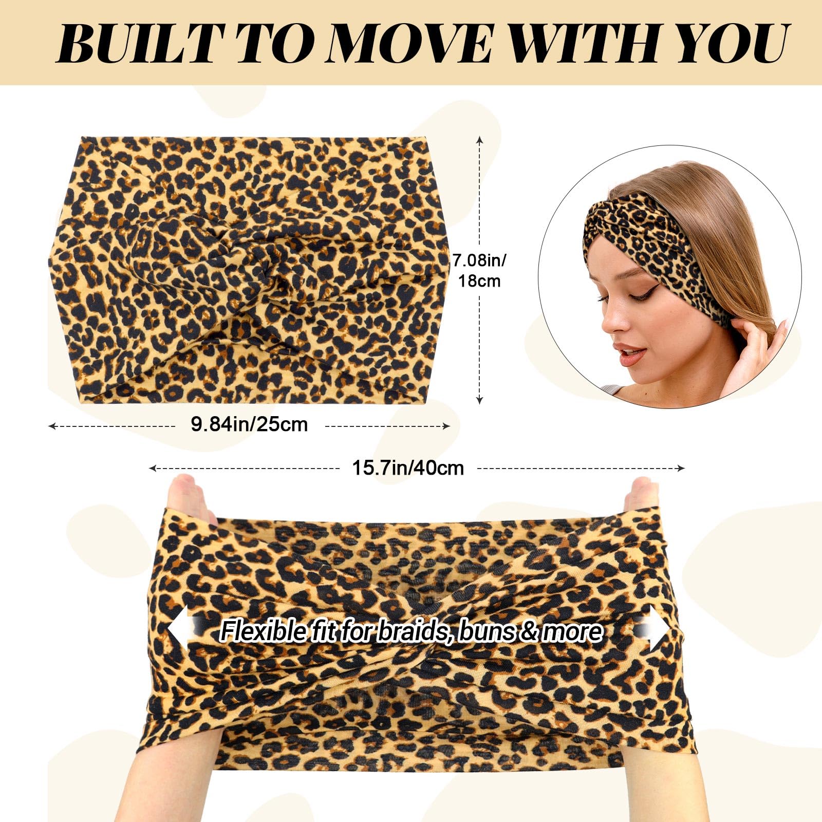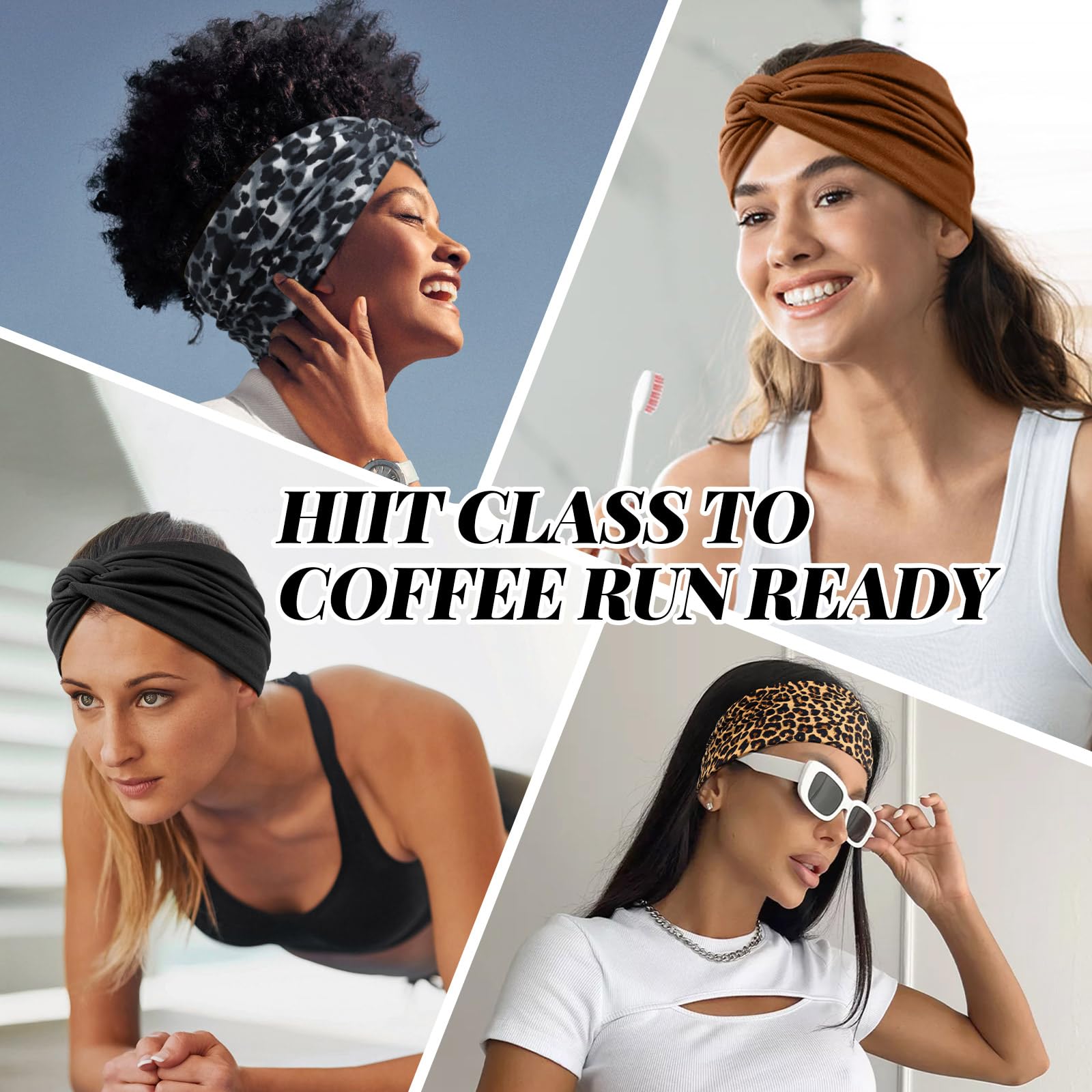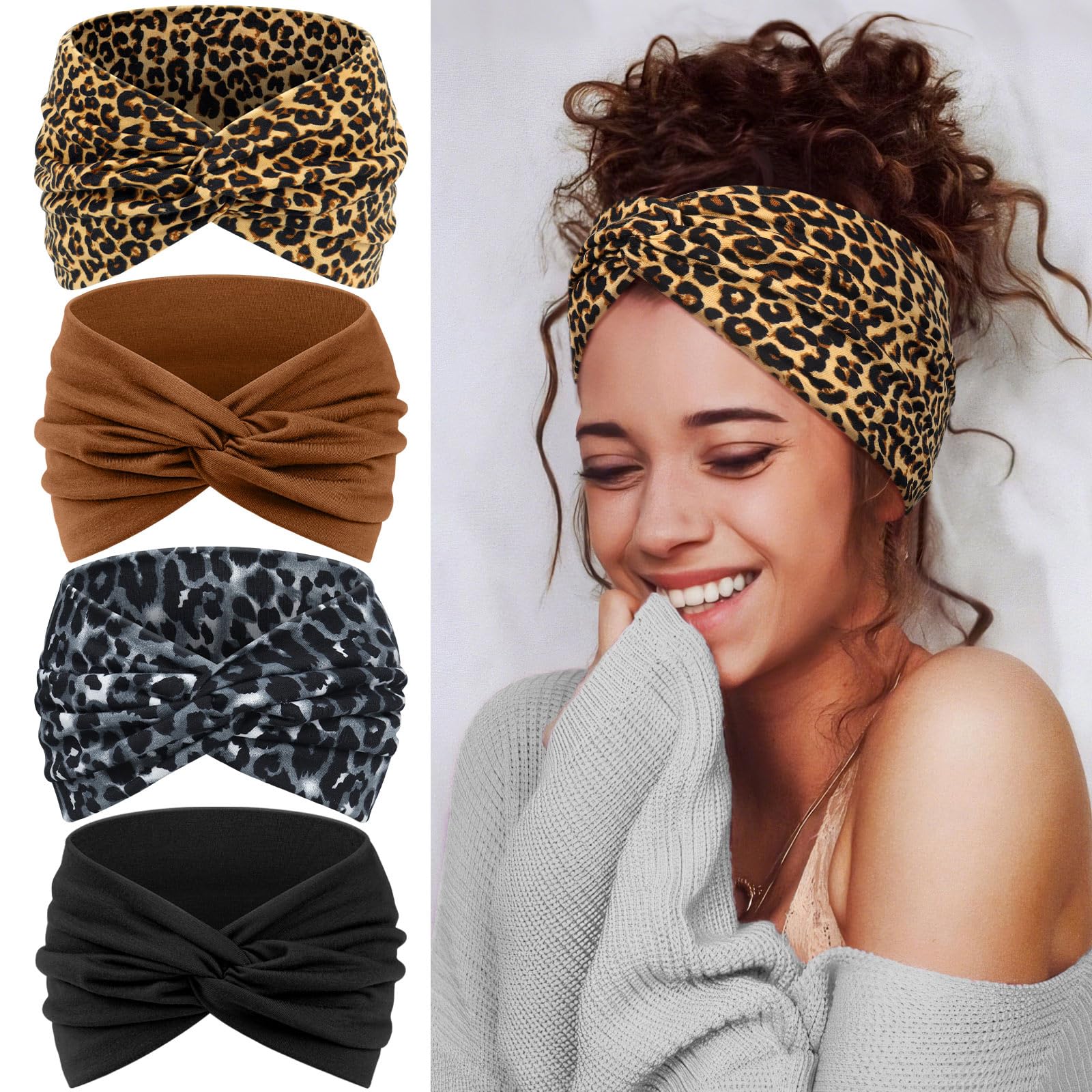 Tumurup 4 Pcs Haarband Damen Dünn, Stirnband Damen Sport - Breite Elastische Weiche Haarbänder für Yoga, Fitness & Kosmetik - Headband Haarschmuck Summer (Braun, Schwarz, Leopard Braun, Leopard Grau)