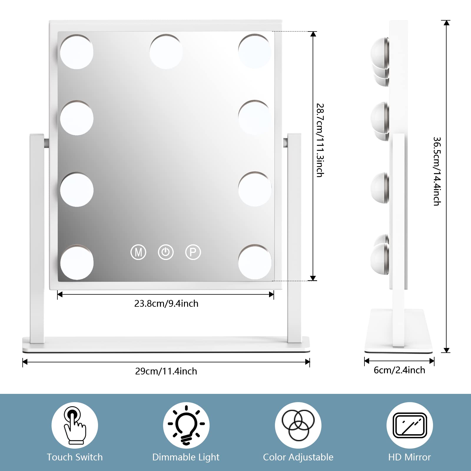 TUREWELL Hollywood Make-up-Spiegel mit Lichtern, grosser beleuchteter Kosmetikspiegel mit 3 Farblicht und 9 dimmbaren LED-Leuchtmitteln, Smart-Touch-Control-Bildschirm und 360-Grad-Drehung