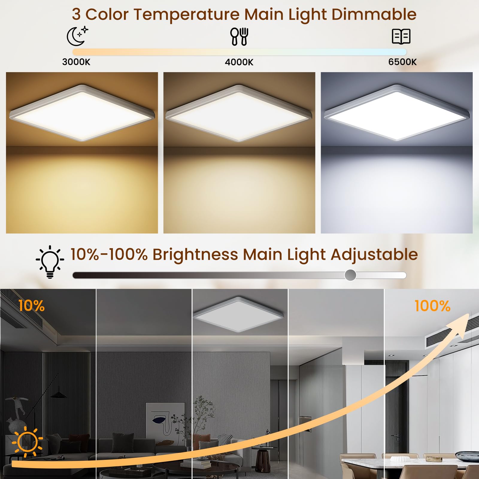 - 【Deckenleuchte mit Fernbedienung - einfache Einstellung der verschiedenen Funktionen】Mit der Fernbedienung können Sie alle Funktionen der deckenlampen schnell und einfach bedienen, um Ihren persönlichen Vorlieben und Anforderungen an das Ambiente gerecht zu werden.3000K - 6500K stufenlos einstellbare Farbtemperatur, 10% - 100% stufenlos einstellbarer Farbtemperaturbereich, One-Touch-Nachtlicht, Einschalten des beleuchteten Nachtlichts unabhängig voneinander oder gleichzeitiges Einschalten des Hauptlichts und der Hintergrundbeleuchtung, Doppelfunktionstimer und Memory-Funktion.
