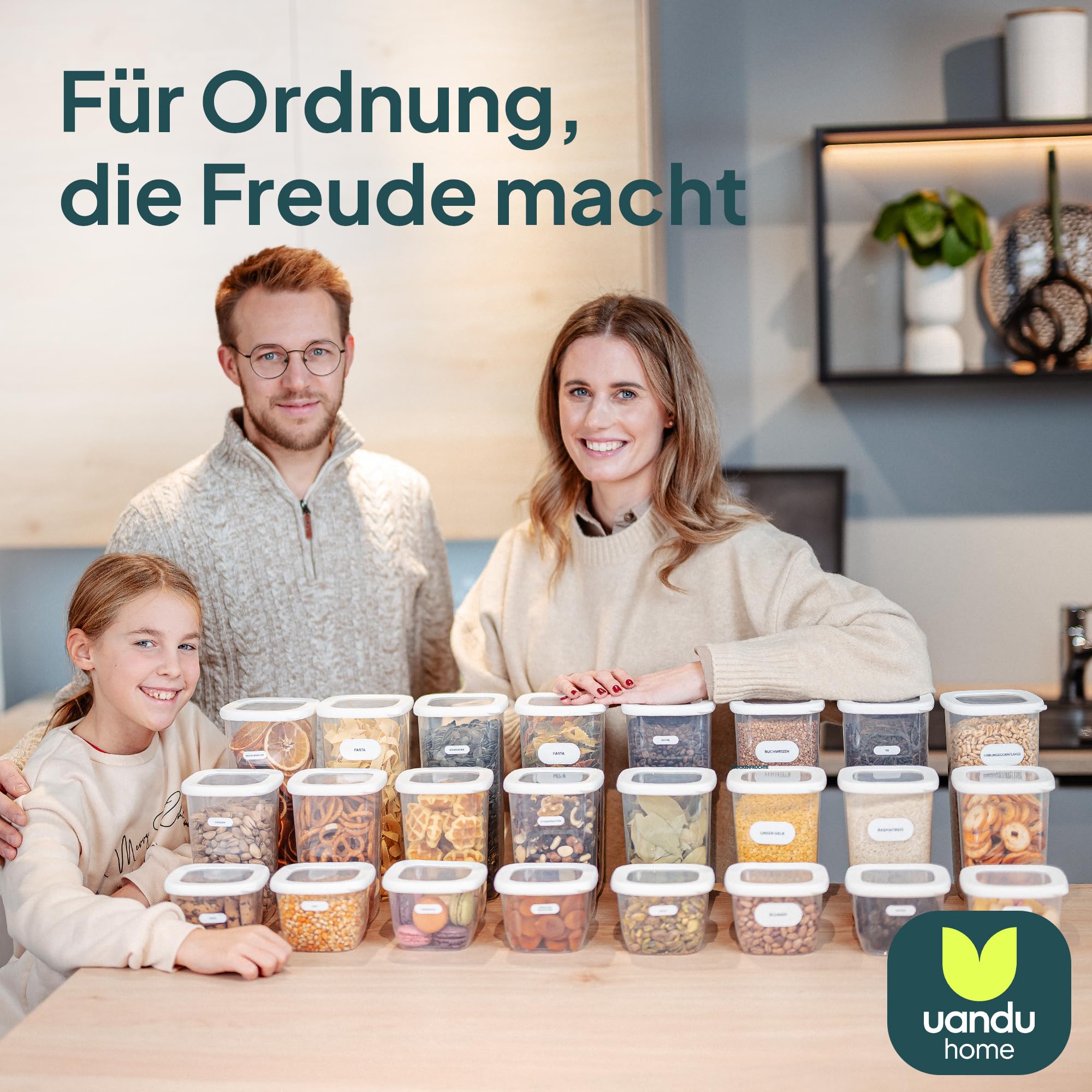 uandu Vorratsdosen mit Deckel luftdicht – 24er Vorratsbehälter Set BPA Frei, Aufbewahrungsdosen Küche für Müsli, Mehl & Zucker, Mit Etiketten