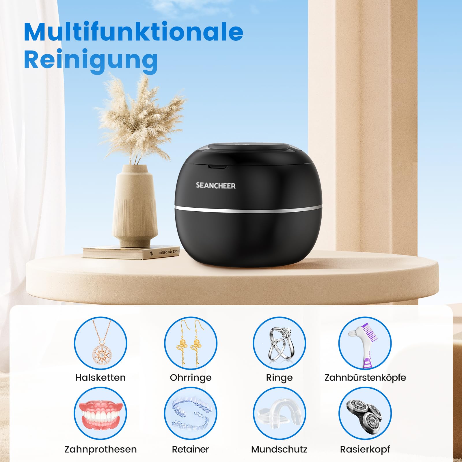 Die Ultraschalltechnologie erzeugt mikroskopisch feine Vibrationen, die Schmutz, Ablagerungen, Fett und Verunreinigungen aus schwer zugänglichen Bereichen entfernen, ohne die Oberflaechen der Gegenstaende zu beschaedigen. Die UV-Funktion traegt zur Desinfektion und Keimreduktion bei und sorgt fuer eine zusätzliche hygienische Sauberkeit.