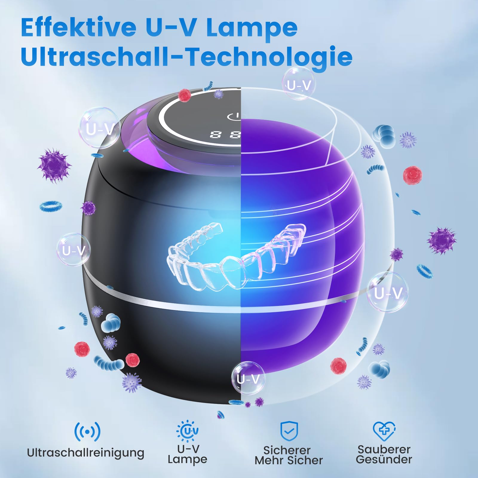 Das Ultraschallreinigungsgeraet 180 ml mit UV Lampe ist die ideale Loesung fuer alle, die eine zuverlaessige, effiziente und hygienische Reinigung fuer ihre Zahnersatzprodukte und Schmuck suchen – leistungsstark, modern und alltagstauglich.