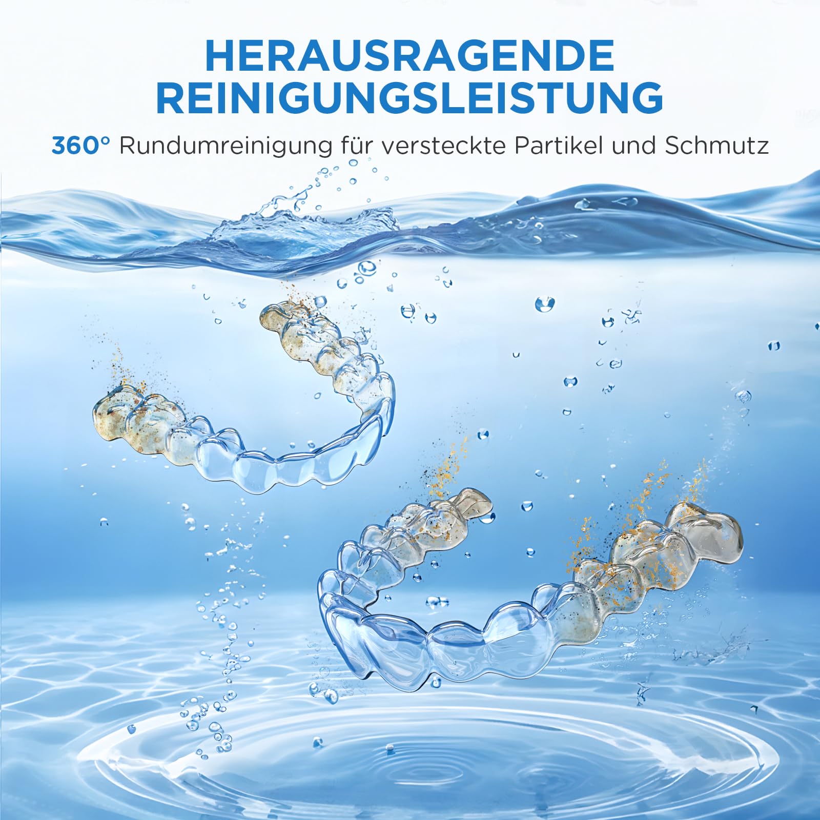 Die hochfrequenten Ultraschallvibrationen loesen Plaque, Ablagerungen, Speisereste und Rueckstaende selbst aus schwer zugaenglichen Bereichen, ohne empfindliche Materialien zu beschaedigen. Die UV-Desinfektion unterstuetzt zusaetzlich die hygienische Sauberkeit, indem sie zur Reduzierung von Keimen und Bakterien beitraegt – ideal fuer Dentalprodukte, die taeglich im Mund verwendet werden.