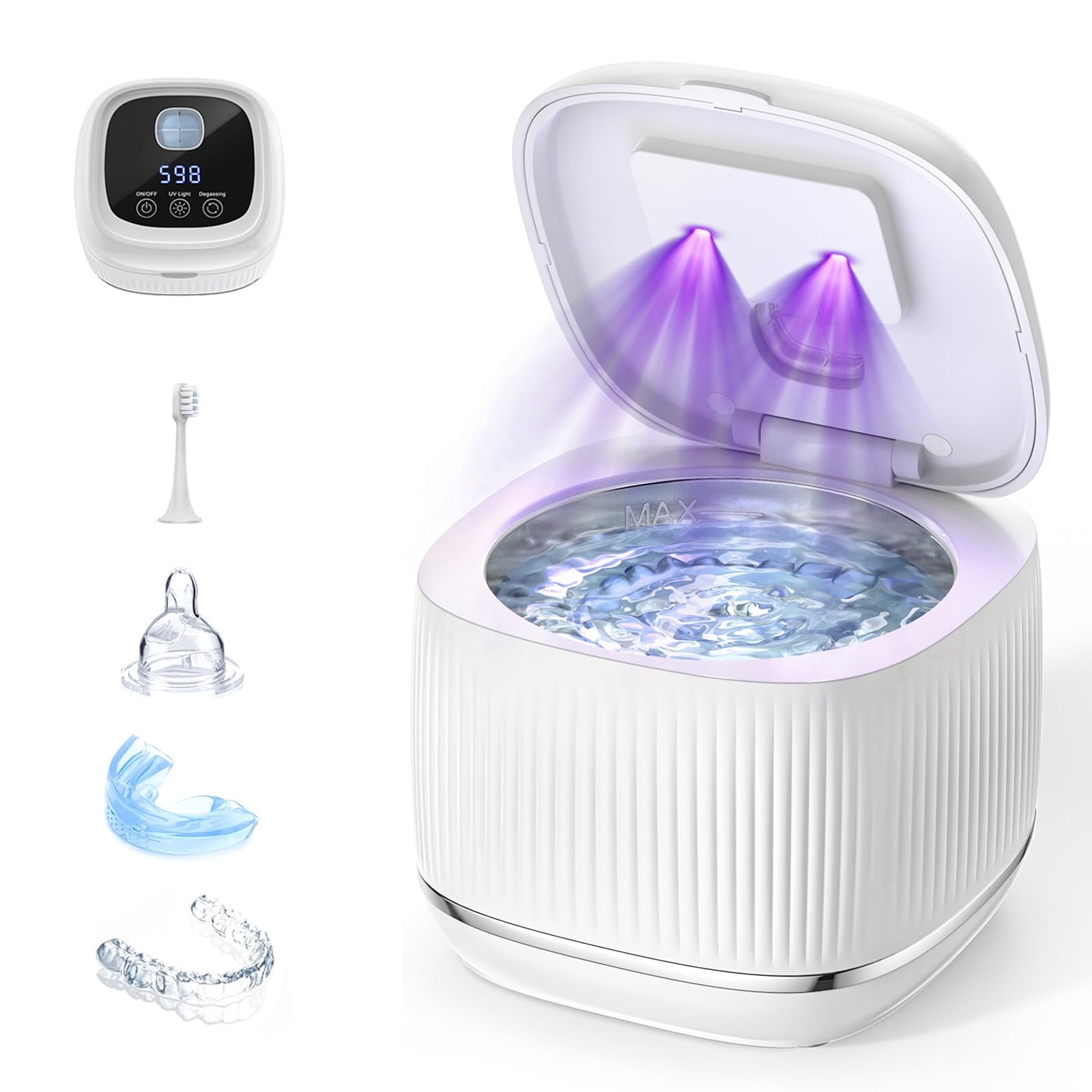 4 PROFESSIONELLE REINIGUNGSMODI: Vier frei waehlbare Programme – UV-Desinfektion, Ultraschall-Schnellreinigung, Ultraschall mit Entgasung sowie Intensivreinigung mit Entgasung und Desinfektion. Geeignet fuer Zahnprothesen, Zahnspangen, Schmuck, Make-up-Pinsel, Schnuller und vieles mehr.