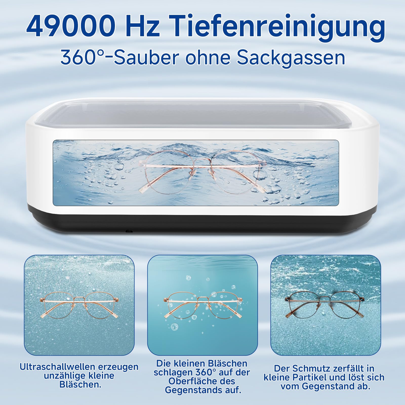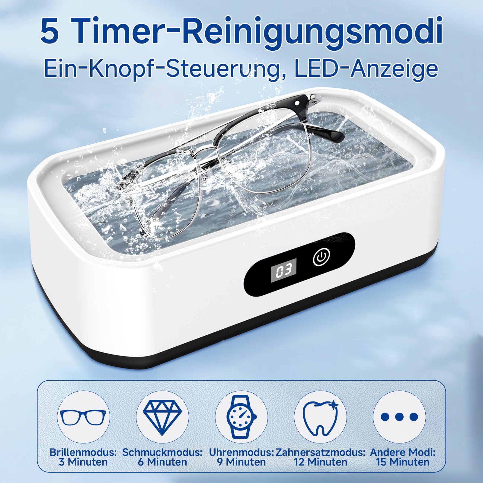 Die moderne Ultraschalltechnologie erzeugt hochfrequente Mikrovibrationen, die Verunreinigungen gleichmaessig und effektiv loesen und empfindliche Oberflaechen schuetzen. Dadurch eignet sich das Brillenreinigungsgeraet ideal fuer Brillen, Uhren, Ringe, Rasierklingen sowie weitere filigrane Gegenstaende des taeglichen Gebrauchs.