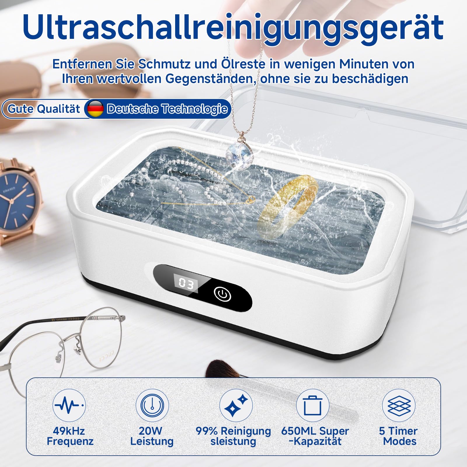 Das Ultraschallreinigungsgeraet 650 ml mit 49.000 Hz ist die ideale Wahl fuer alle, die eine effiziente, schonende und professionelle Ultraschallreinigung fuer Brillen und Wertgegenstaende suchen – leistungsstark, komfortabel und alltagstauglich.