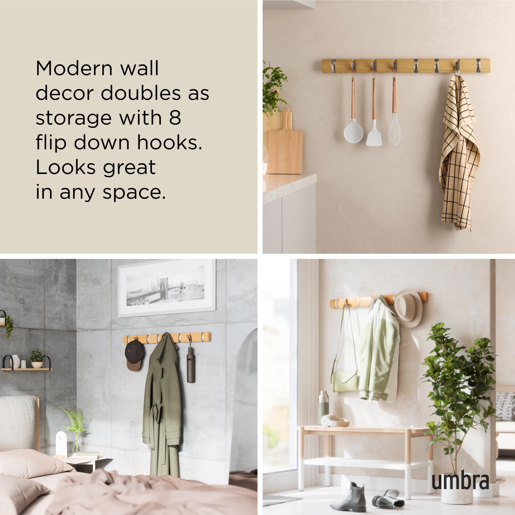 Umbra Flip 8 Garderobenhaken – Moderne, Schlichte und Platzsparende Garderobenleiste mit 8 Beweglichen Haken für Jacken, Mäntel, Schals, Handtaschen und Mehr, Natur/Nickel