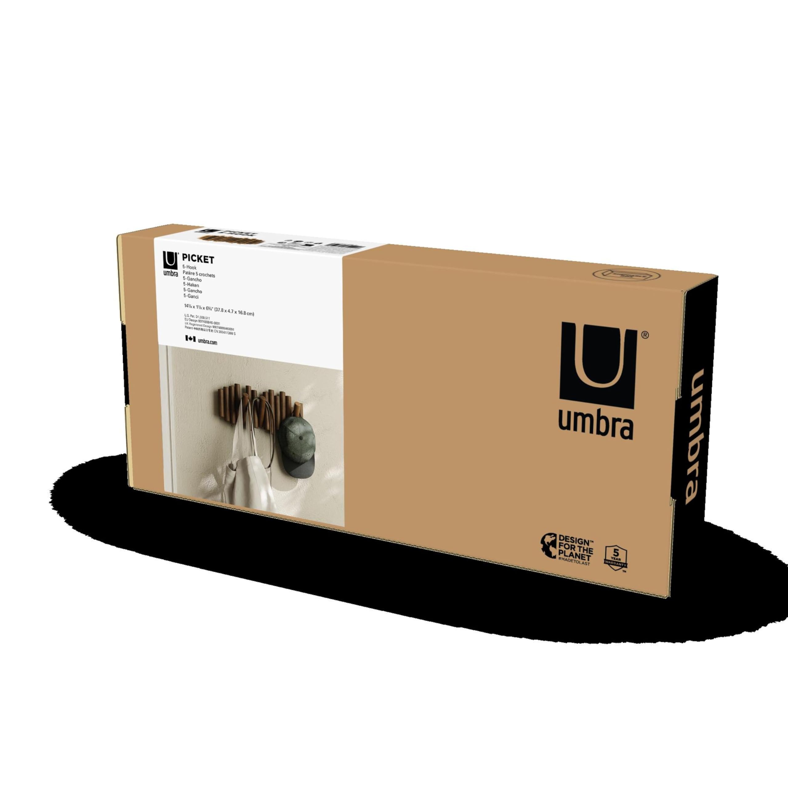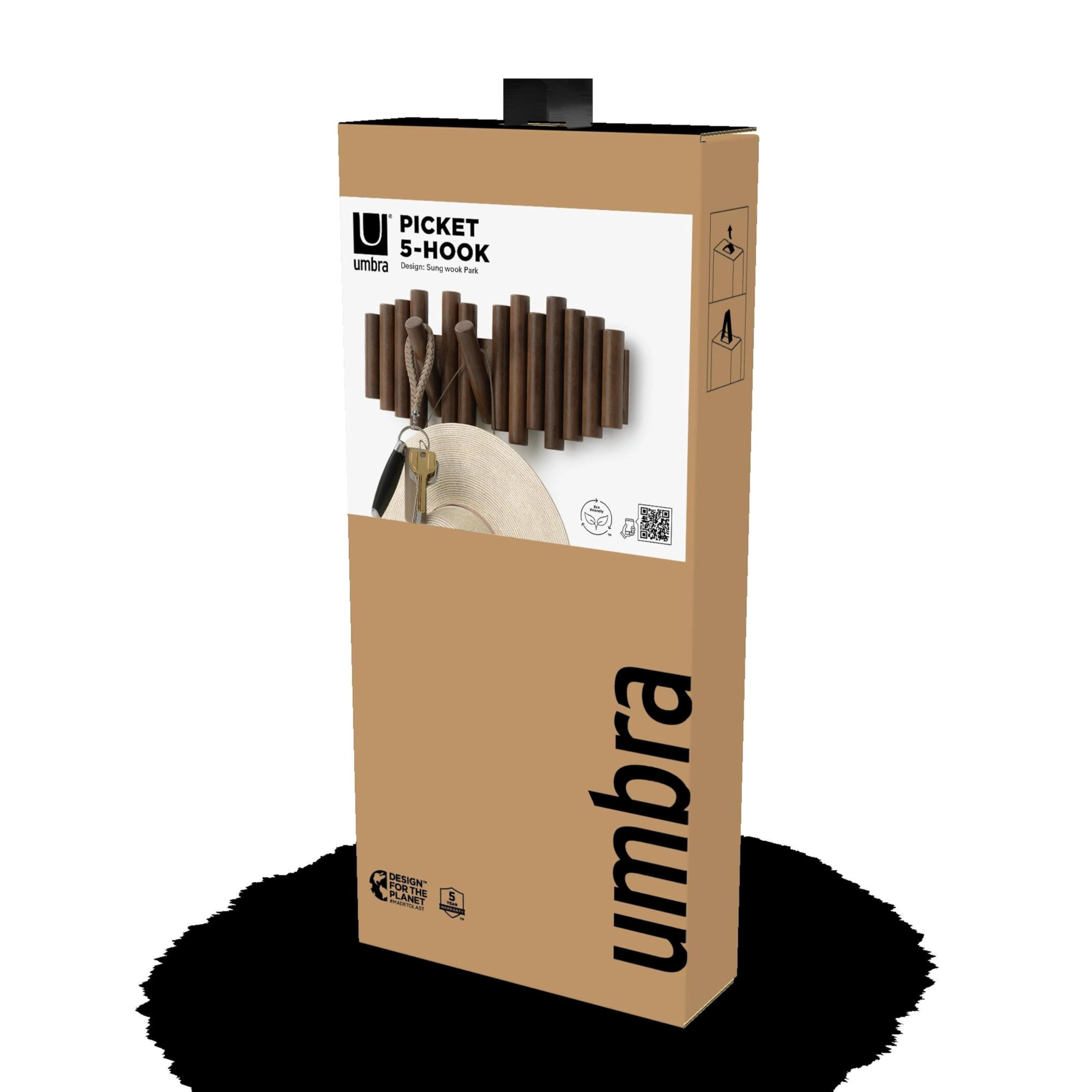 Umbra Picket Garderobenhaken - Garderobenleiste und Moderne Wand Dekoration mit 5 Klapphaken aus geschliffenem Kiefernholz, Walnuss