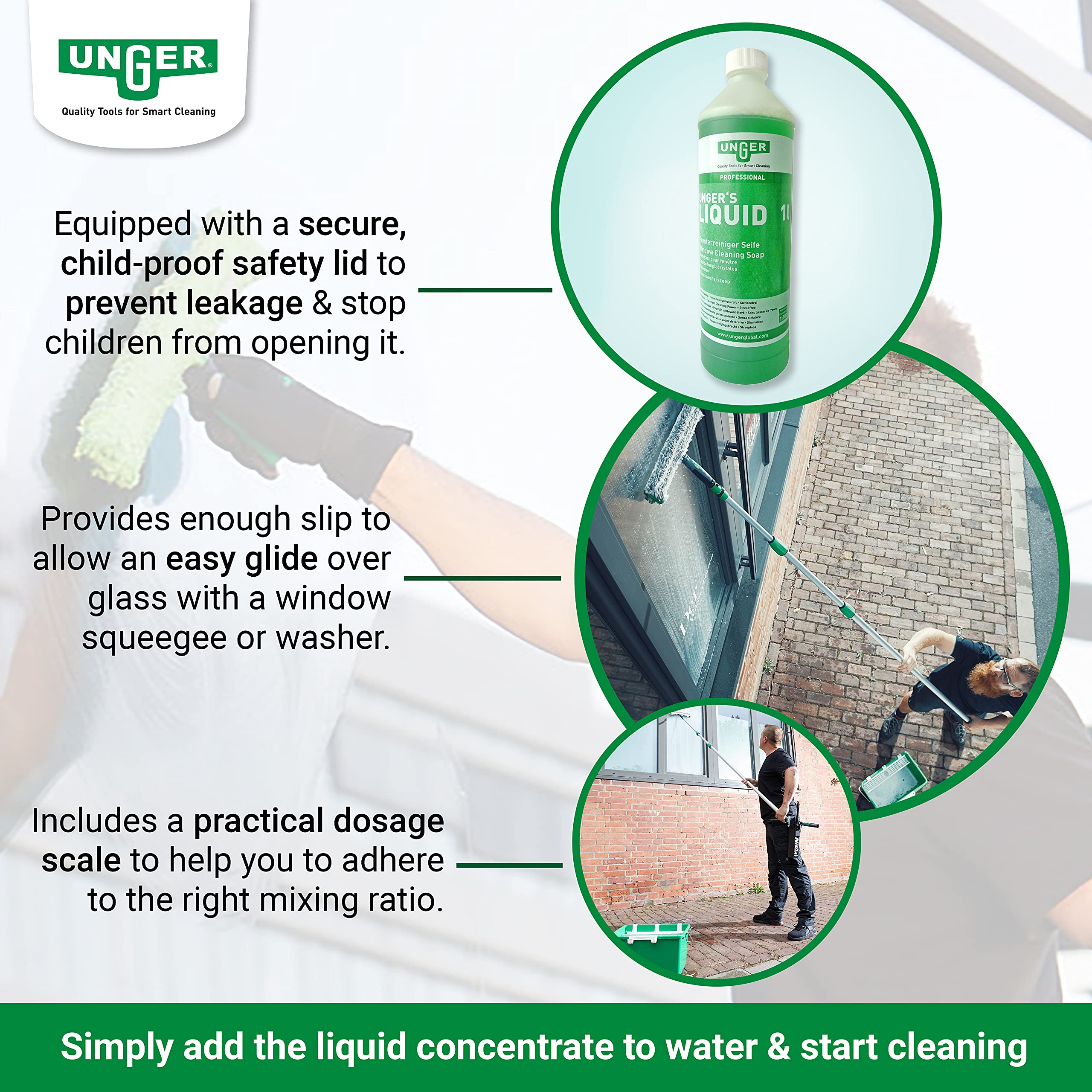 UNGER Glasreiniger UNGER’s Liquid (1 Liter, Konzentrat, Mischverhältnis 1:100, pH-neutral, streifenfreie Fenster, Sicherheitsverschluss, Dosierungs-Skala) FR100