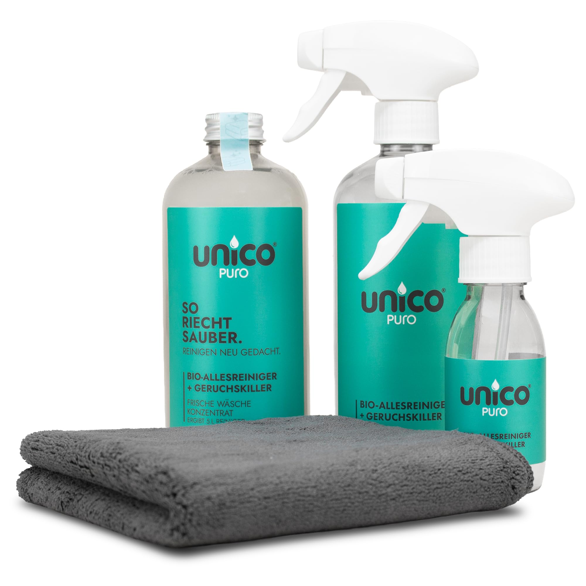 unicopuro® Allesreiniger Starter-Set Frische Wäsche – 500 ml Konzentrat = 5 L – inkl. 500 ml & 100 ml Sprühflaschen + Soft-Touch Microfasertuch – biologisch abbaubar, Geruchskiller, in 7 Düften