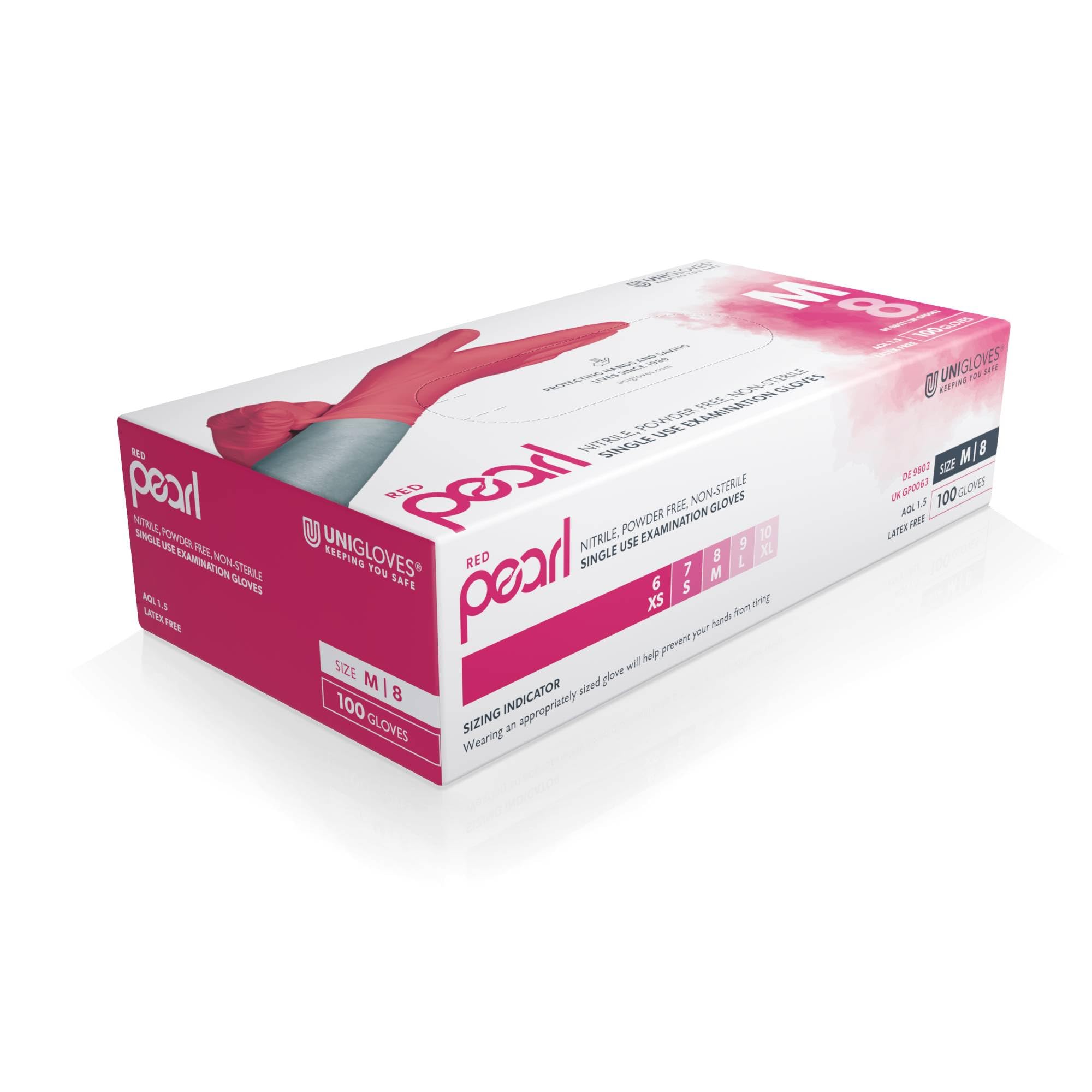 UNIGLOVES Red Pearl Nitril-Untersuchungshandschuhe - vielseitig einsetzbar, puderfreie und latexfreie Einweghandschuhe - Box mit 100 Handschuhen, Rot, Mittel (GP0063)