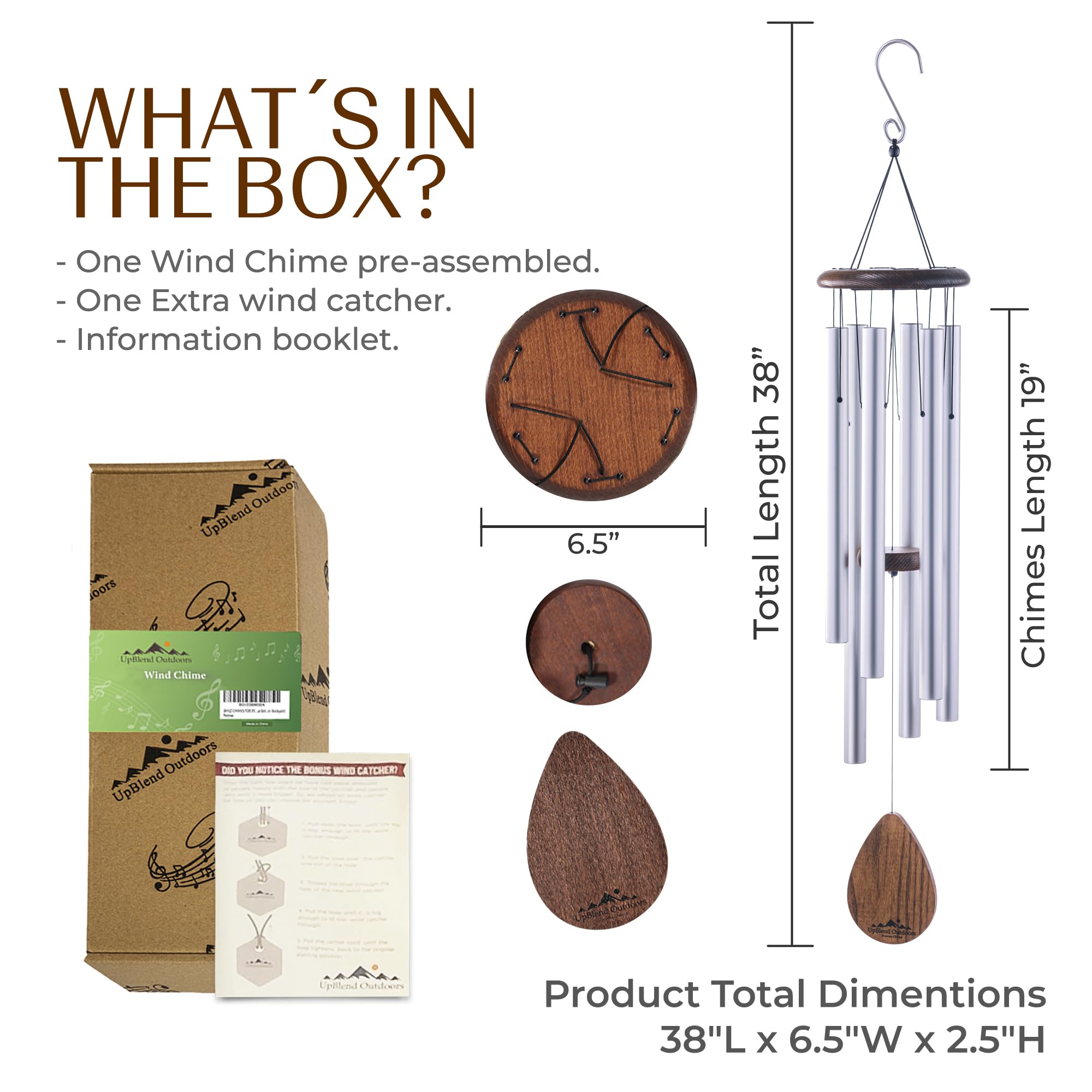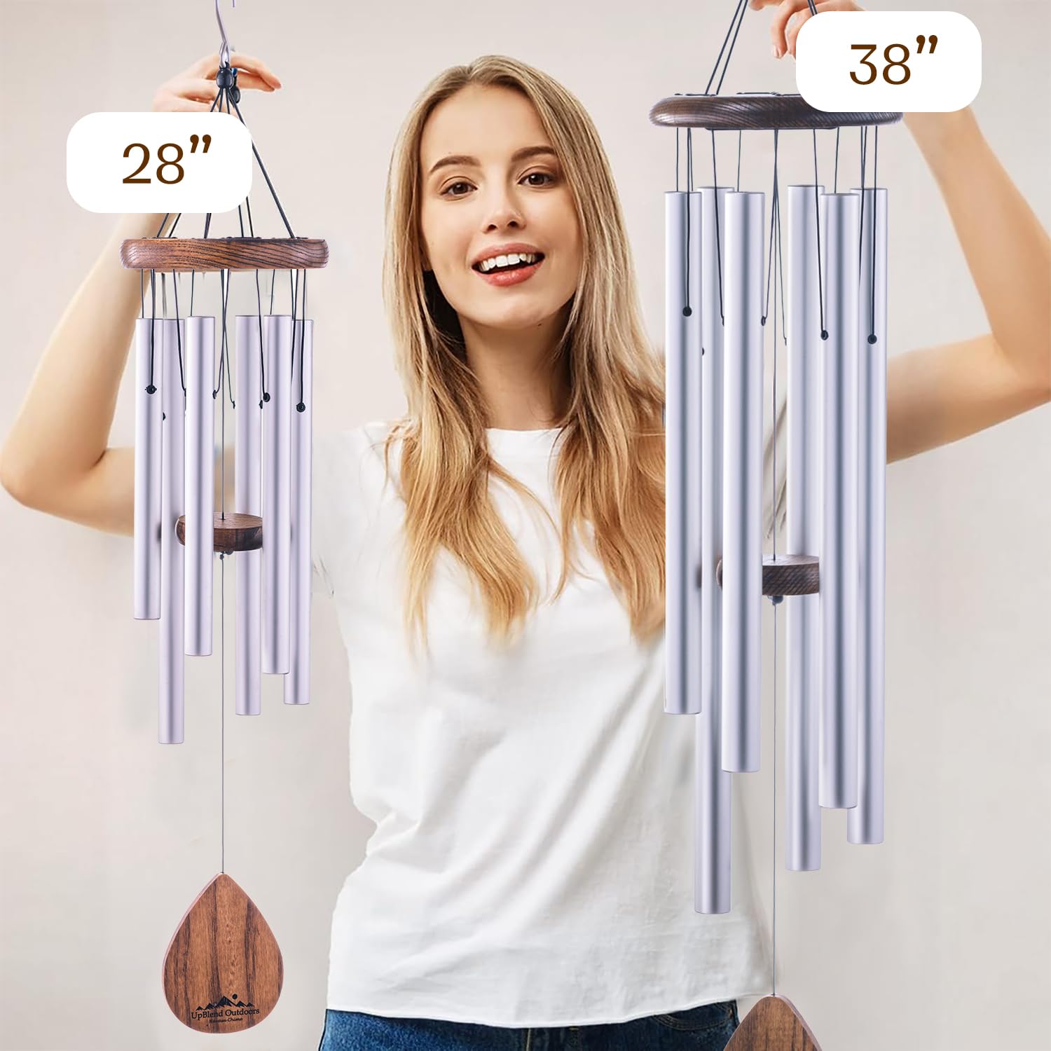 UpBlend Outdoors Large Wind Chime - The Classic Silver Havasu is 38” Total Length - Hand-Tuned and Beautiful as a Gift or for Your Patio, Garden, and Outdoor Home décor