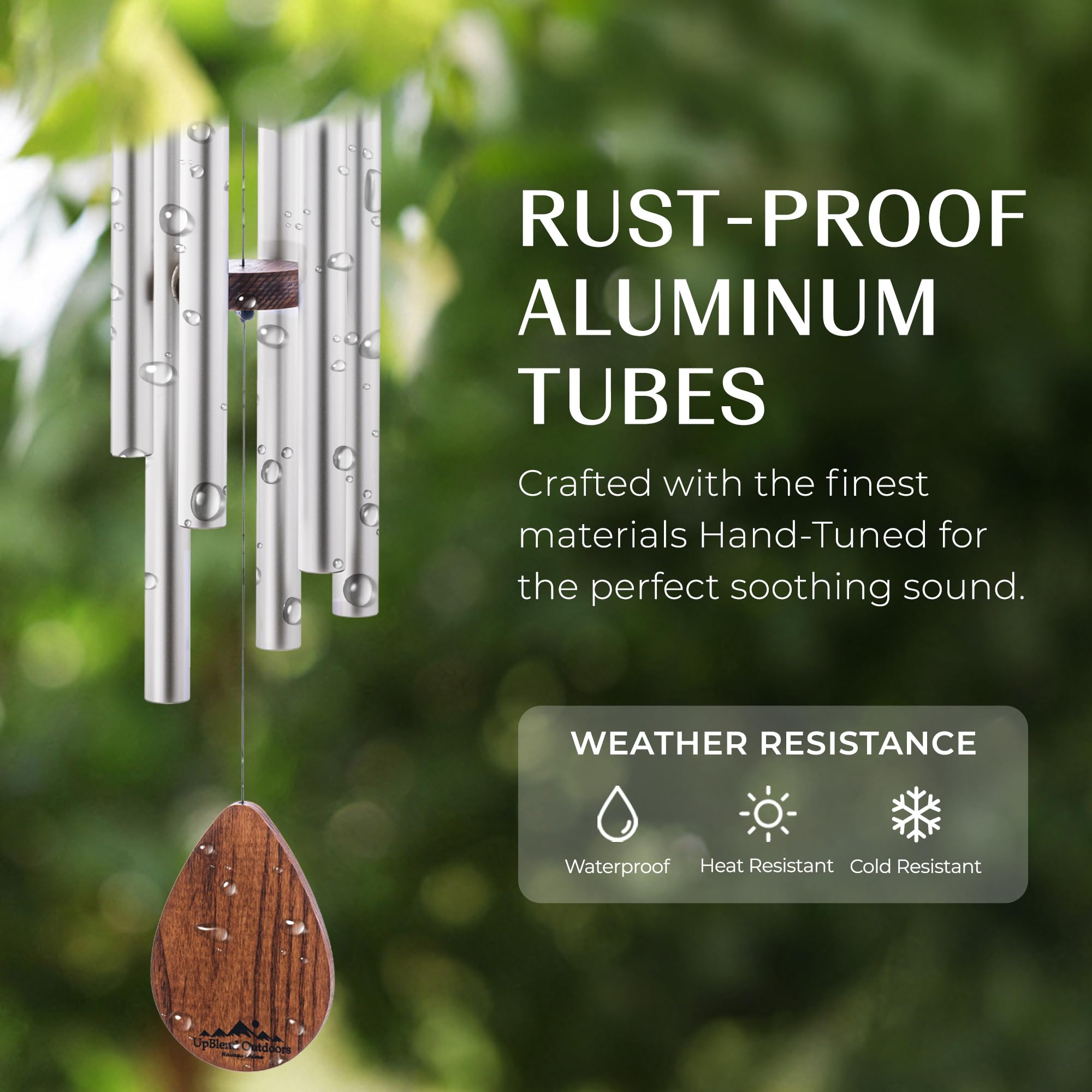Wash away the stresses of your day with the beautiful harmony of the UpBlend Outdoors Havasu Chime. Carefully hand-tuned in E-major as a pentatonic scale and tested to perfection, the Havasu chime generates rich yet soft melodies that are sure to inspire, calm, and relax.