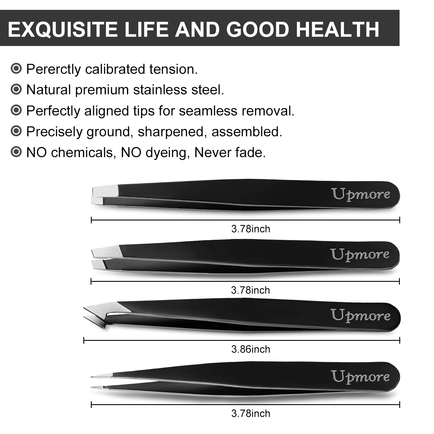 Upmore 4x Pinzette Set Edelstahl - Schwarz Augenbrauenpinzette Set Schere Pinzette, Gerade Schräge Spitze Zupfpinzette Splitterpinzette Spitzpinzette für Frauen und Männer