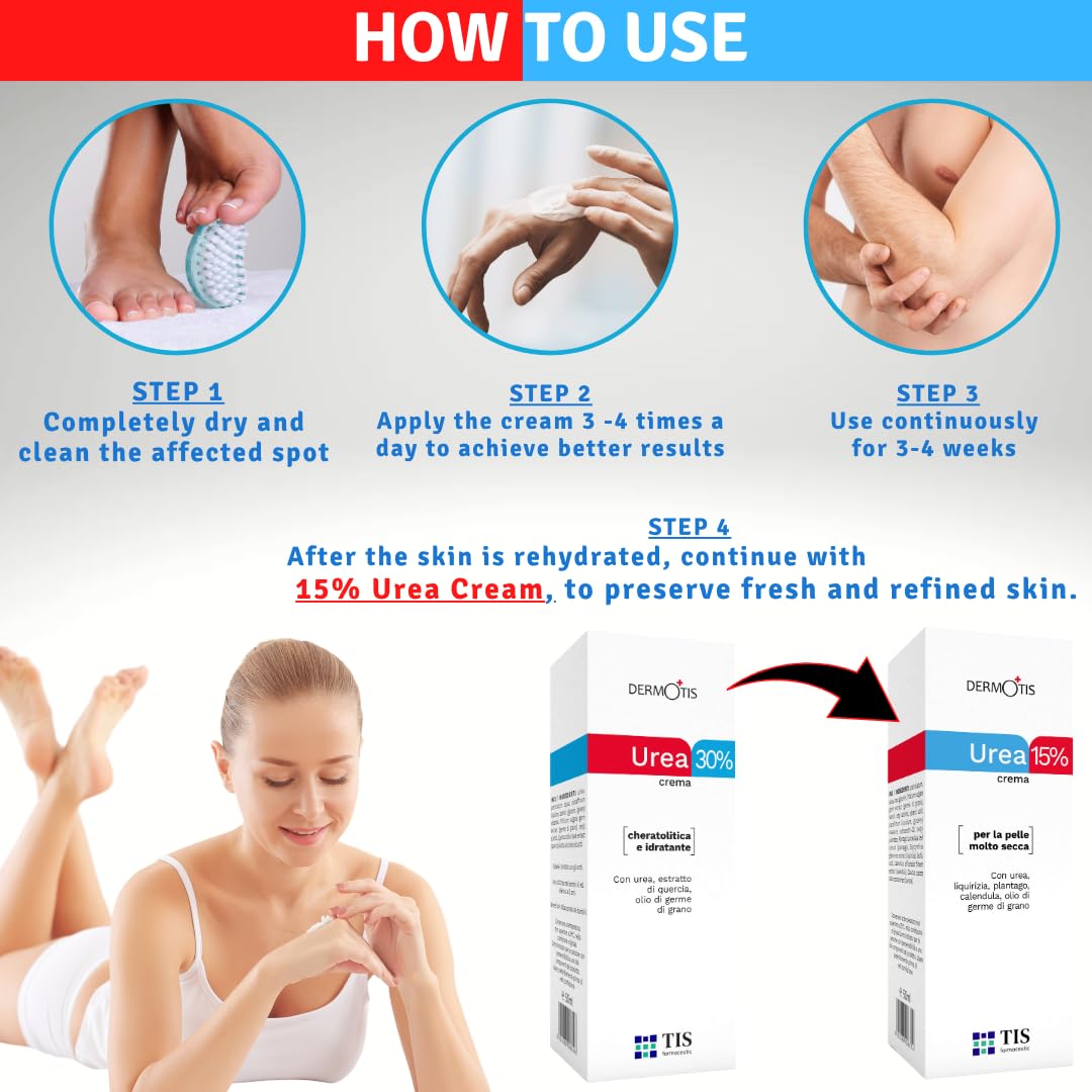 - Hoher Urea-Anteil (30%): Spendet intensive Feuchtigkeit und unterstützt die Haut bei der Regeneration.
