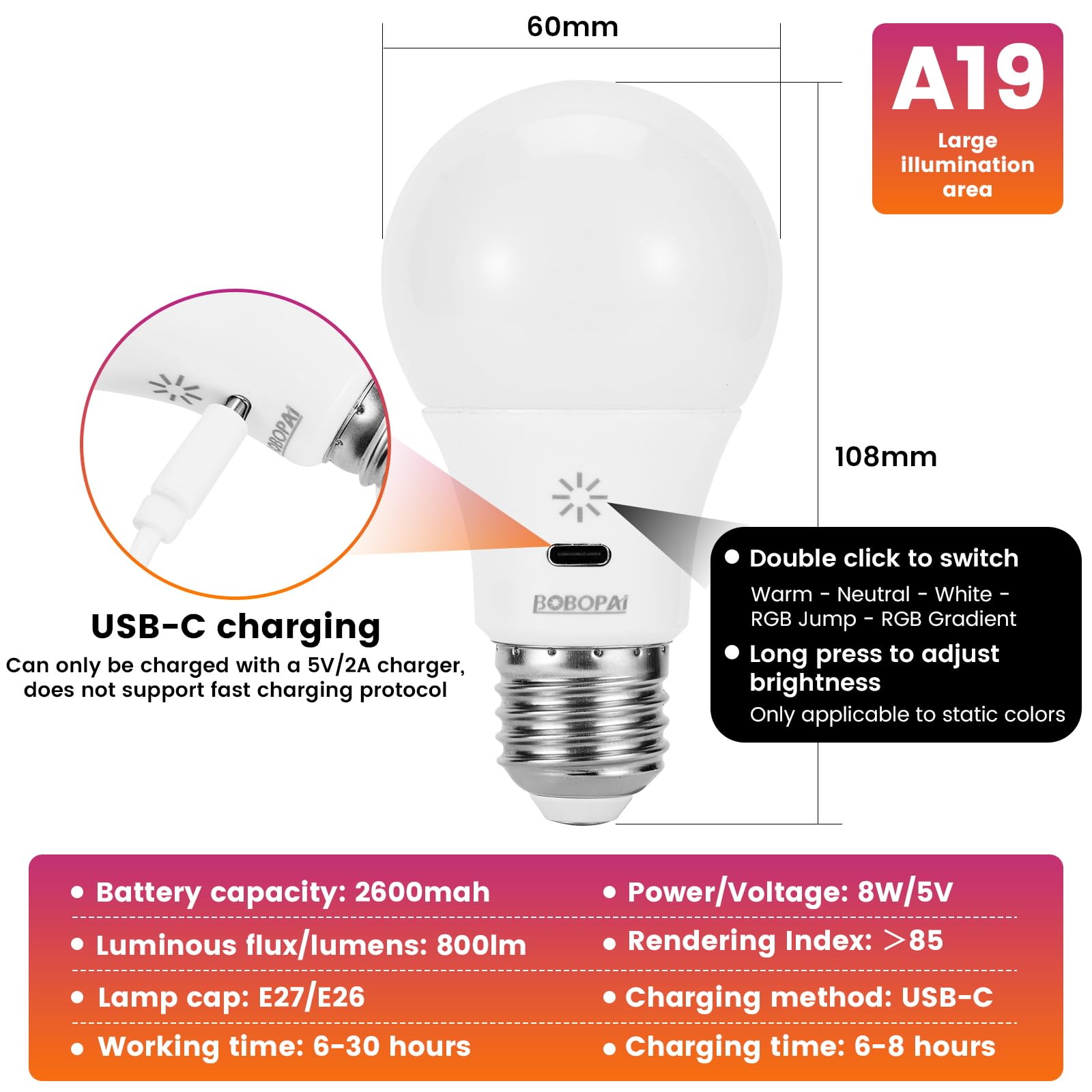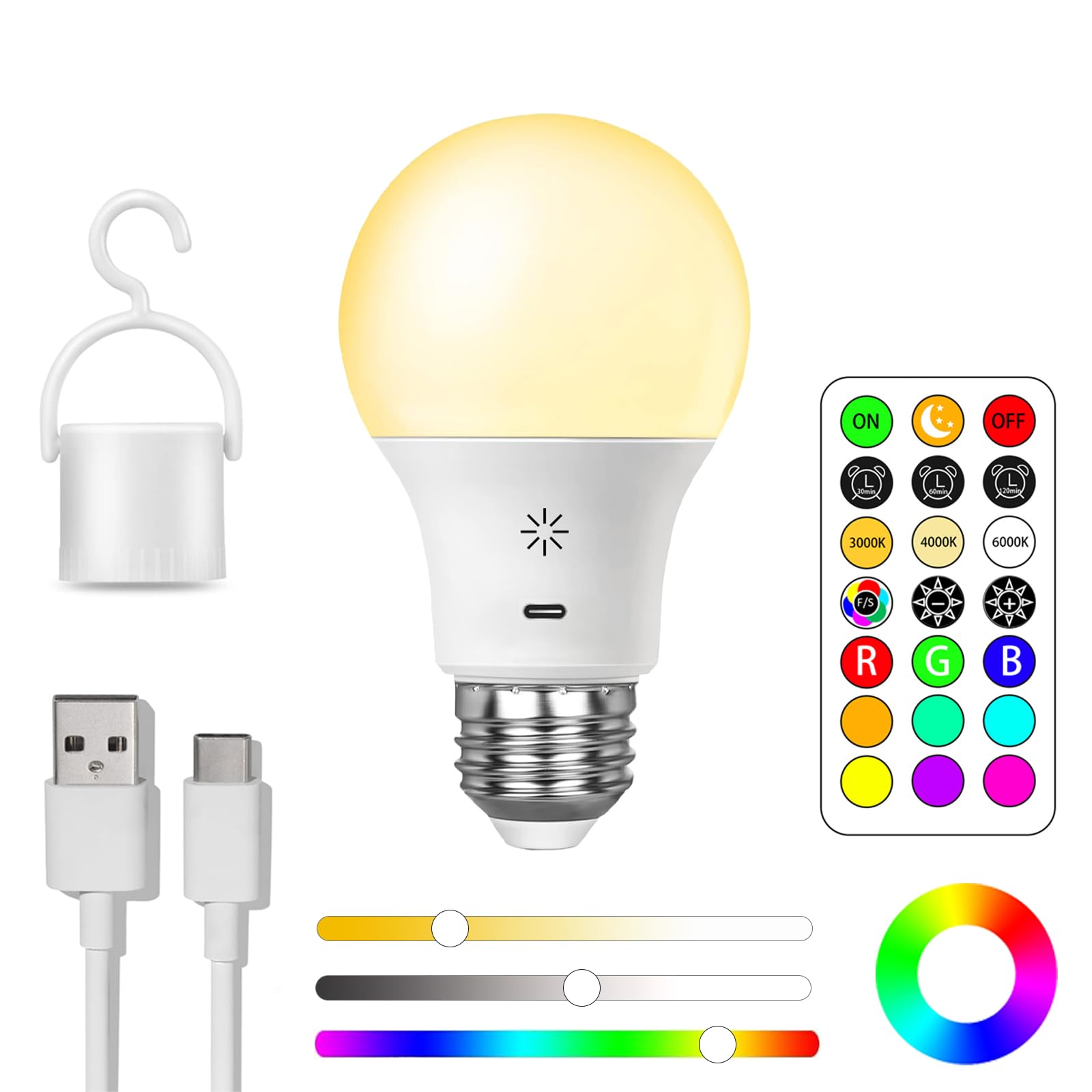 USB Aufladbar Batterie Glühbirne Mit Fernbedienung, E27 Smart Farbwechsel Farbige RGB Glühbirnen ,9+3 Farbtemperatur, 8W LED Dimmbare Touch Control Akku Lampe Mit Timing Funktion, 2600mAh ,1 pack