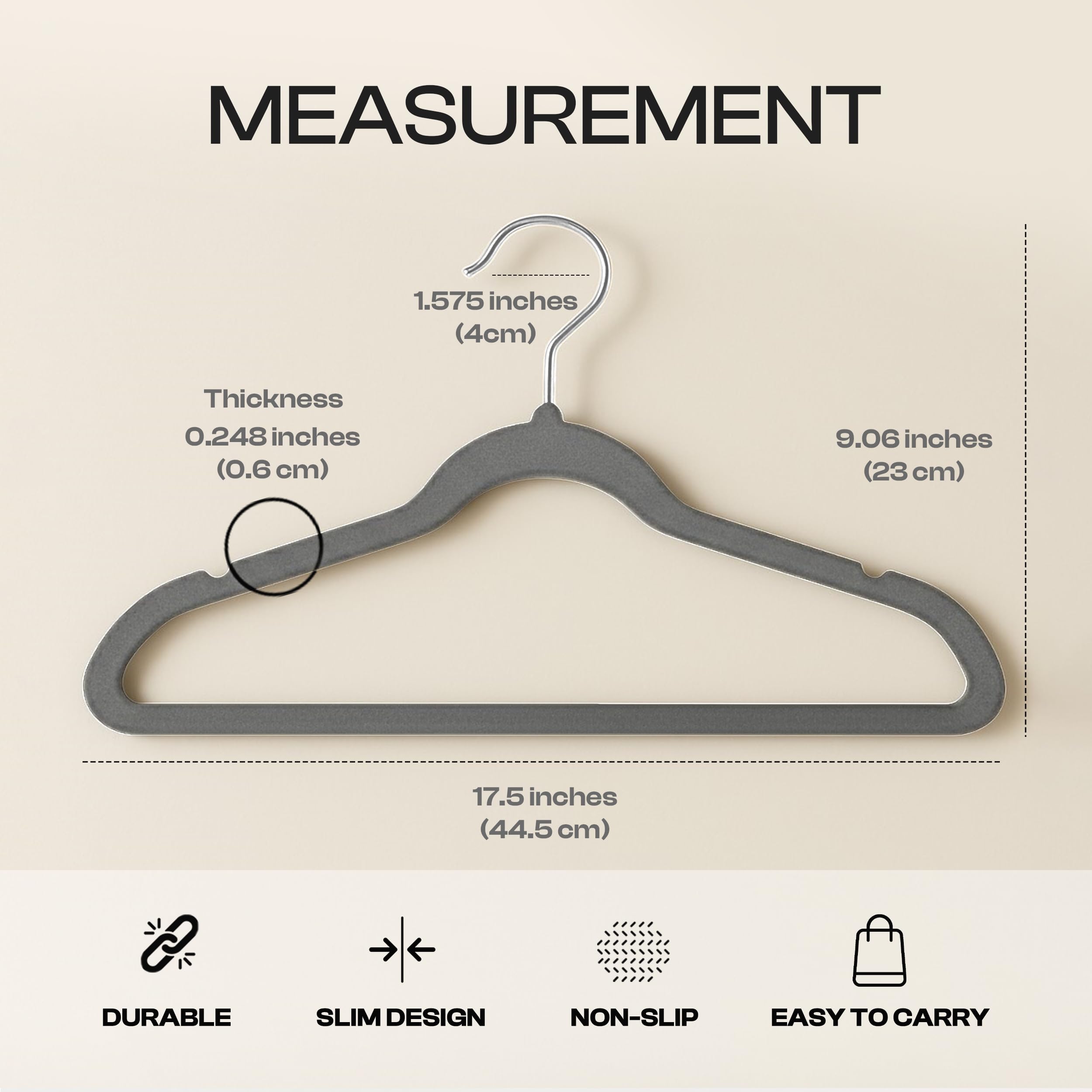 Hängen Sie alles von zarten Blusen bis hin zu unseren schwarzen Samt-Kleiderbügeln auf. Diese Samt-Kleiderbügel sind nicht nur langlebig und leicht, sondern verfügen auch über eine rutschfeste Eigenschaft, die Kleidung an Ort und Stelle hält, ohne herunterzufallen oder durchzuhängen. Das schlanke Design der Kleiderbügel ermöglicht es Ihnen, den Platz in Ihrem Schrank zu maximieren. Holen Sie sich einen ordentlichen, organisierten Schrank mit diesen hochwertigen, einheitlichen schwarzen Samt-Kleiderbügeln. 360-Grad-Drehung für eine bessere Nutzung. Die Haken dieser Samt-Kleiderbügel sind robust gestaltet und um 360 Grad drehbar, um eine grosse Benutzerfreundlichkeit zu bieten. Es ermöglicht Ihnen, den Haken nach Bedarf leicht zu drehen, um Ihre Garderobe auf kompetente Weise zu verwalten.
