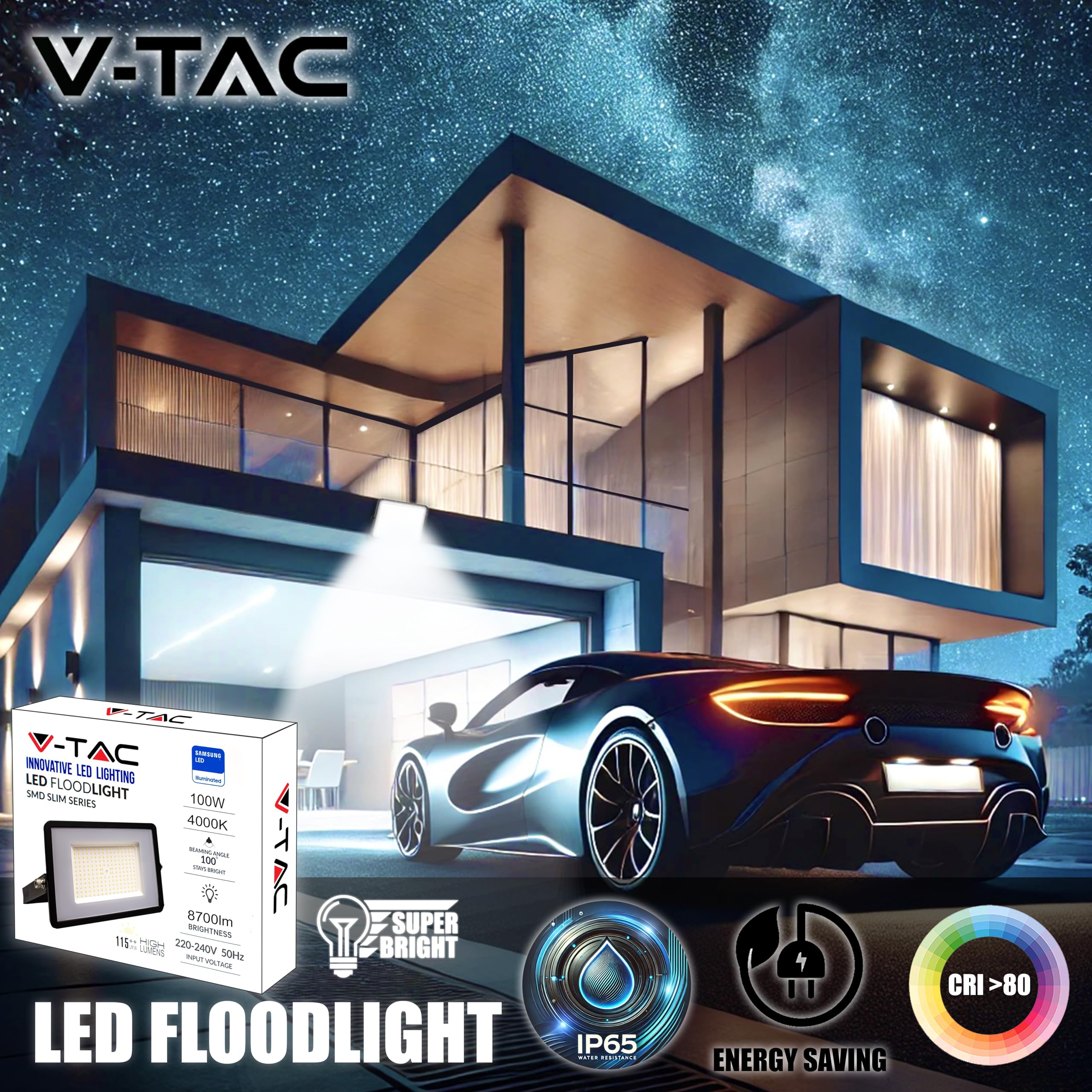 V-TAC LED-Aussenstrahler 100 W – [High Performance] – IP65 – 8700 Lumen – Lampe wasserdicht für Haus, Garten, Garage, Fabrik – Licht Neutralweiss 4000 K