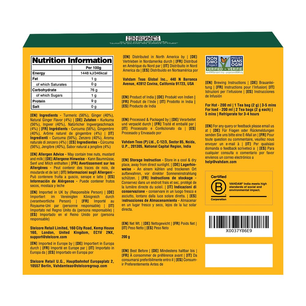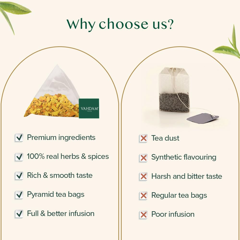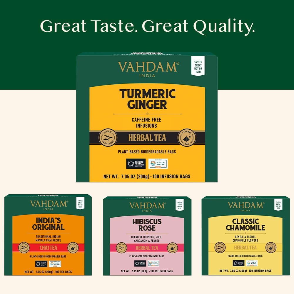 VAHDAM, Turmeric Ginger Kräutertee Beutel (100 Teebeutel) Koffeinfrei | Kurkuma & Gartenfrischen Gewürzen | Verpackt in Indien | Brühen Sie Heiss, Eis oder Kombucha Tee