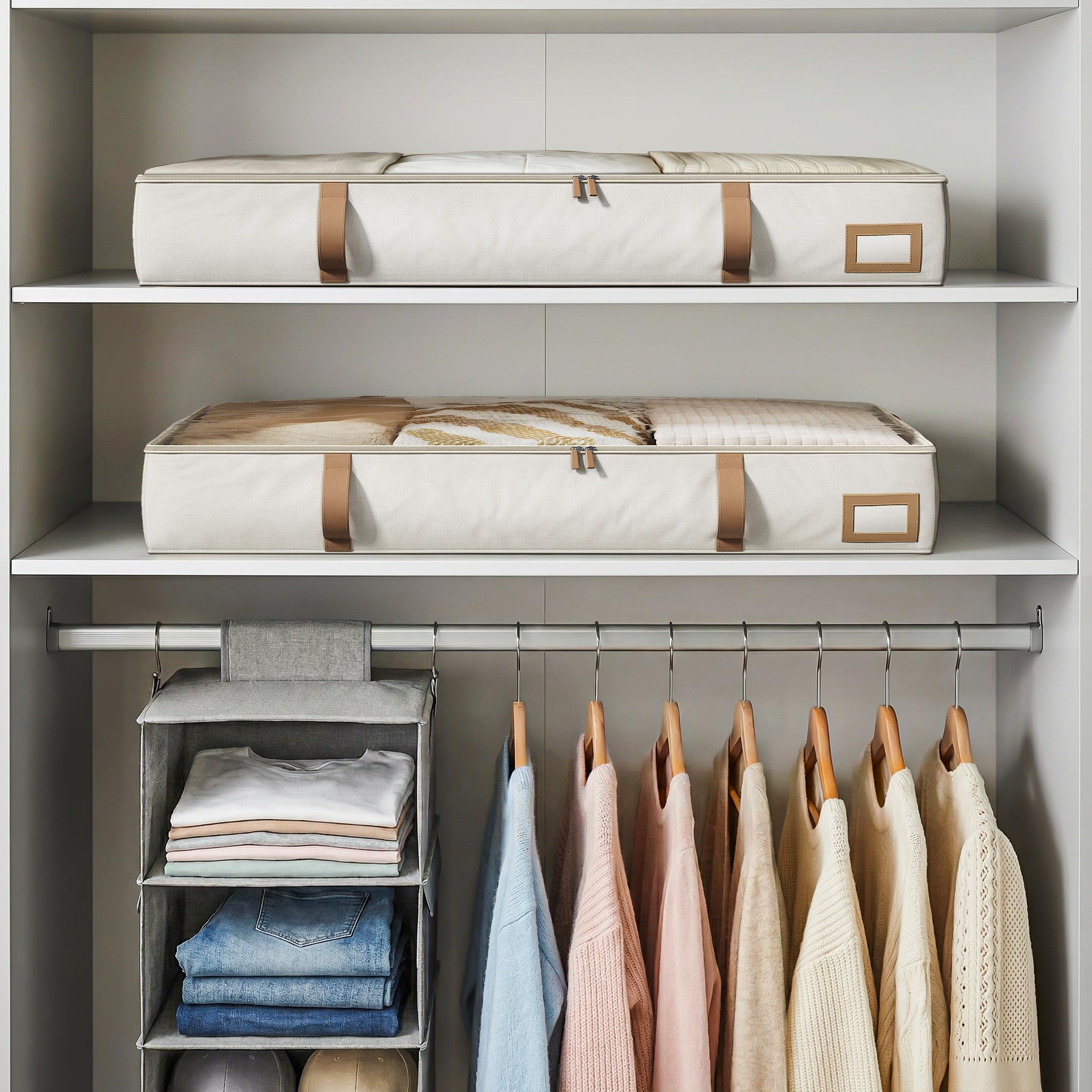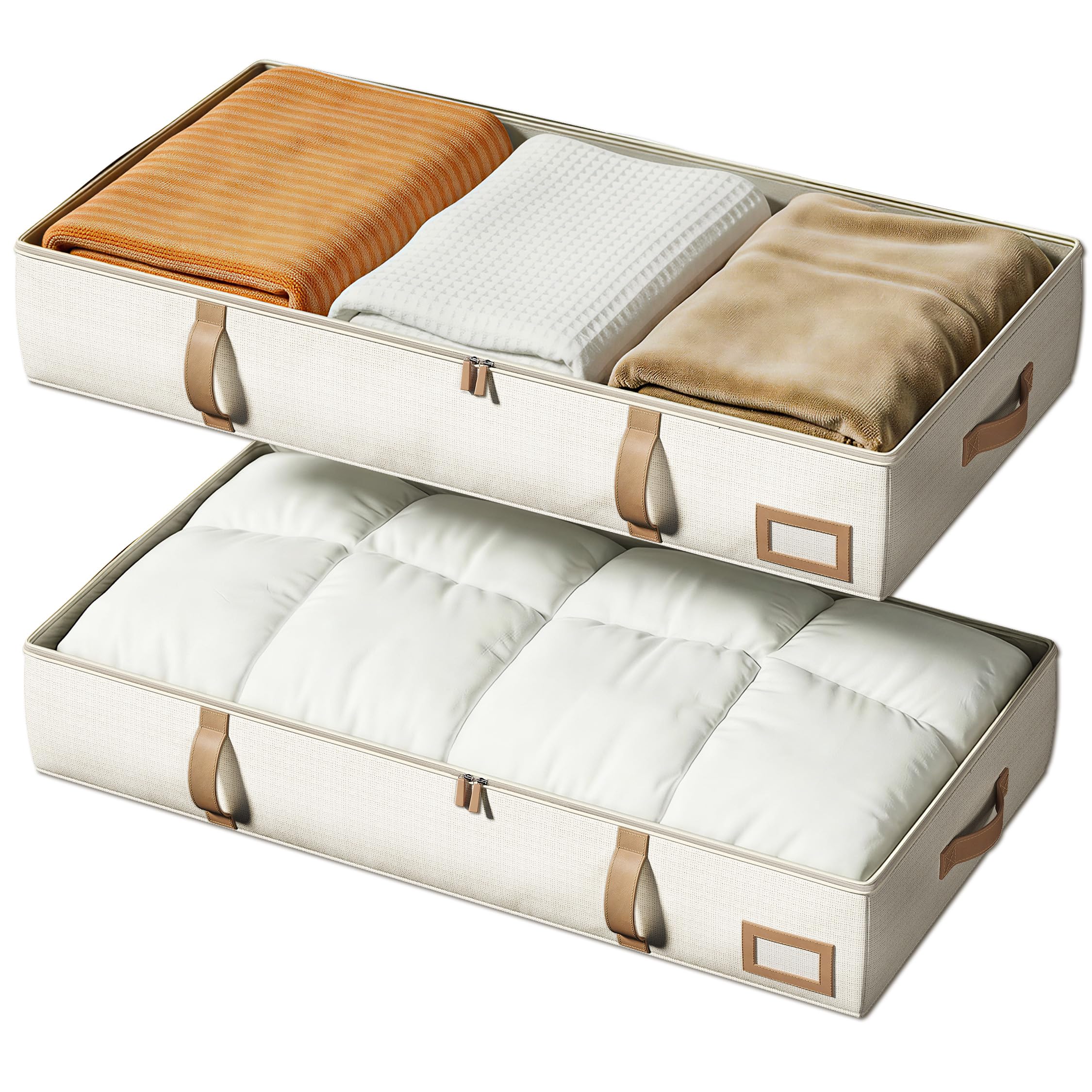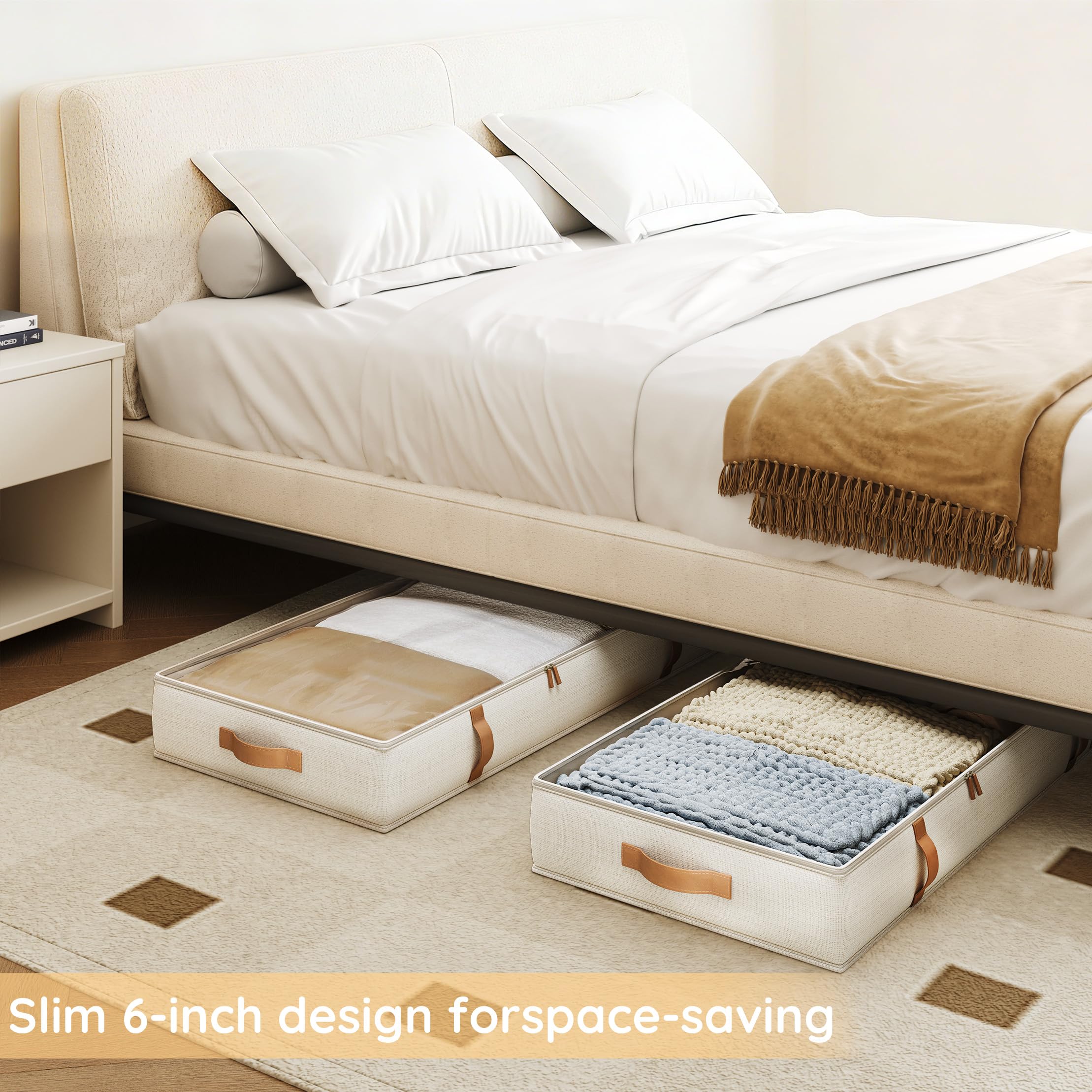 Vailando Unterbett-Aufbewahrungsbehälter, faltbare Aufbewahrungsbehälter für Decken, Bettdecke und saisonale Kleidung, 15,2 cm hoch, Beige mit braunen Ledergriffen, 2 Stück