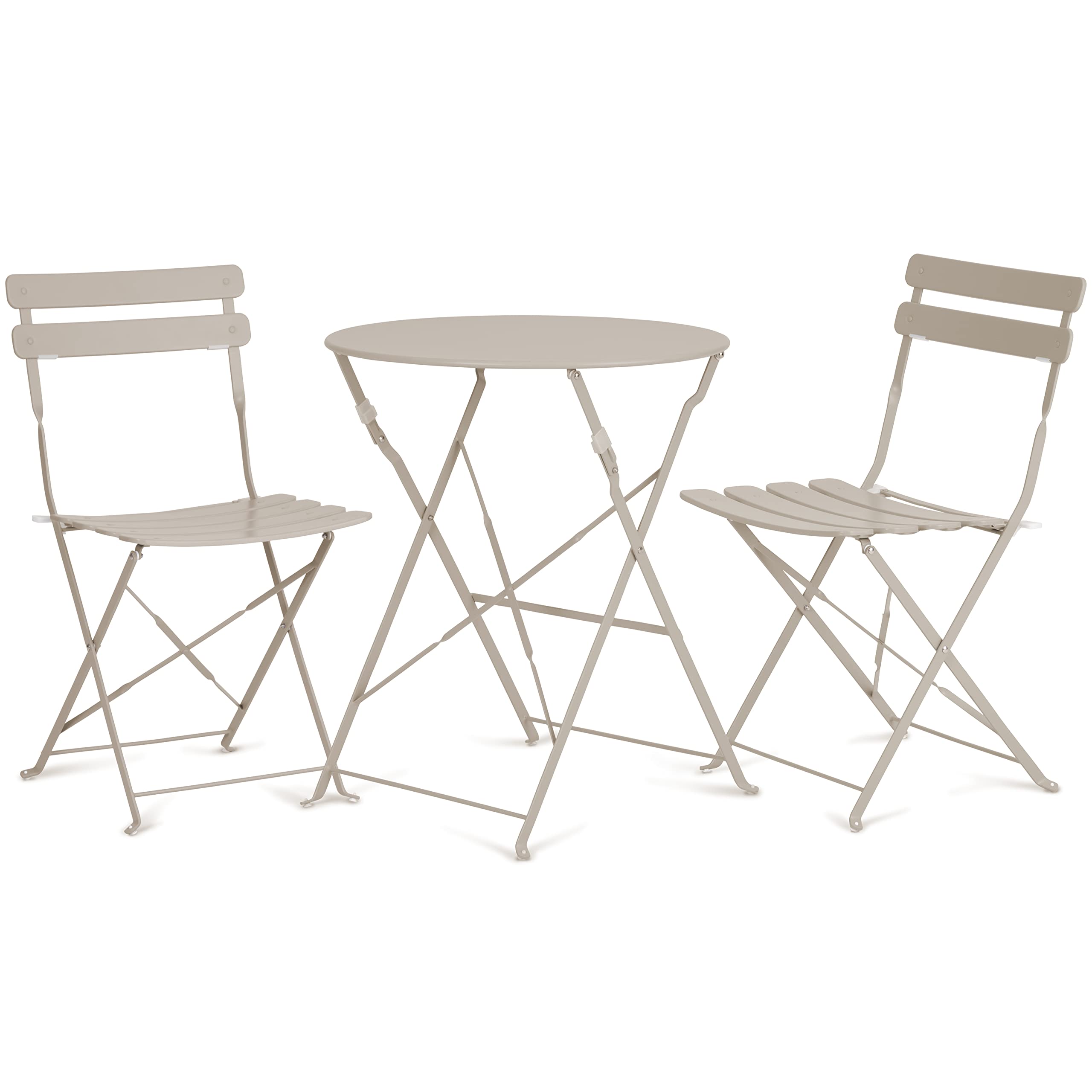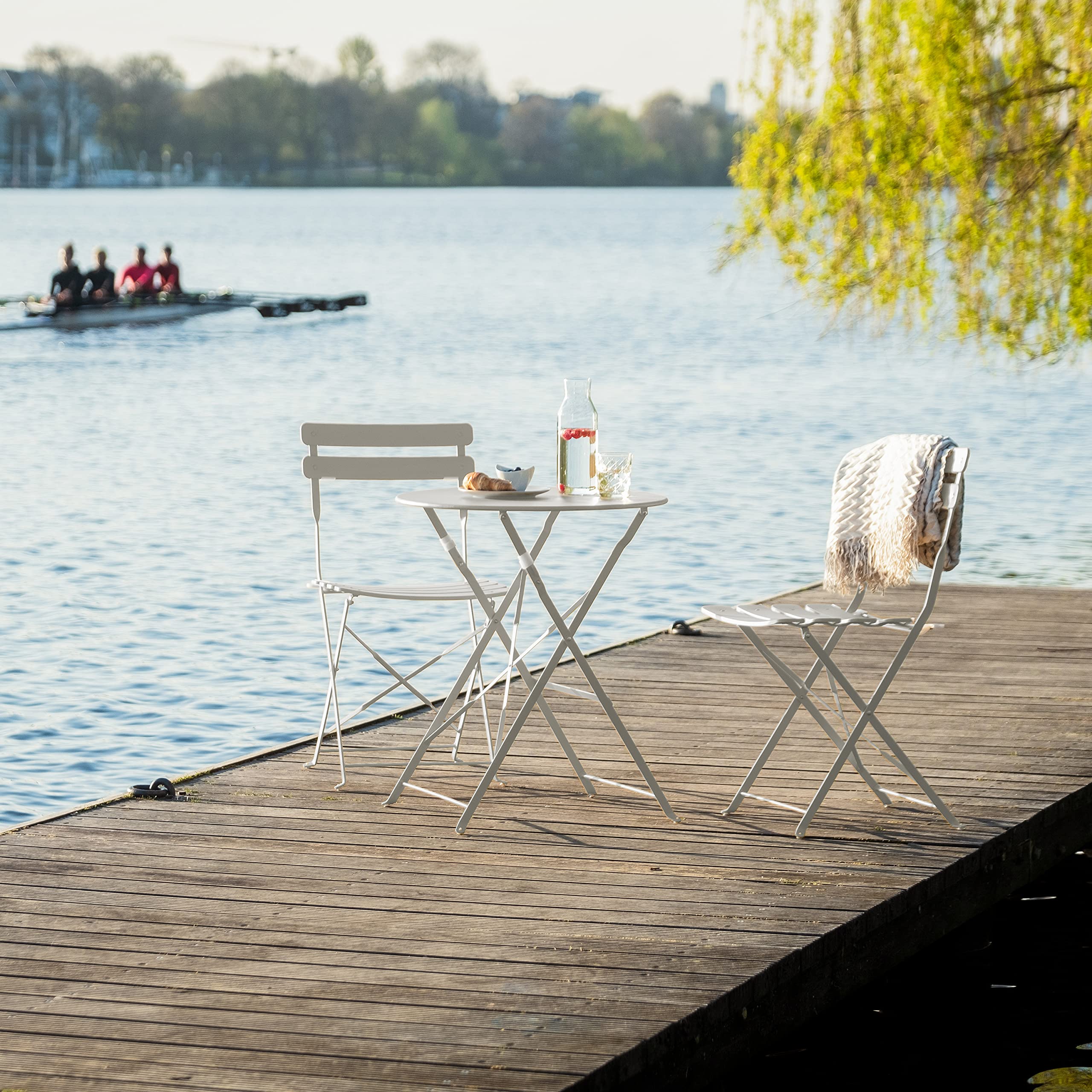 Ein bisschen Frankreich für jeden Garten und Balkon! Das Bistro Set von Vanage besteht aus einem Bistrotisch und zwei Bistrostühlen. Das moderne, schlicht gehaltene Design ist ein absoluter Hingucker und sorgt für einmaliges französisches Ambiente auf Ihrem Balkon. Die leicht gebogene Sitzfläche bietet einen hohen Sitzkomfort und lädt zum Verweilen ein. Die robuste Stahl-Konstruktion und der Sicherheitshaken, den man nach dem Aufbau einrasten kann, ren Stabilität und verhindern ein unerwünschtes zusammenklappen bei Gebrauch. Die Ecken der Sitzfläche sind abgerundet und bieten zusätzlich Sicherheit. Das Set ist in fünf trendigen Farben erhältlich und lädt zum Entspannen ein. Sollten Sie das Set einmal für längere Zeit nicht Nutzen wollen oder Einwintern, können Sie die Möbel ganz einfach zusammenklappen und somit viel Platz sparen.