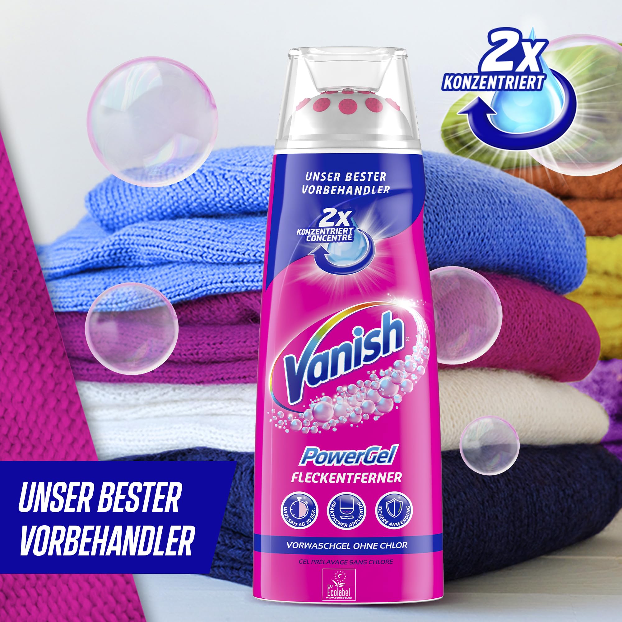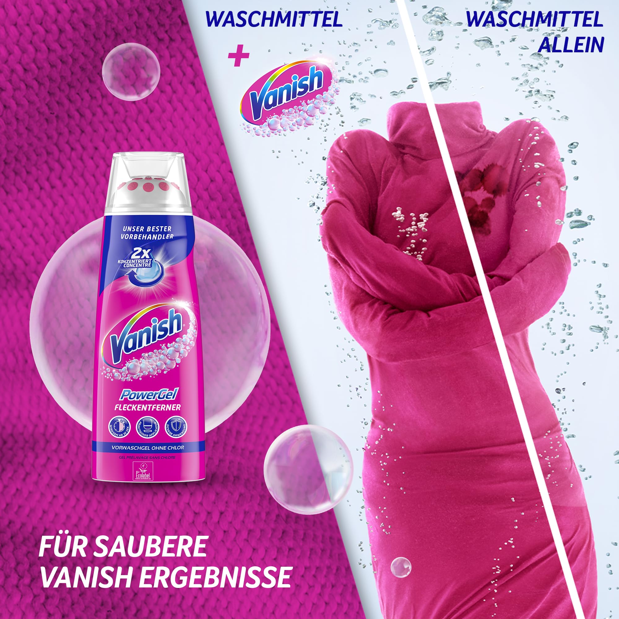 Vanish GOLD Oxi Action PowerGelDas Vanish GOLD PowerGel entfernt hartnäckige Flecken. Dank des Massagekopfs lässt sich das Gel punktuell einarbeiten und ist speziell beider Entfernung von Schmutzrändern auf Hemdkragen und Manschetten hilfreich. Anwendungshinweise1. Das Vanish Powergel auf den Fleck geben2. Mit dem praktischen Massagekopf sanft einmassieren3. 1-5 Minuten einwirken lassen4. Anschliessend wie gewohnt waschenTipps zur Fleckentfernung: Fleck nicht eintrocknen lassen. Je länger der Fleck im Stoff bleibt, desto schwieriger wird es, ihn zu entfernen. Damitdie weisse Wäsche länger weiss bleibt, zu jeder Waschladung Vanish Oxi Action Powerweiss hinzugeben. Bitte immer die Textilpflegehinweise aufdem Kleidungsstück befolgen. Gefährliche Inhaltsstoffe: C12- C14 Pareth-7 Sulfuric acid, C12-14-alkyl (even numbered) esters, sodium salts SicherheitsinformationenGefahr. Verursacht schwere Augenschäden. Darf nicht in die Hände von Kindern gelangen. Ist ärztlicher Rat erforderlich, Verpackung oder Kenn-zeichnungsetikett bereithalten. Augenschutz tragen. Nach Gebrauch Hände gründlich waschen. Bei Kontakt mit den Augen: Einige Minuten langbehutsam mit Wasser spülen. Eventuell vorhandene Kontaktlinsen nach Möglichkeit entfernen. Weiter spülen. Sofort Giftinformationszentrum / Arzt anrufen. Bei Verschlucken: Bei Unwohlsein Giftinformationszentrum / Arzt anrufen. Über VanishIn jeder Wohnung entstehen im Alltag häufig unschöne Flecken - ob auf Kleidungsstücken oder Teppichen. Vanish bietet als führender Expertedie beste Fleckenentfernungslösung für jede Situation und stellt Produkte her, mit denen man beinahe jeden sichtbaren Fleck beseitigen kann -sogar hartnäckige, eingetrocknete und alte Flecken. Vanish hilft in jedem Haushalt und schafft mehr Zeit für die schönen Dinge im Leben.
