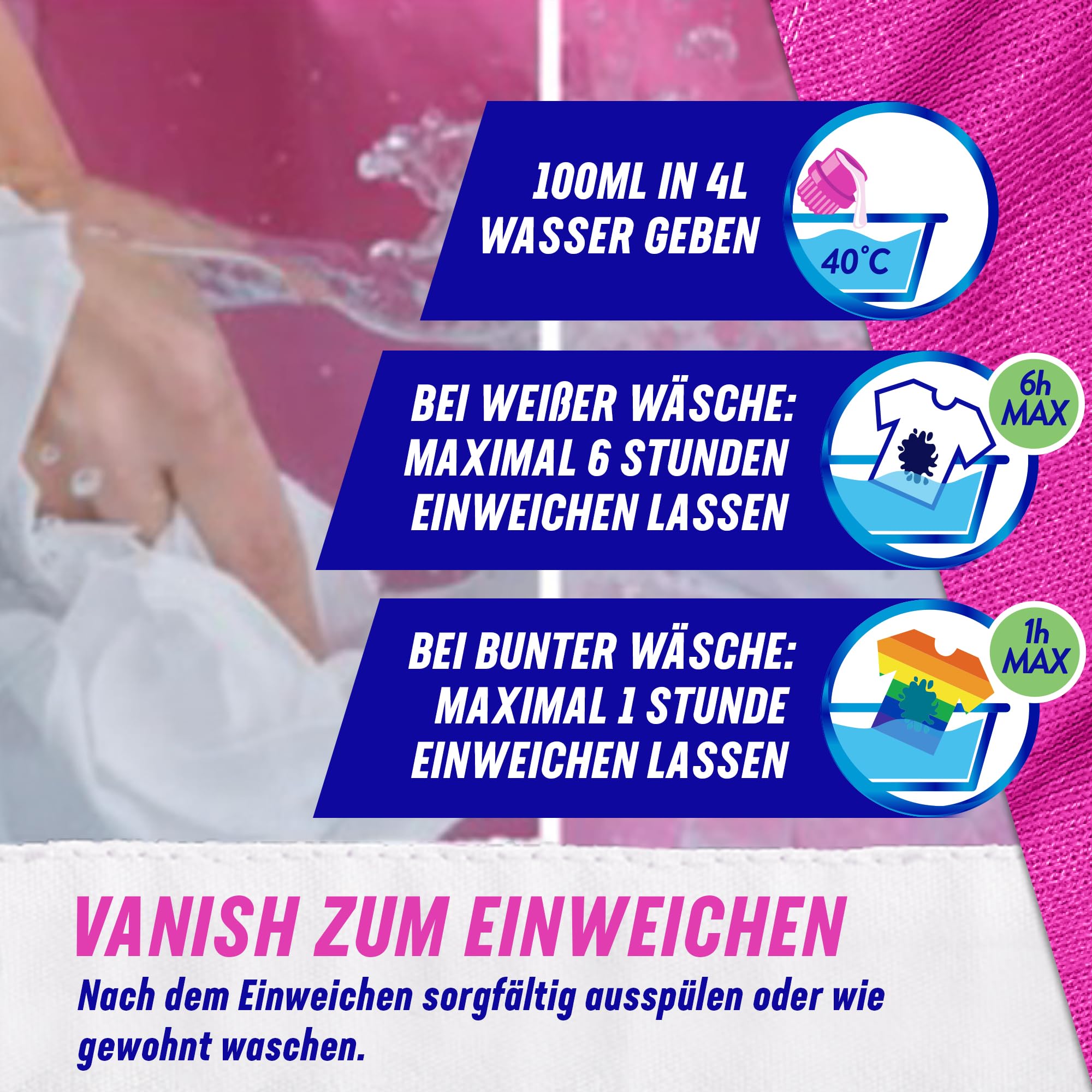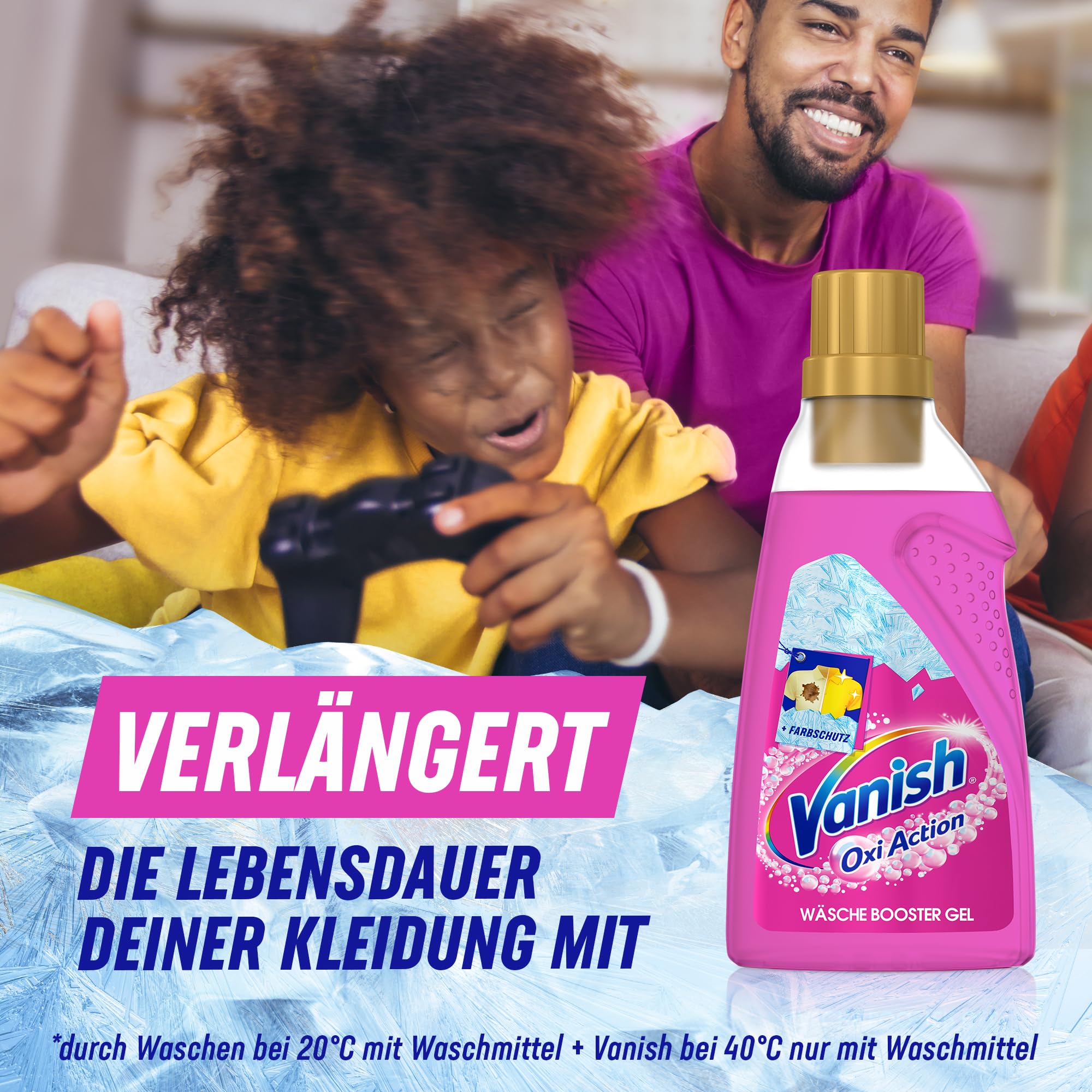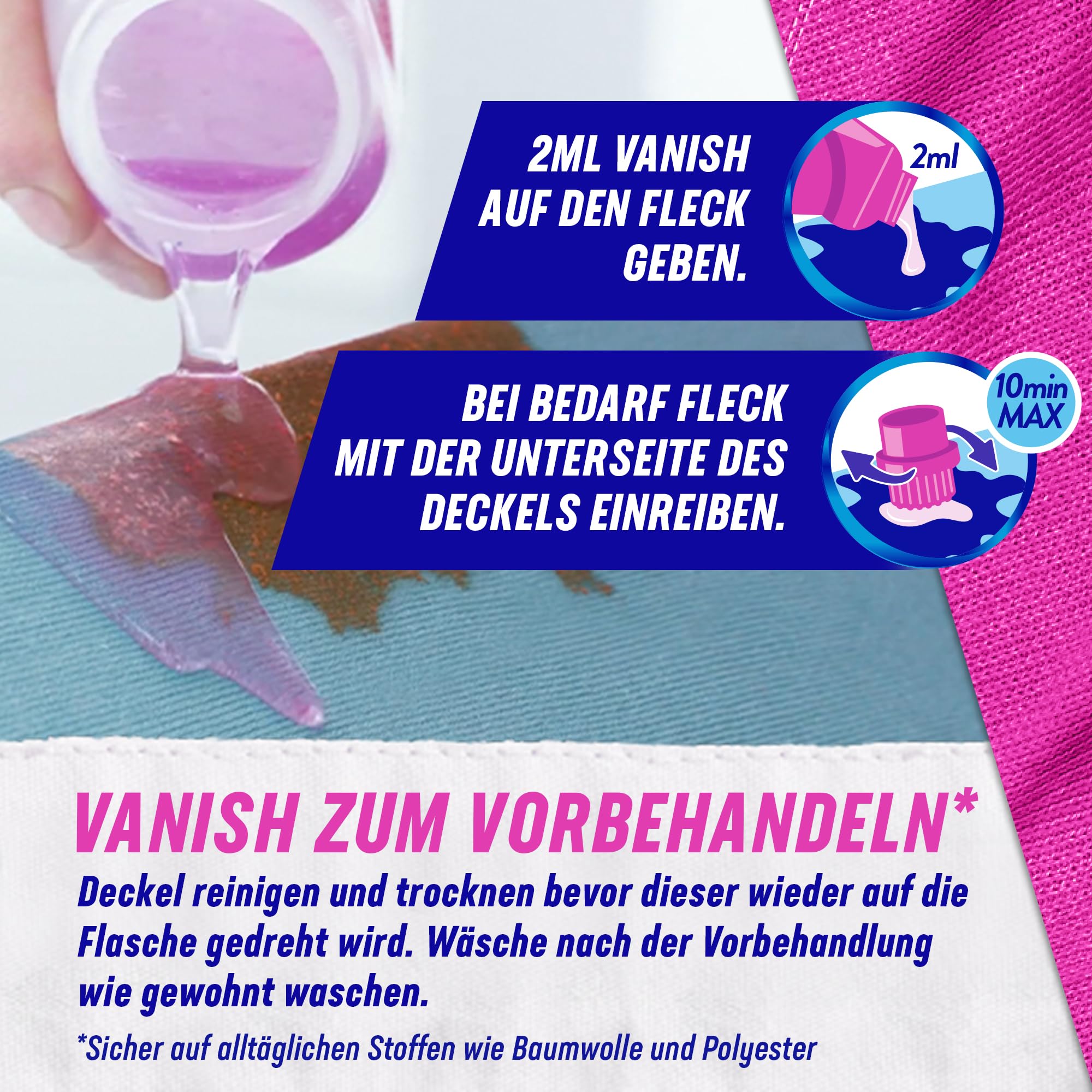 Vanish Oxi Action Wäsche Booster Gel Pink (ohne Chlor)Anwendungsmöglichkeiten:1. Waschen: 50 ml Gel zum Waschmittel in das Hauptwaschfach geben. Waschmittel wie gewohnt dosieren. Eine Dosis zu jeder Wäsche geben.