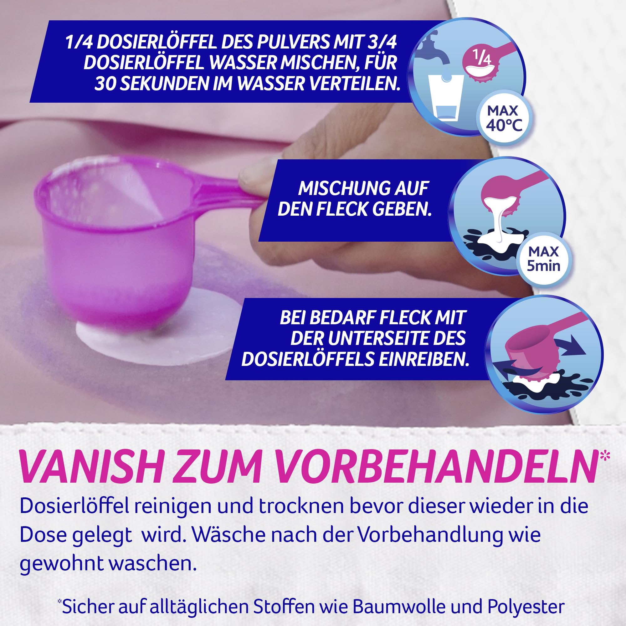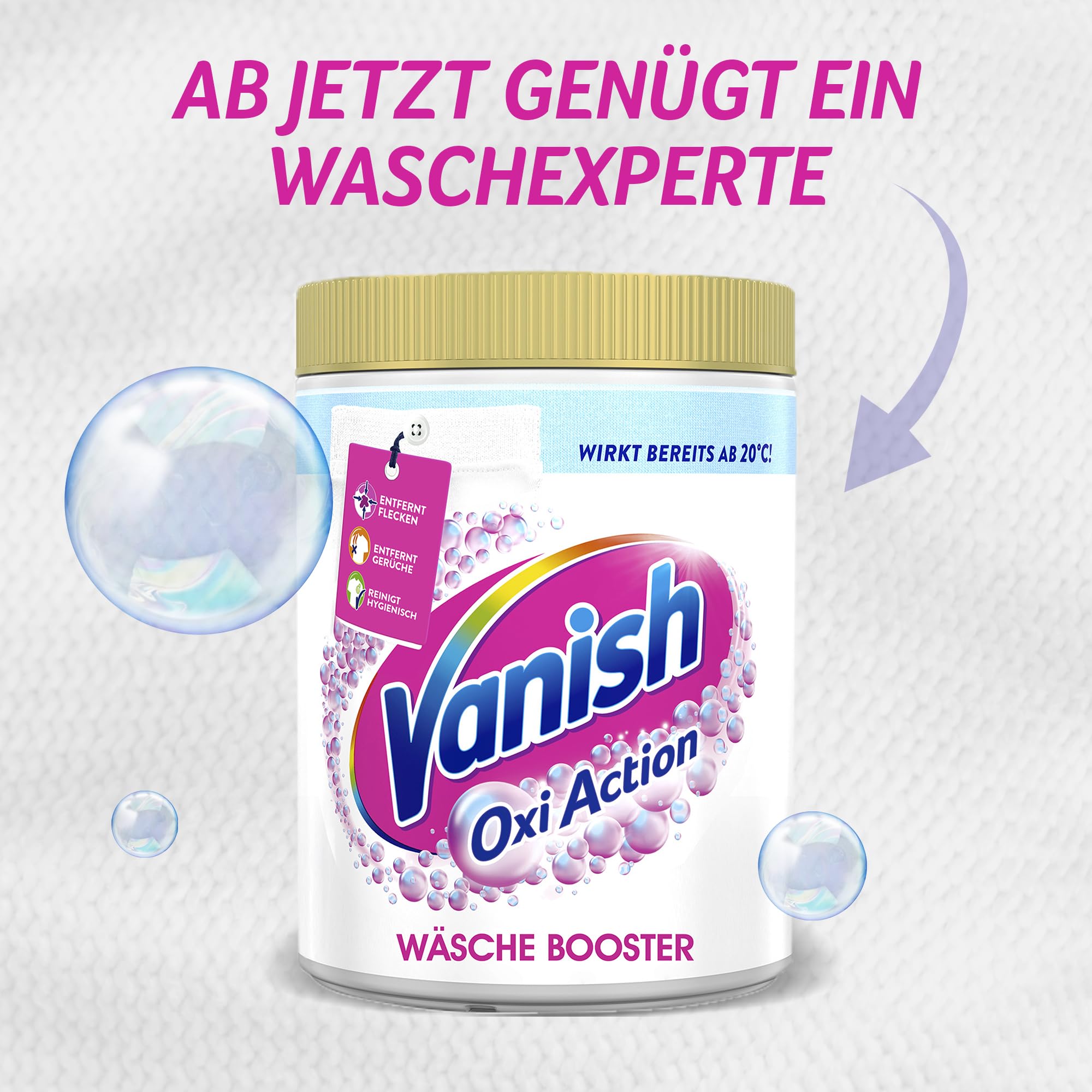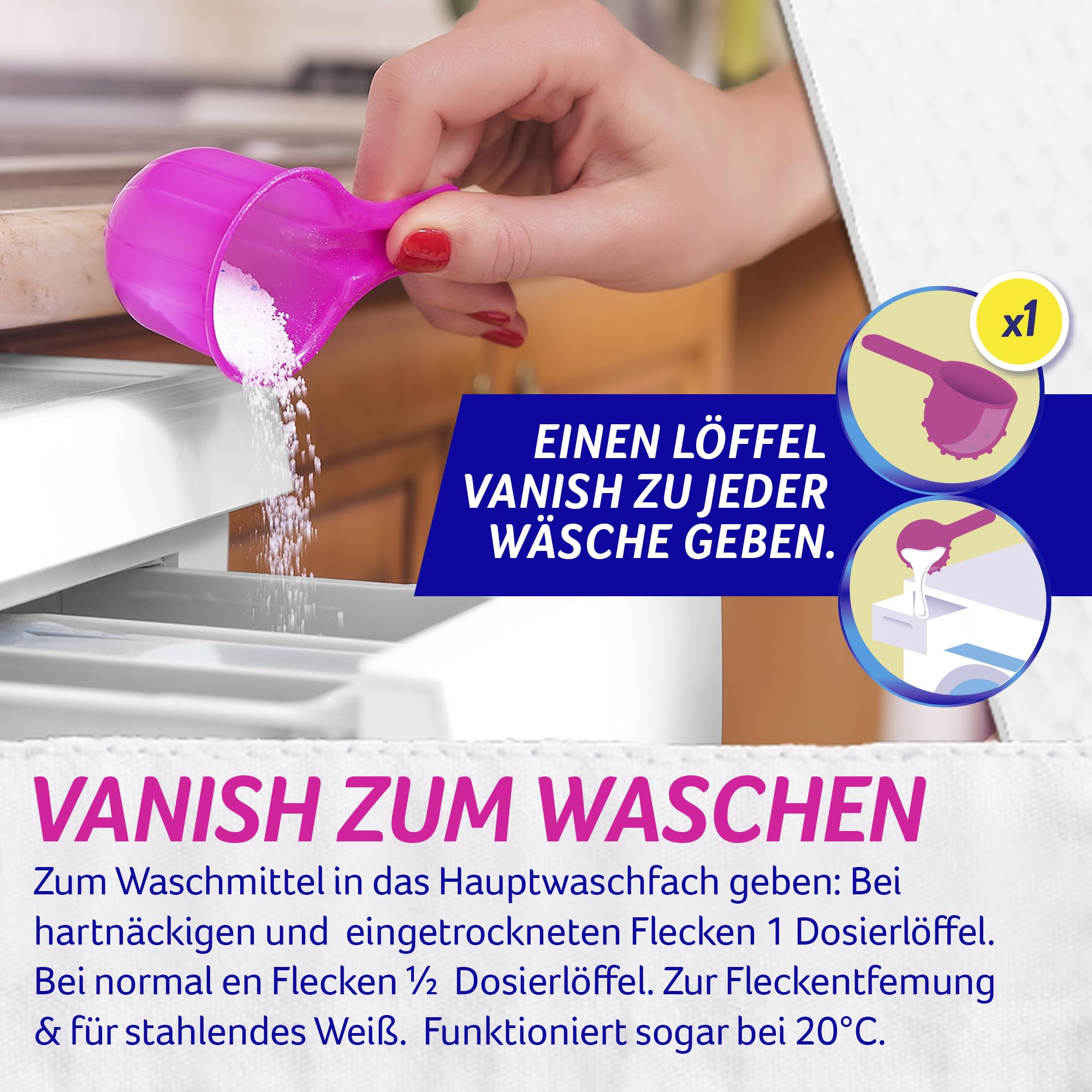 Vanish Oxi Action Wäsche Booster Pulver Powerweiss (ohne Chlor)Anwendungshinweise1. Waschen: Pulver zum Waschmittel in das Hauptwaschfach geben. Waschmittel wie gewohnt dosieren.2. Vorbehandeln: 1/4 Dosierlöffel Pulver mit 3/4 Dosierlöffel Wasser (max. 40 °C) mischen. Mischung auf den Fleck auftragen und max. 5Minuten einwirken lassen.3. Einweichen: 1 Dosierlöffel in 4 l warmes Wasser (max. 40 °C) geben und Textilien darin einweichen lassen.Immer Pflegehinweise des Herstellers beachten.Inhaltsstoffe> >30 Prozent Bleichmittel auf Sauerstoffbasis, <5Prozent anionische Tenside, nichtionische Tenside, Zeolithe, Enzyme, optischer Aufheller, Duftstoffe Gefährliche Inhaltssstoffe: Natriumpercarbonat.SicherheitsinformationenGefahr. Verursacht schwere Augenschäden. Verursacht Hautreizungen. Darf nicht in die Hände von Kindern gelangen. Ist ärztlicher Rat erfor-derlich, Verpackung oder Kennzeichnungsetikett bereithalten. Nach Gebrauch Hände gründlich waschen. Bei Kontakt mit den Augen: EinigeMinuten lang behutsam mit Wasser spülen. Eventuell vorhandene Kontaktlinsen nach Möglichkeit entfernen. Weiter spülen. Sofort Giftinfor-mationszentrum Arzt anrufen. Bei Verschlucken: Bei Unwohlsein Giftinformationszentrum/Arzt anrufen.Über VanishIn jeder Wohnung entstehen im Alltag häufig unschöne Flecken - ob auf Kleidungsstücken oder Teppichen. Vanish bietet als führender Expertedie beste Fleckenentfernungslösung für jede Situation und stellt Produkte her, mit denen man beinahe jeden sichtbaren Fleck beseitigen kann -sogar hartnäckige, eingetrocknete und alte Flecken. Vanish hilft in jedem Haushalt und schafft mehr Zeit für die schönen Dinge im Leben.*Basierend auf dem Weisserhalt nach 50 Wäschen vs. Waschmittel allein nach 25 Wäschen bei Kaltwäsche.