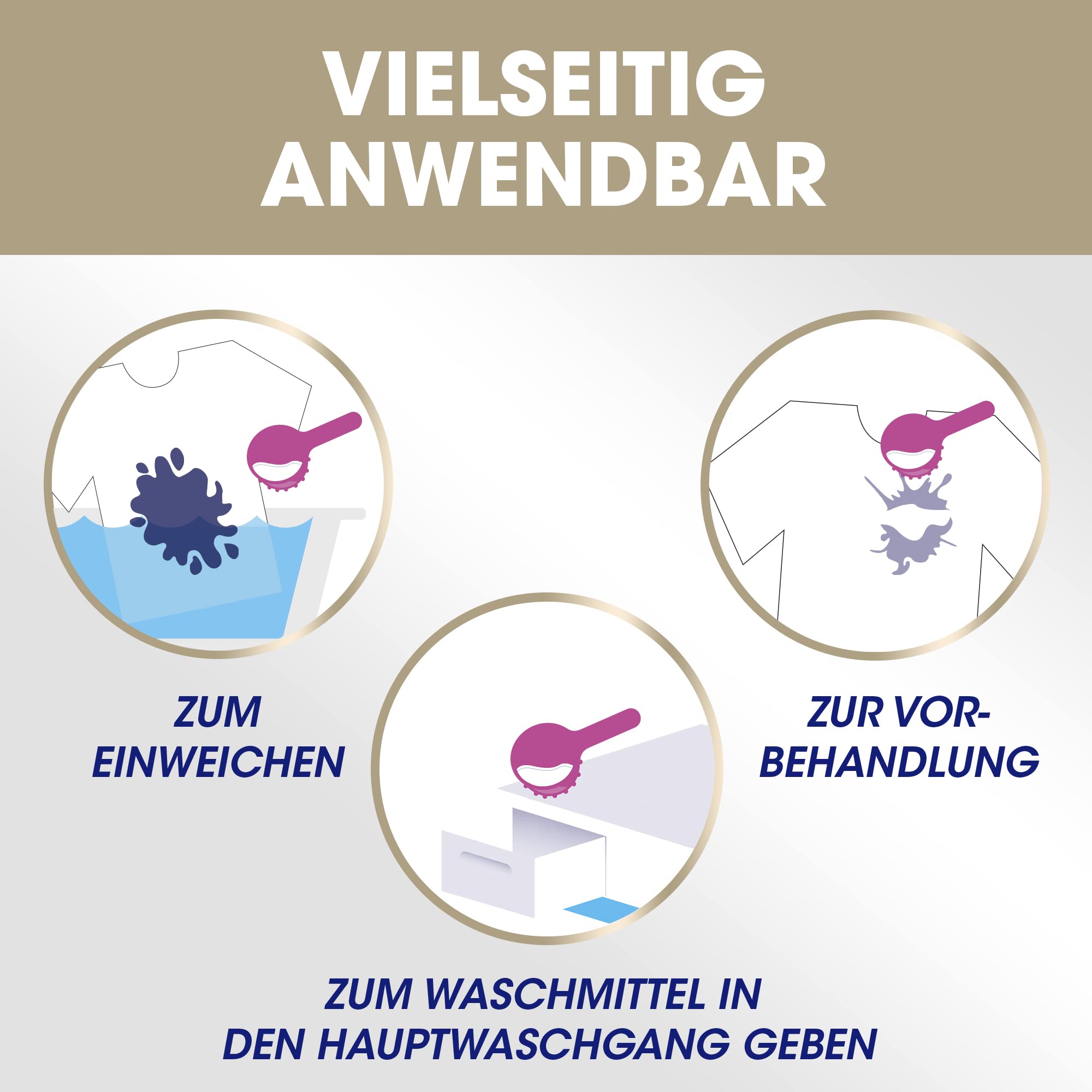Immer Pflegehinweise des Herstellers beachten.Inhaltsstoffe> >30 % Bleichmittel auf Sauerstoffbasis, <5% anionische Tenside, nichtionische Tenside, Zeolithe, Enzyme, optischer Aufheller, Duftstoffe