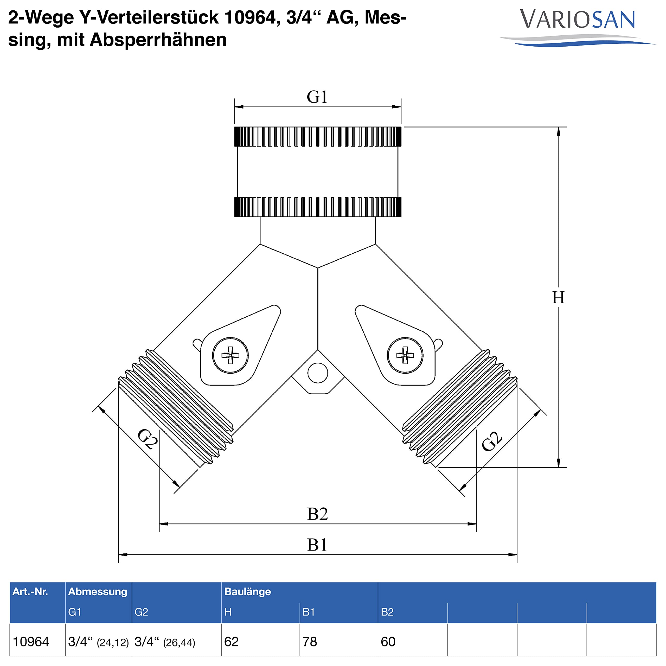 VARIOSAN 2-Wege Y-Verteilerstück 10964, 3/4" AG, Messing, mit Absperrhähnen