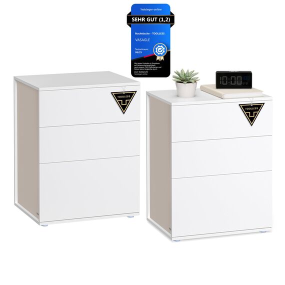 VASAGLE Nachttisch 2er Set, superschnelle werkzeuglose Montage, Toolless-Technologie, Beistelltisch 3 Schubladen, Nachtschrank, Schlafzimmer, Wohnzimmer, mattweiss-cappuccinobeige LET779W01