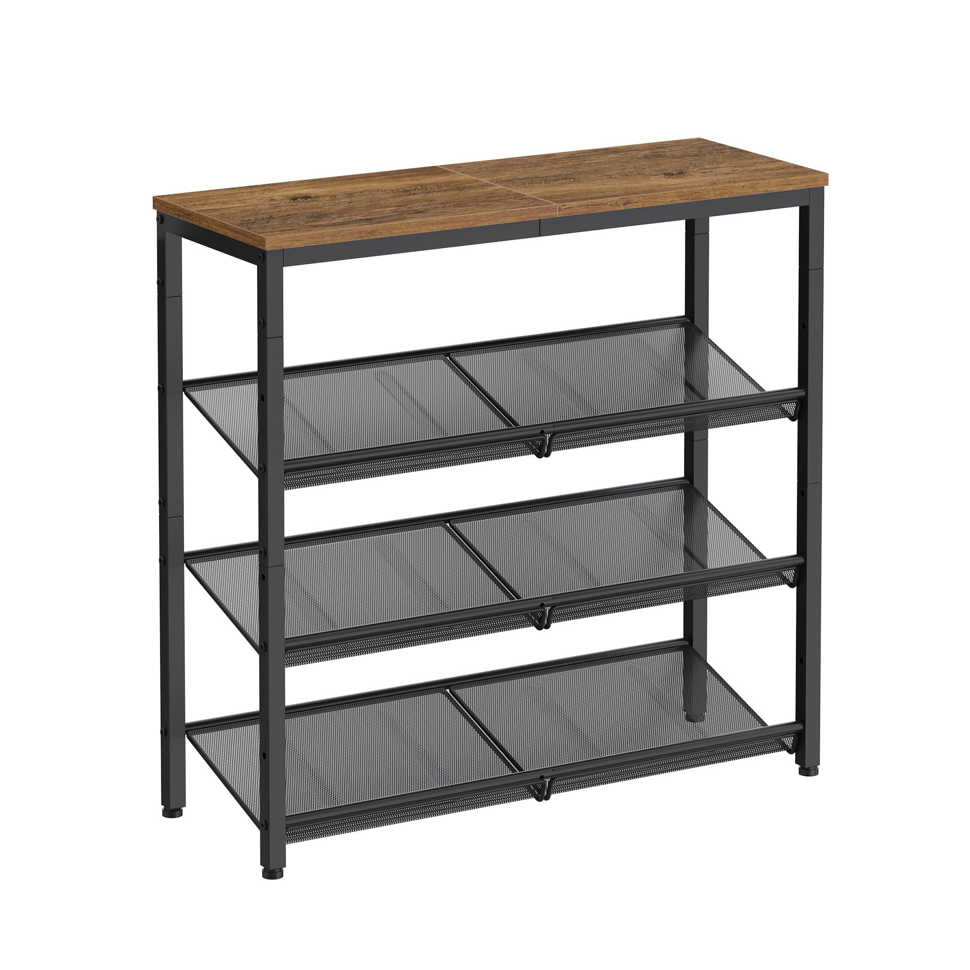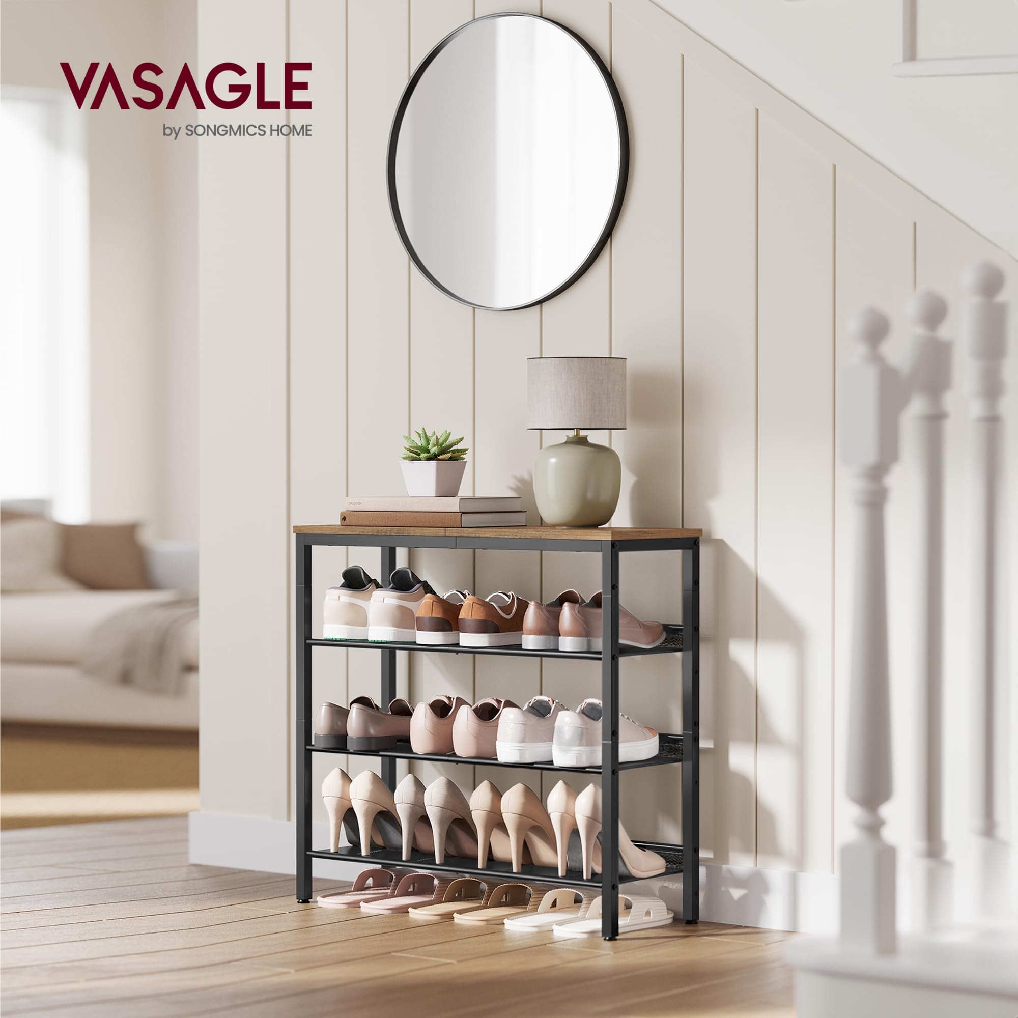 VASAGLE Schuhregal, Schuhablage, 4 Ebenen, grosse Oberfläche, verstellbare Gitterablagen, platzsparend für Eingangsbereich Flur, Metall, Industrie-Stil, honigbraun-tintenschwarz LBS040K01
