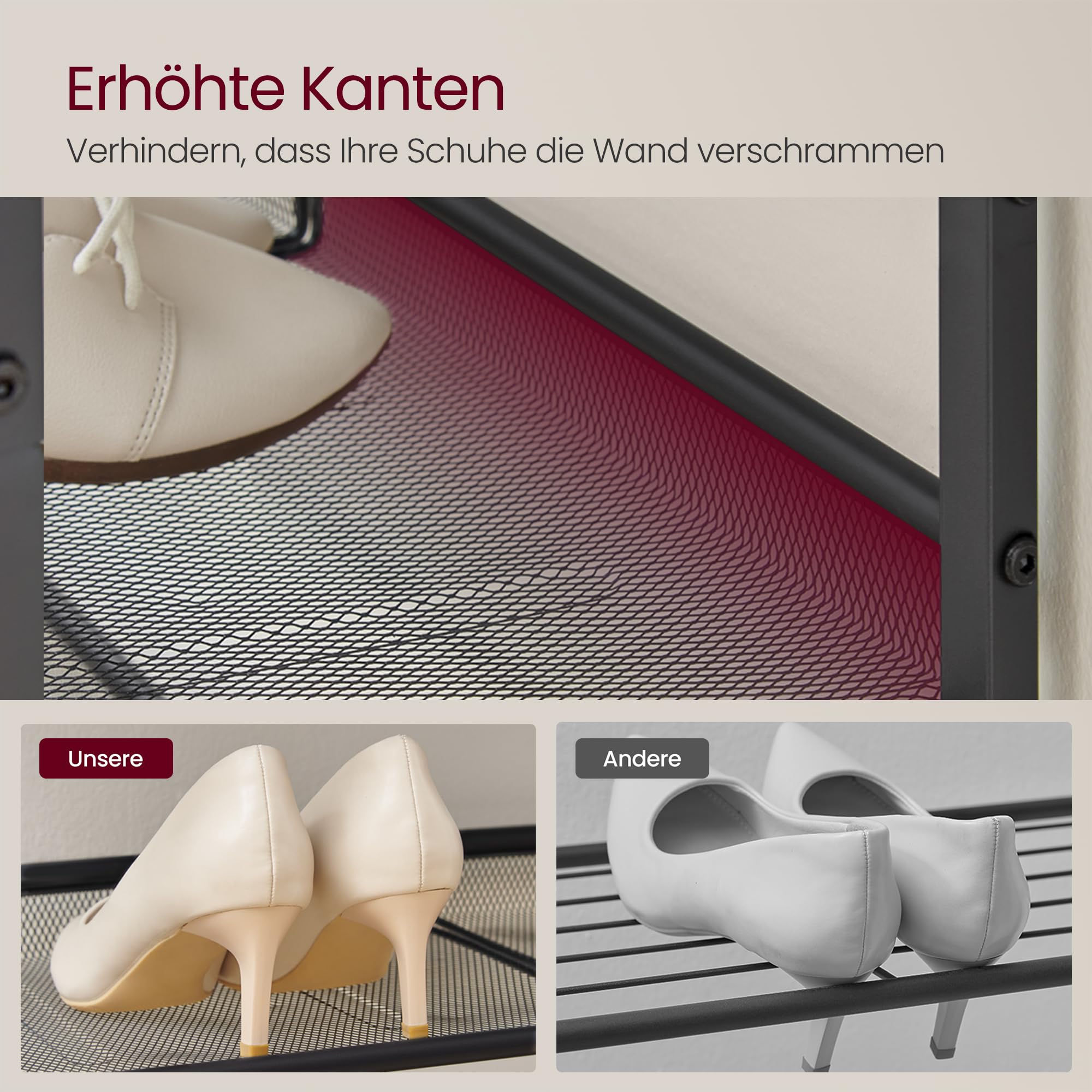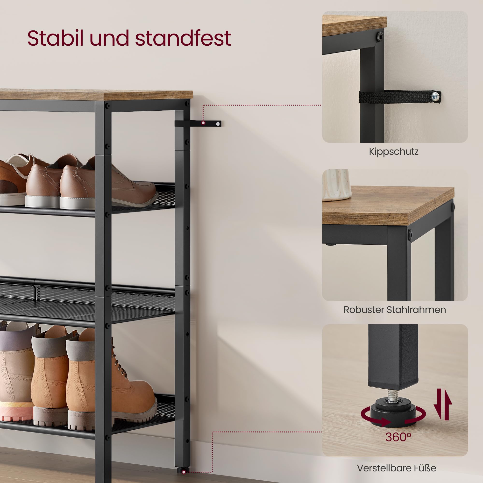 - Bitte befestigen Sie dieses Schuhregal mit dem beiliegenden Kippschutz an der Wand, um eine sichere Nutzung sicherzustellen.