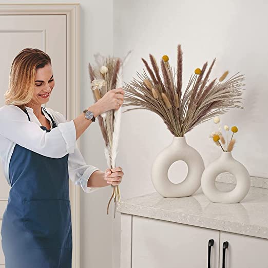 2 weisse Keramik-Blumenvasen für Wohnungsdekoration und Schlafzimmerdekoration, dekorative Vasen für Tischdecke mit Pampasgras