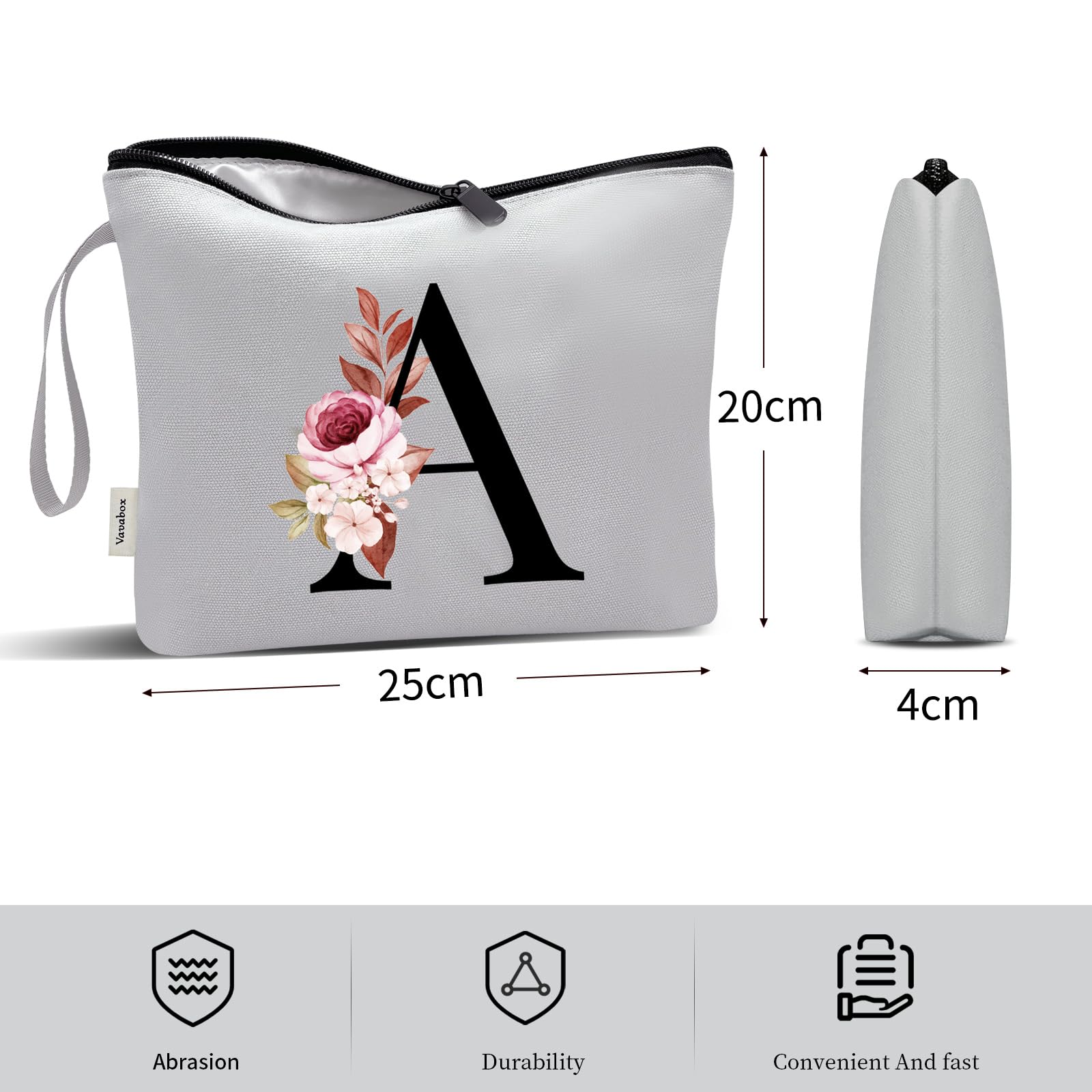 Vavabox A-Z Personalisierte Kosmetiktasche – Geburtstagsgeschenke für Frauen, Mütter, Beste Freundinnen und Brautjungfern (A, Grau)