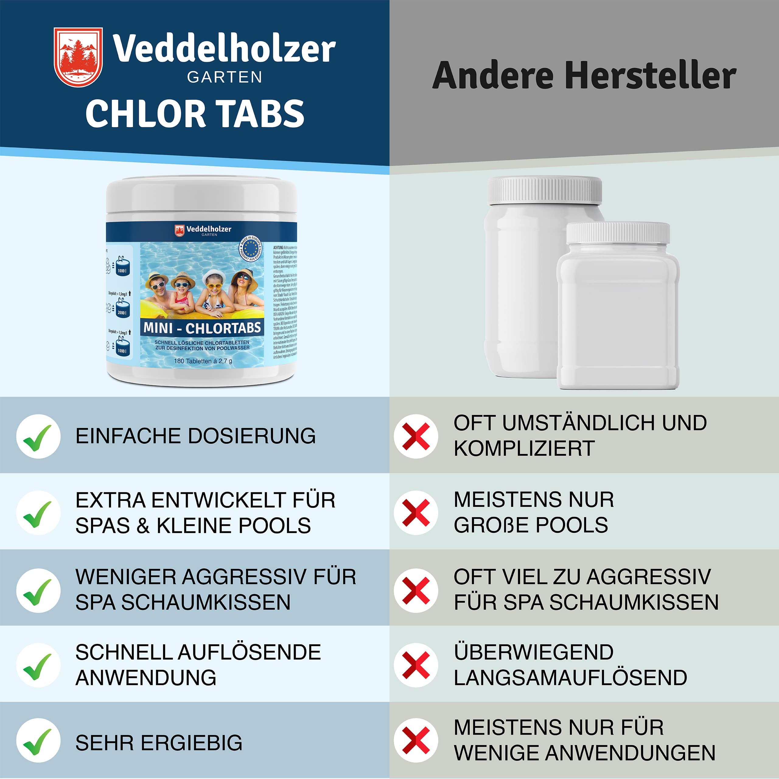 • ✅WENIGER AGRESSIV: Im Vergleich zu langsam löslichen Chlortabletten sind die schnellauflösenden Veddelholzer Mini Tabs weniger aggressiv und somit bestens geeignet für Schaumkissen und aufblasbare Pools.