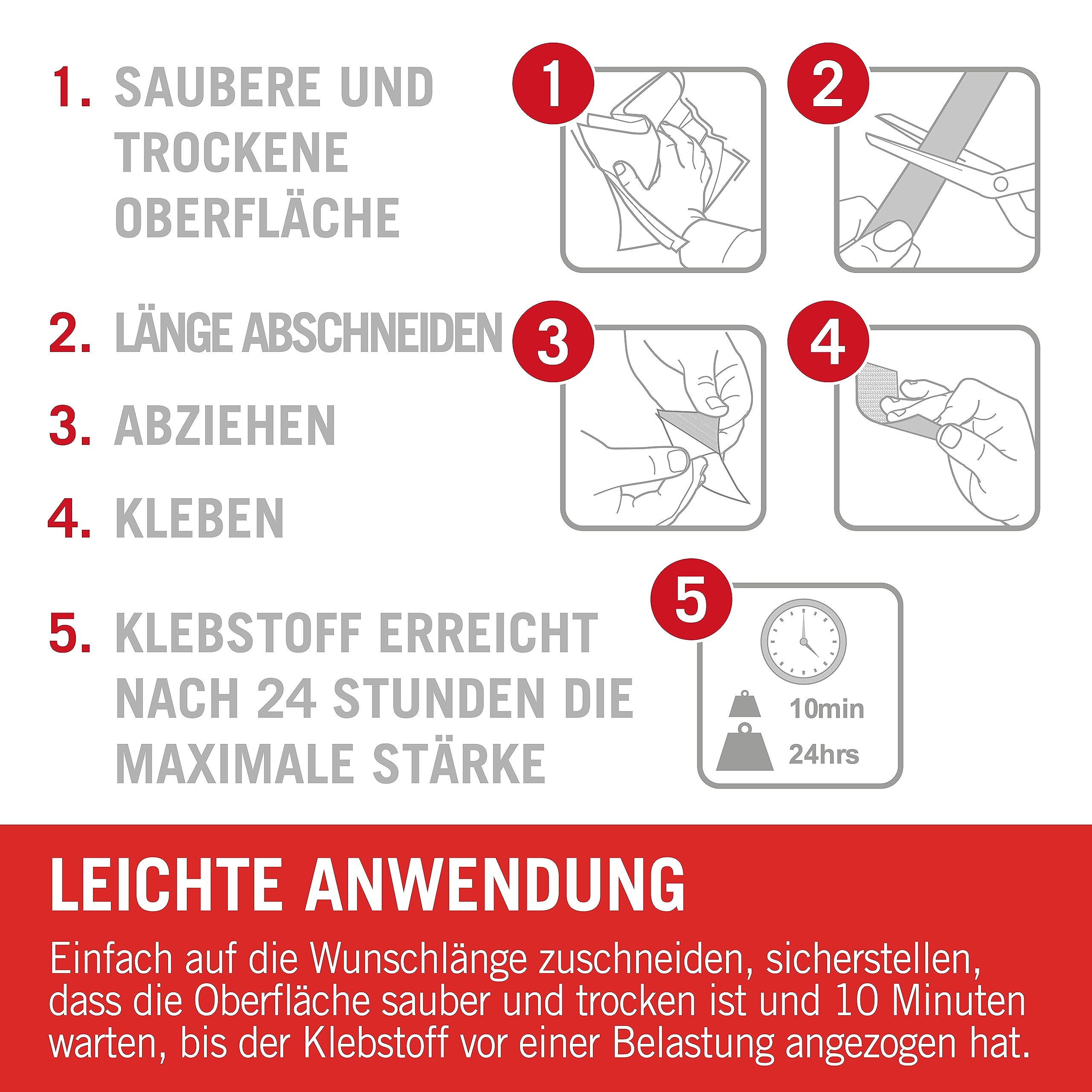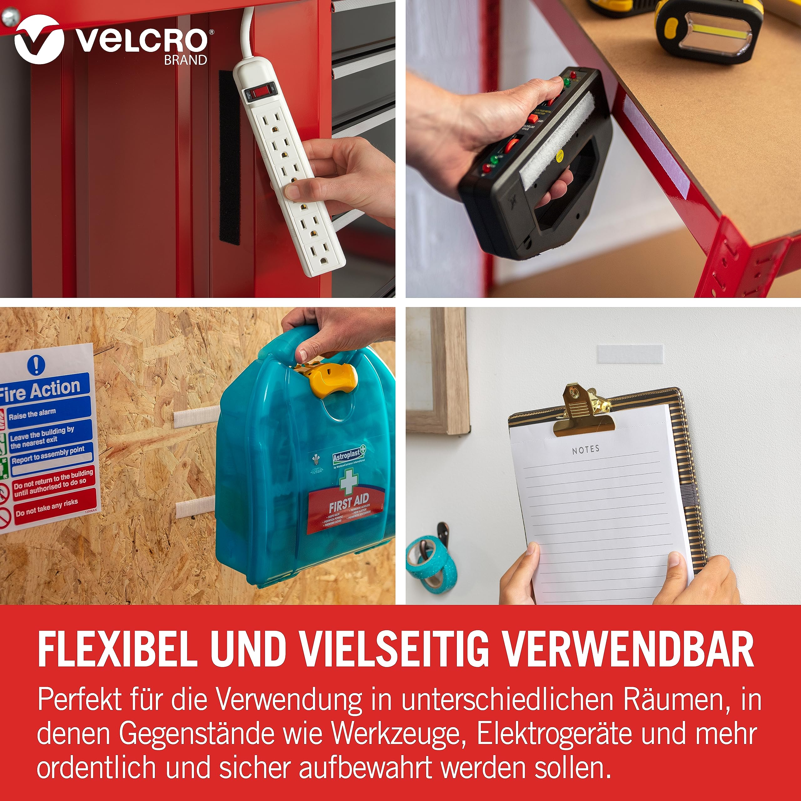 Das VELCRO Brand Klettband ist eine einfache Alternative zu Nägeln, Schrauben und unsauberen Klebern und ermöglicht eine schnelle Befestigungslösung. Zum Aufbewahren und Sichern von Gegenständen wie kleinen Werkzeugen, Hinweistafeln, Schildern, Elektrogeräten und vielem mehr. Das Produkt hält bis zu 300 g pro 20 mm x 20 mm Klettband. VELCRO Klettbänder mit Allzweckkleber werden für glatte Oberflächen und für den Innen- und Aussenbereich empfohlen. Anwendungsinstruktionen: 1. Oberfläche vor dem Auftragen reinigen und trocknen 2. Klebestreifen vom Klettband abziehen und fest auf die Oberfläche drücken 3. Lassen Sie den Klebstoff mindestens 10 Minuten lang aushärten, bevor Sie den Klettverschluss anbringen, um einen Gegenstand zu befestigen. Klebstoff erreicht maximale Festigkeit nach 24 Stunden Hinweis: Nicht empfohlen für Stoffe, Armaturenbretter, flexibles Vinyl oder Unterwasseranwendungen. Dauerhafte Sonneneinstrahlung kann das Klettband beschädigen.