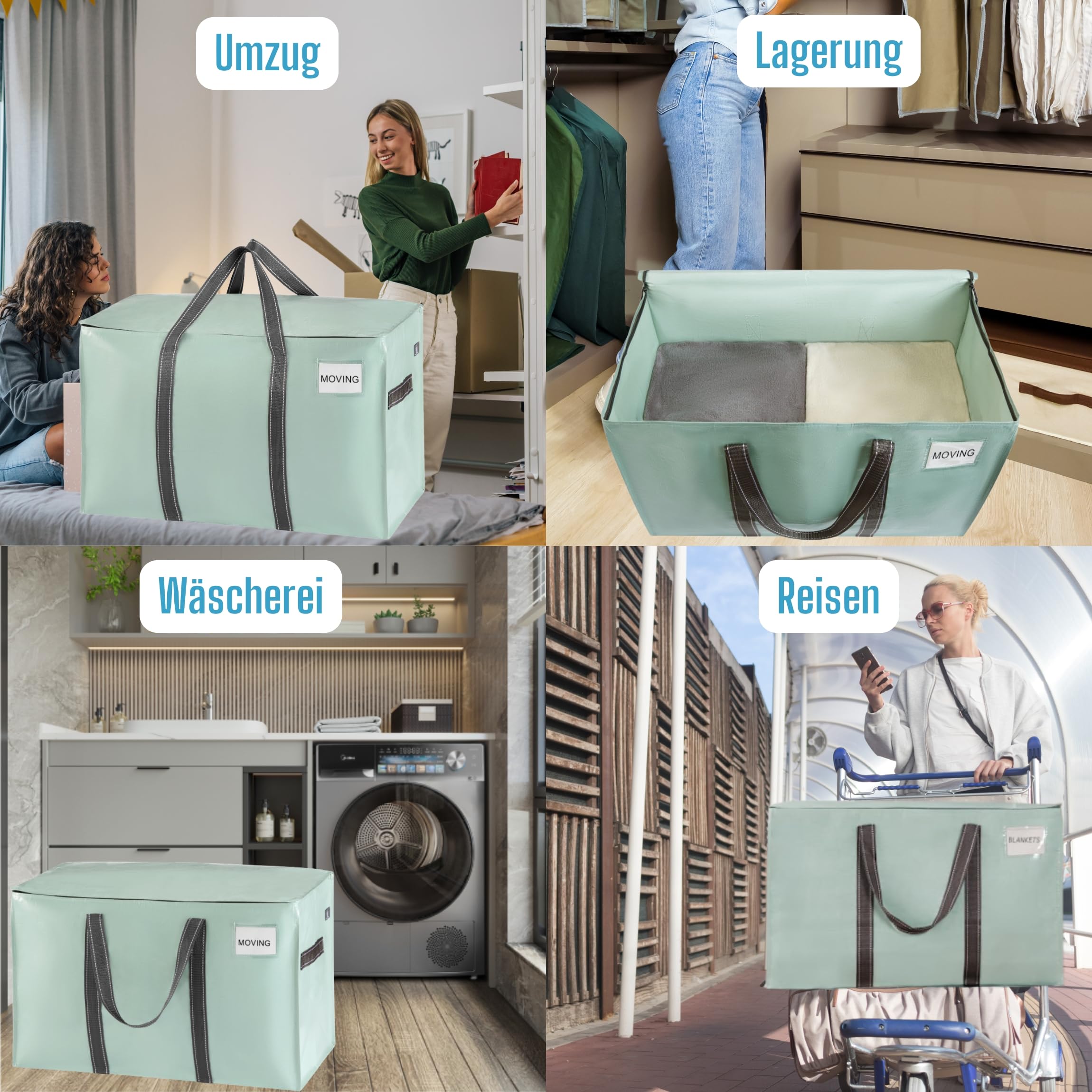 VENO 102 Liter Grosse Aufbewahrungstasche, Aufbewahrungsbox mit Deckel, Starke Griffe Umzugstaschen mit Reissverschlüssen, Alternative Umzugskartons, Faltbare Kleideraufbewahrung (Hellgrün, 6er Pack)