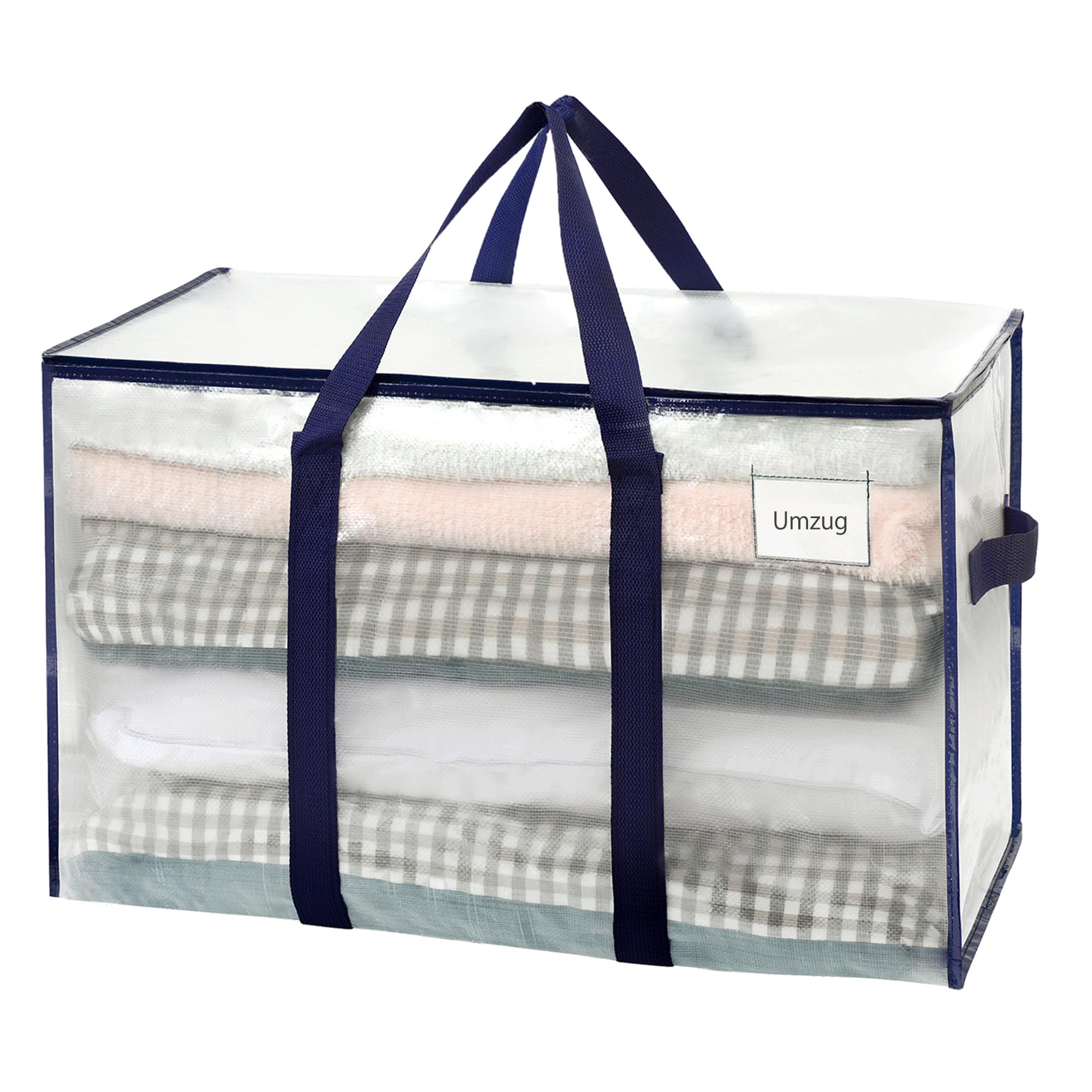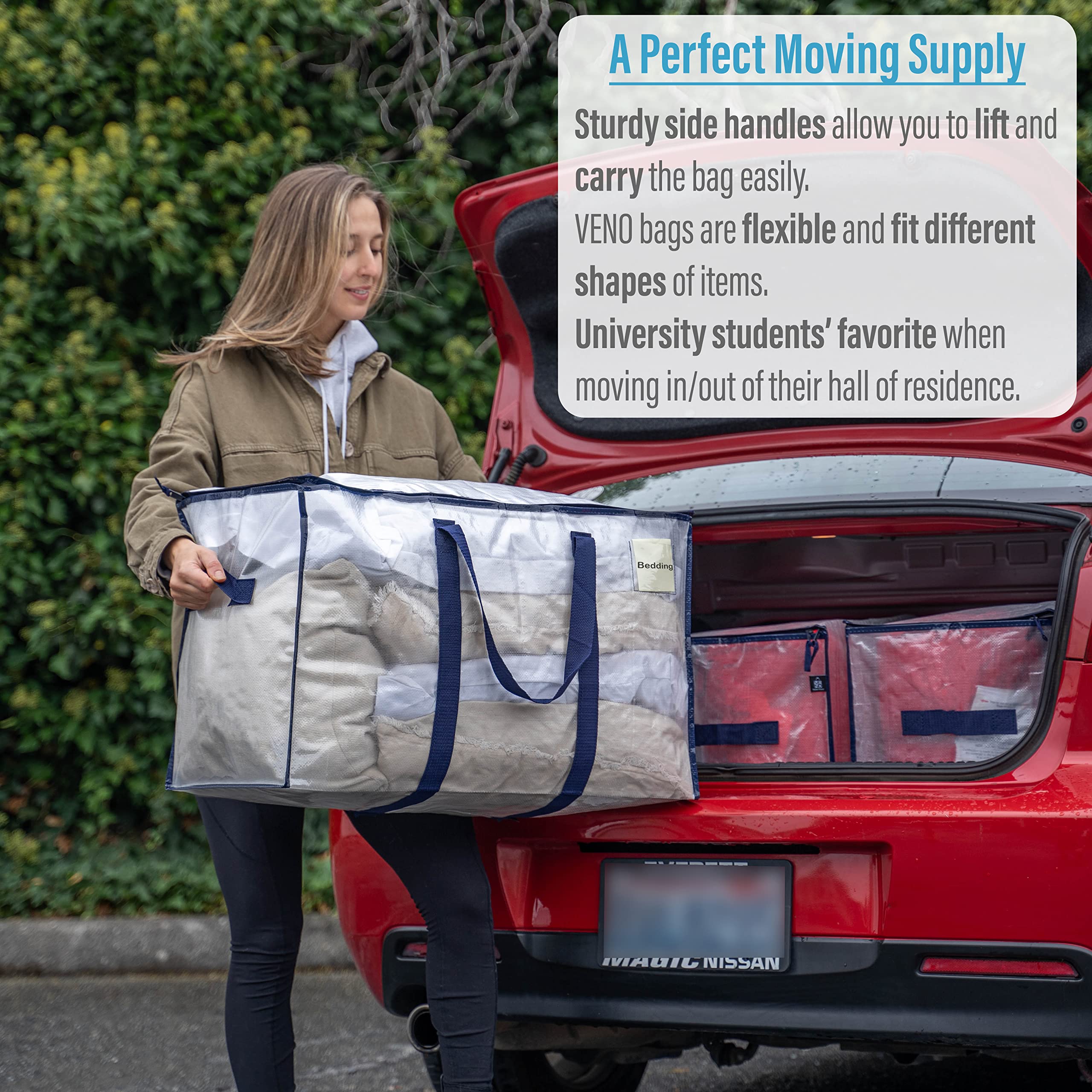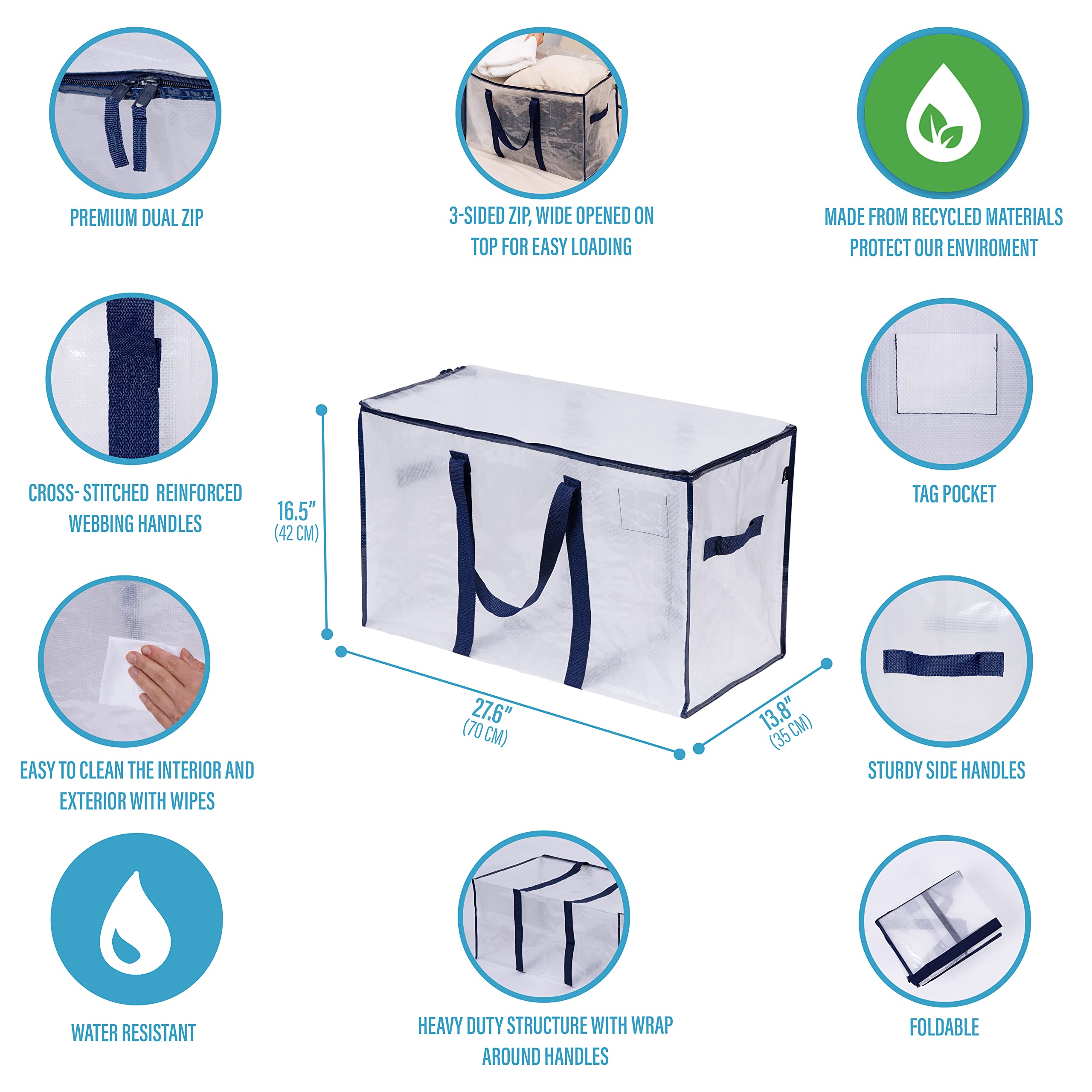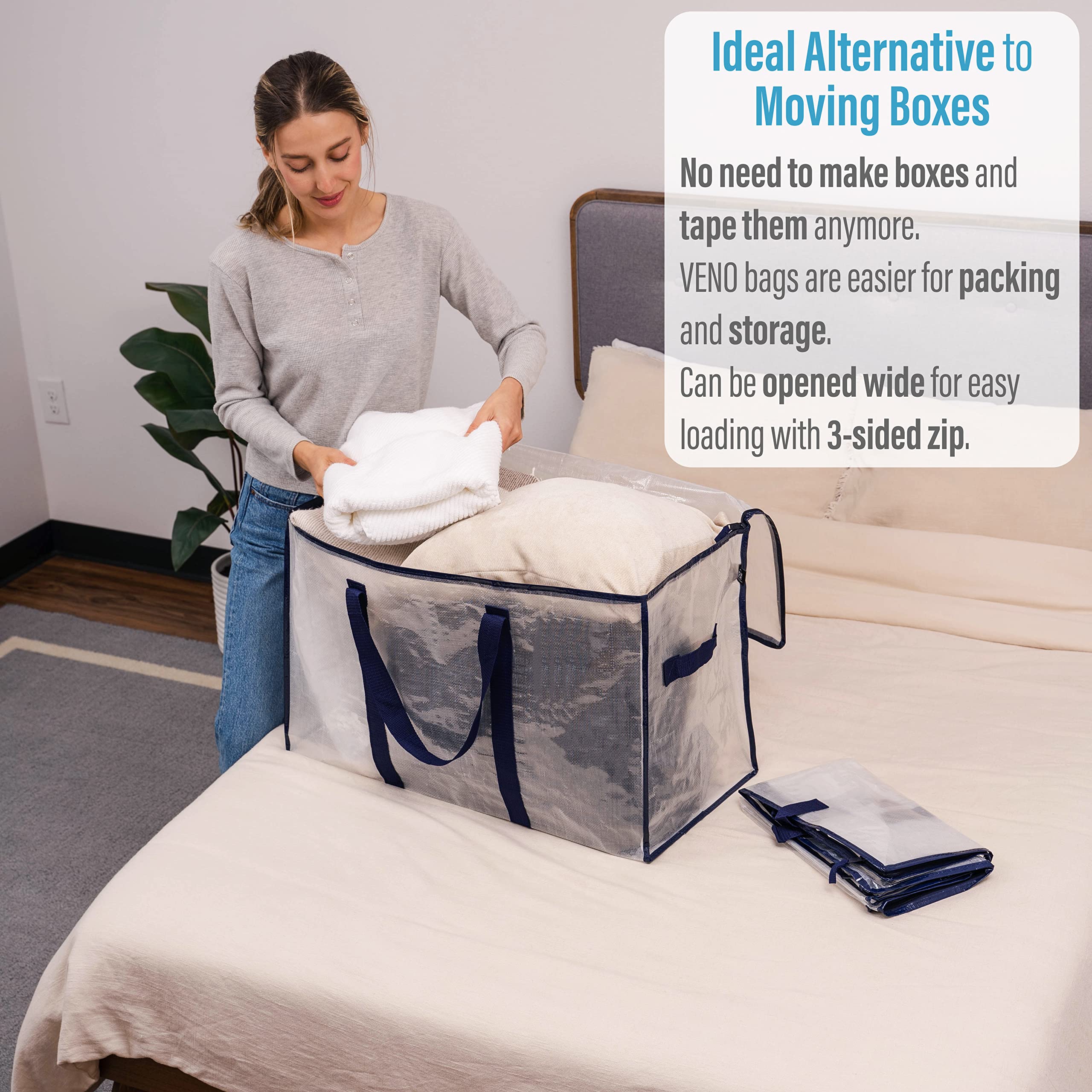 VENO 102 Liter Grosse Aufbewahrungstasche, Aufbewahrungsbox mit Deckel, Starke Griffe Umzugstaschen mit Reissverschlüssen, Alternative Umzugskartons, Faltbare Kleideraufbewahrung (Transparent, 4er Pack)