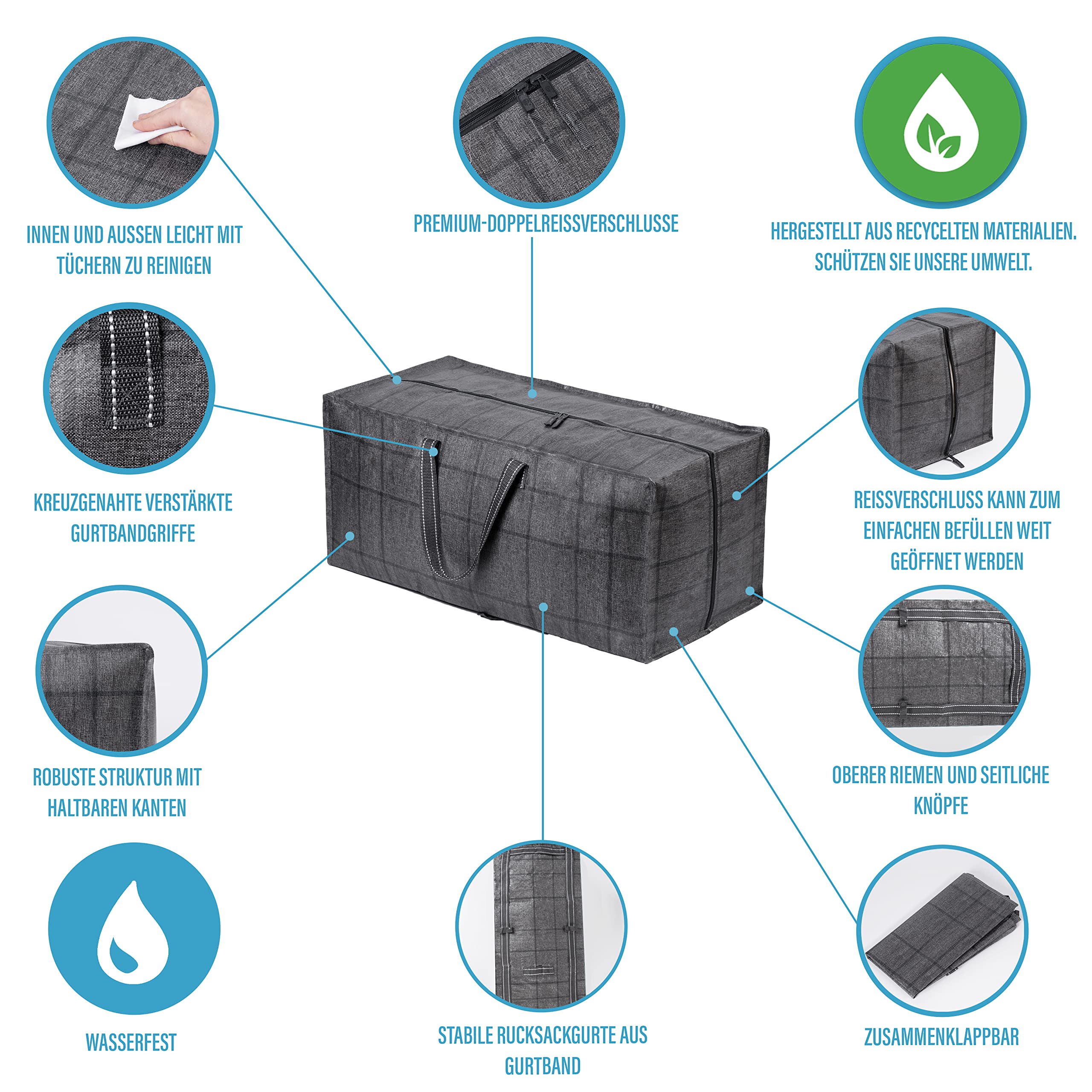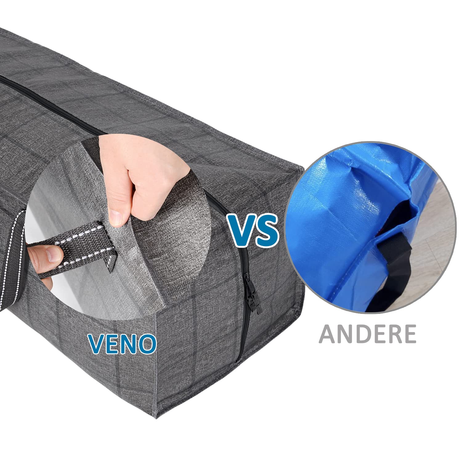 VENO Environmental Commitment: Es ist unsere Mission und unser Engagement, unsere Auswirkungen auf die Umwelt zu reduzieren, um eine sauberere, lebenswertere Zukunft zu gestalten. Der Stoff in dieser Tasche besteht zu 85 % aus recyceltem Material, das Kunststoffmaterial in Ozeanen, Seen und Deponien spart. Bitte verwenden Sie es so weit wie möglich, um unsere Umwelt zu schützen. 【Die stärksten Umzugstaschen】 VENO extra grosse, strapazierfähige, wiederverwendbare Aufbewahrungsbeutel sind unglaublich langlebig. Diese Taschen sind aus sehr strapazierfähigem PP-Gewebe (220 Gramm) hergestellt. Die Griffe sind aus dickem, strapazierfähigem Poly-Gurtband. Extrem vielseitig: Diese Taschen können verwendet werden, um Kleidung, Bücher und Schuhe aufzubewahren. Perfekt für die Aufbewahrung von Bettwäsche, Kissen und Decken. Zur Aufbewahrung von Weihnachtsdekorationen wie Lichtern, Dekorationen und Ornamenten. Diese Taschen sind fantastisch für Umzüge und Reisen. Sie schützen vor Kratzern und Beschädigungen beim Bewegen. Sie sind eine fantastische Alternative zu traditionellen Wäschekörben und ideal für Studenten, Familien, die in Wohnungen leben, und denken Sie daran, dass diese Taschen eine Menge Kleidung aufnehmen können. Reissverschluss in voller Länge und mehrere Tragemöglichkeiten: Der starke Reissverschluss oben verläuft über die gesamte Länge der Tasche, wodurch es unglaublich einfach zu be- und entladen ist. Starke Tragegriffe aus Polygewebe und zusätzliche Rucksackgurte ermöglichen mehrere Möglichkeiten, diese Taschen zu tragen. Die zusätzlichen Gurte an der Unterseite der Tasche ermöglichen es Ihnen, diese Taschen wie einen Rucksack zu tragen.