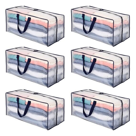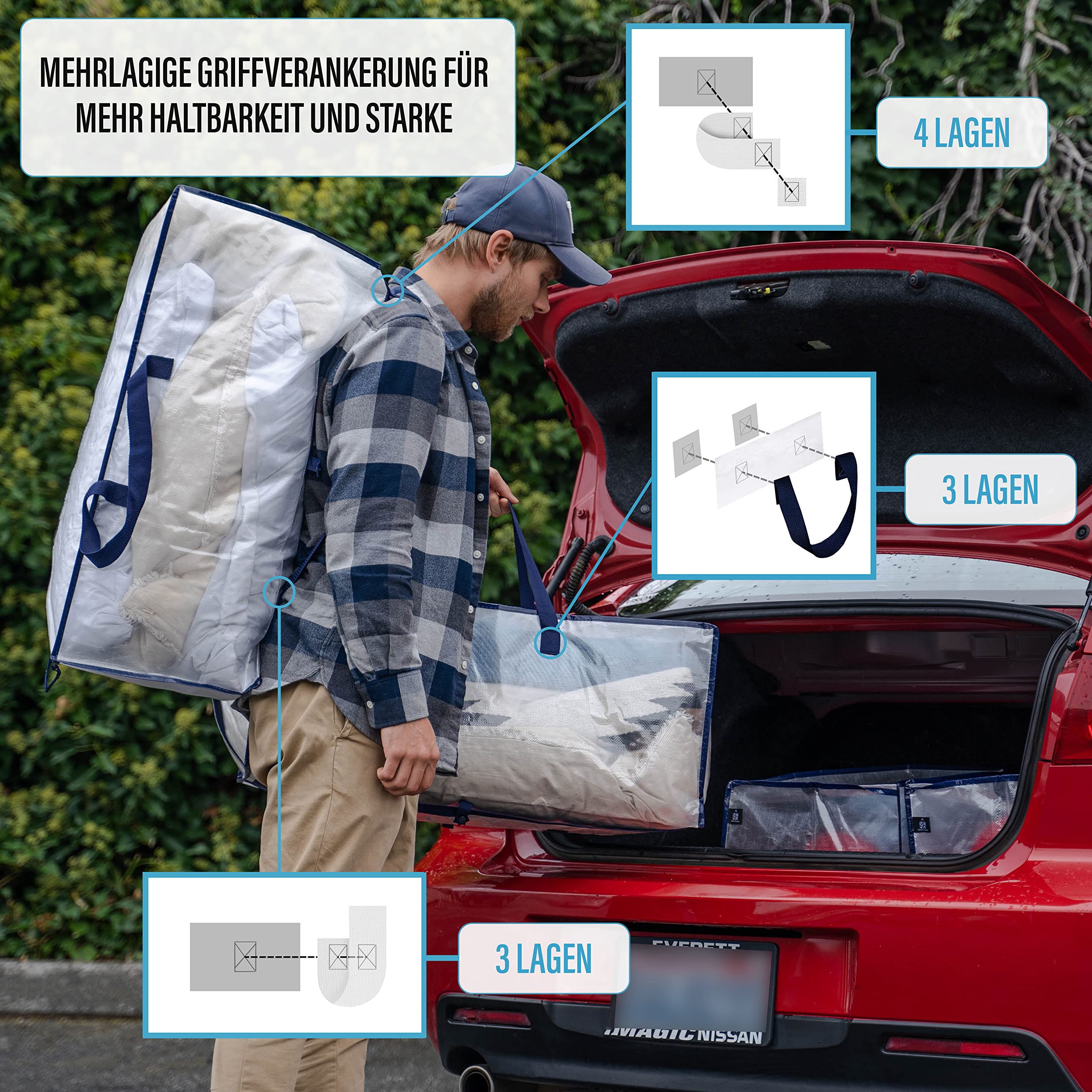 VENO 87 Liter extra grosse Umzugstaschen mit Rucksackgurten, Umzugshelfer, starke Griffe und Reissverschlüsse, Kleideraufbewahrung, Wäschesäcke, wiederverwendbar und nachhaltig (Transparent, 6er-Pack)