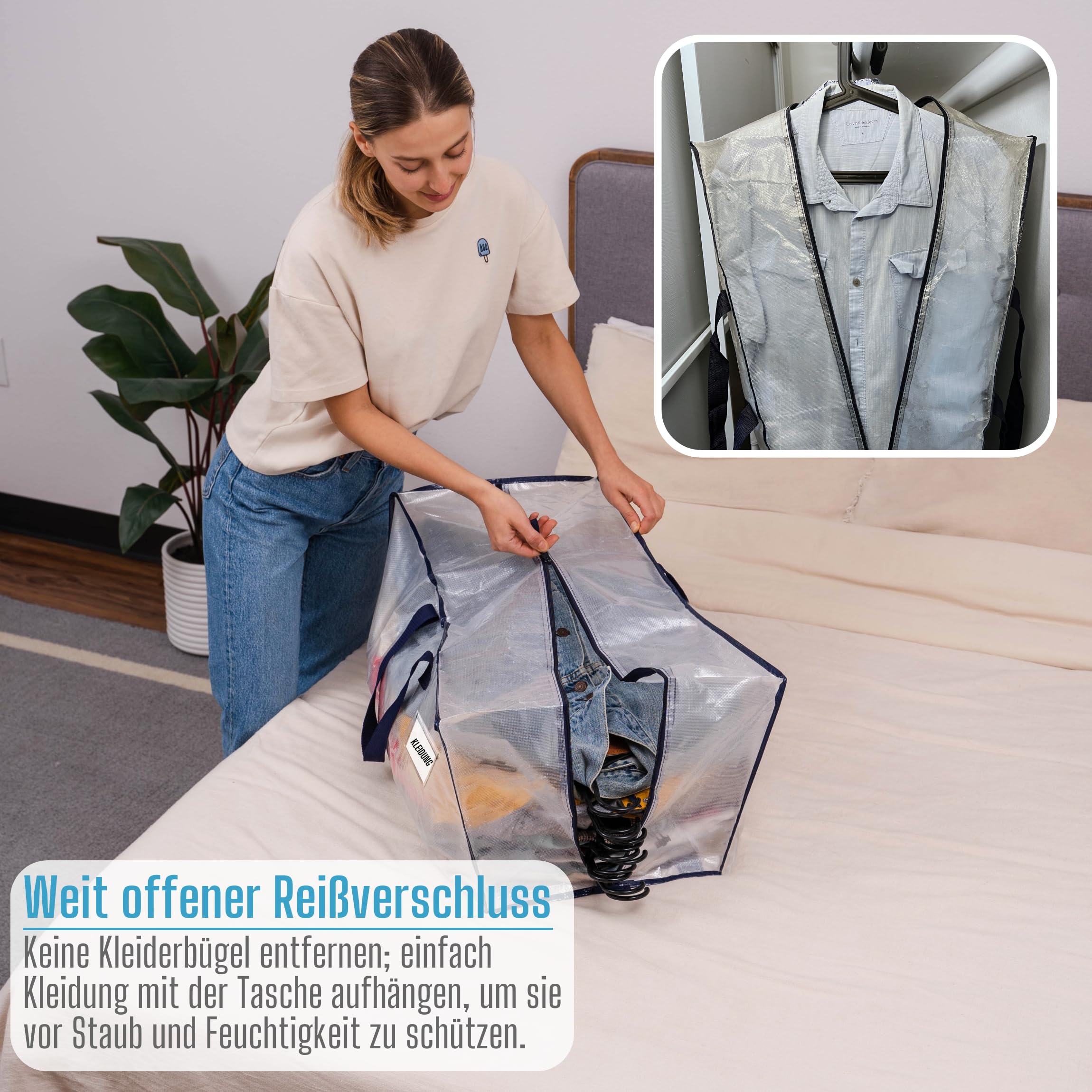 VENO Extra grosse, robuste, wiederverwendbare Aufbewahrungsbeutel sind unglaublich langlebig und vielseitig. Mit robusten Poly-Gurtbandgriffen sind sie die perfekte Alternative zu Umzugskartons. Diese Taschen sind ideal für die Aufbewahrung von Bettwäsche, Kissen, Decken, Kleidung (mit Aufhängern), Büchern, Schuhen und Urlaubsdekorationen. Sie verfügen über einen durchgehenden Reissverschluss für einfaches Be- und Entladen und bieten mehrere Tragemöglichkeiten, einschliesslich Rucksackgurte und untere Gurte für ultimative Flexibilität. Verwenden Sie sie als Alternative zu Ikea-Taschen mit Reissverschlüssen oder traditionellen Umzugsartikeln, wodurch sie perfekte Packtaschen für den Umzug sind. Diese strapazierfähigen Umzugstaschen können bis zu 22,7 kg tragen, passend für mittelgrosse und grosse Umzugskartons. Sie sind ideal für Studenten, Familien in Wohnungen und alle, die nach effizienten Aufbewahrungs- und Umzugslösungen suchen. Wählen Sie VENO um Ihren Umzug zu optimieren und die Umwelt zu schützen.