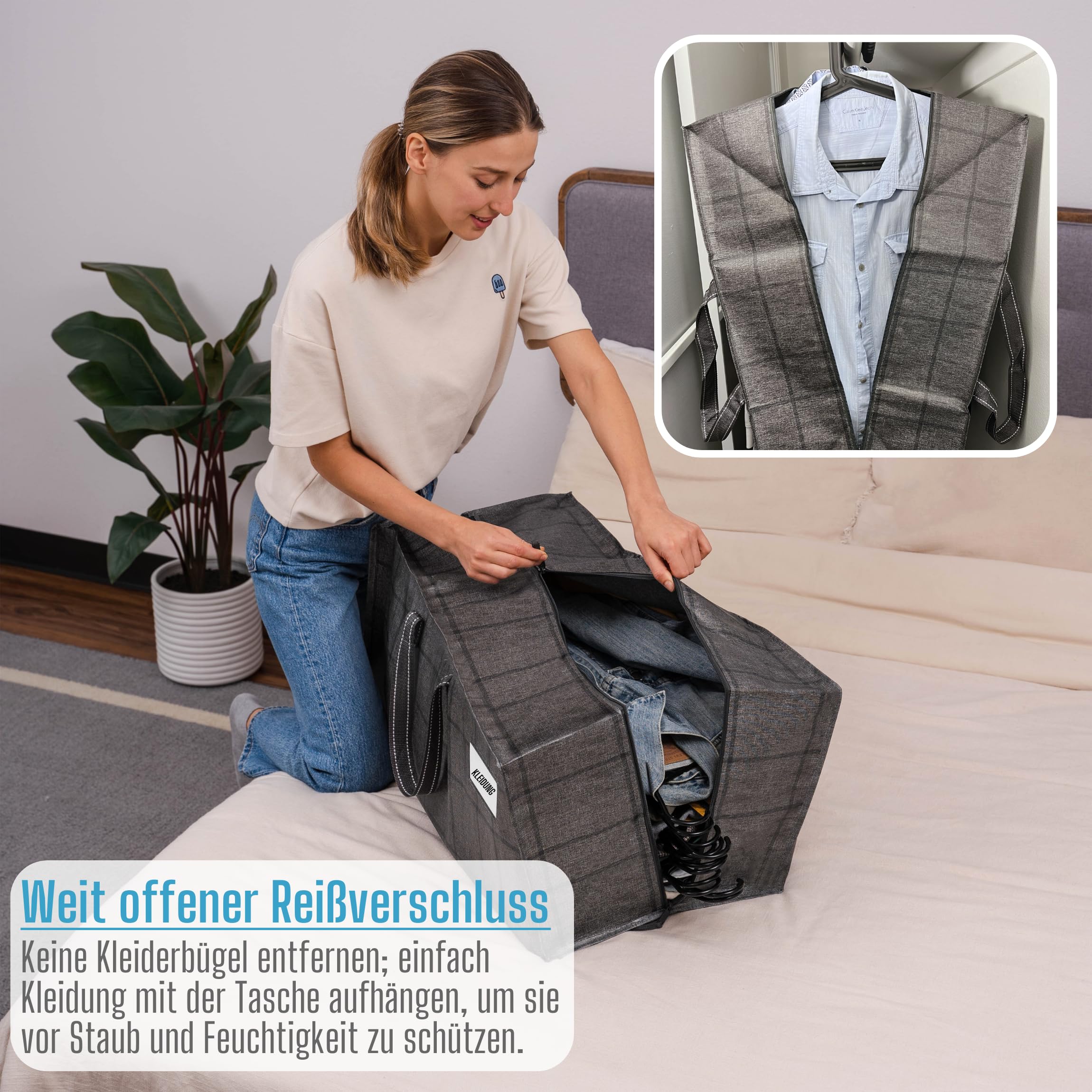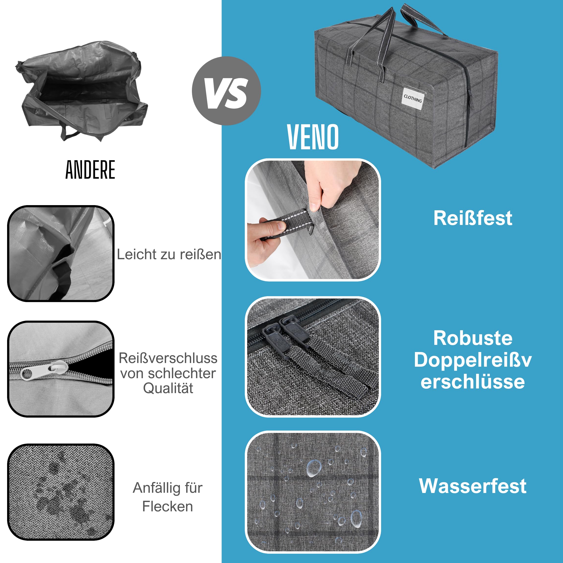VENO Environmental Commitment: Es ist unsere Mission und unser Engagement, unsere Auswirkungen auf die Umwelt zu reduzieren, um eine sauberere, lebenswertere Zukunft zu gestalten. Der Stoff in dieser Tasche besteht zu 85 % aus recyceltem Material, das Kunststoffmaterial in Ozeanen, Seen und Deponien spart. Bitte verwenden Sie es so weit wie möglich, um unsere Umwelt zu schützen. 【Die stärksten Umzugstaschen】 VENO extra grosse, strapazierfähige, wiederverwendbare Aufbewahrungsbeutel sind unglaublich langlebig. Diese Taschen sind aus sehr strapazierfähigem PP-Gewebe (220 Gramm) hergestellt. Die Griffe sind aus dickem, strapazierfähigem Poly-Gurtband. Extrem vielseitig: Diese Taschen können verwendet werden, um Kleidung, Bücher und Schuhe aufzubewahren. Perfekt für die Aufbewahrung von Bettwäsche, Kissen und Decken. Zur Aufbewahrung von Weihnachtsdekorationen wie Lichtern, Dekorationen und Ornamenten. Diese Taschen sind fantastisch für Umzüge und Reisen. Sie schützen vor Kratzern und Beschädigungen beim Bewegen. Sie sind eine fantastische Alternative zu traditionellen Wäschekörben und ideal für Studenten, Familien, die in Wohnungen leben, und denken Sie daran, dass diese Taschen eine Menge Kleidung aufnehmen können. Reissverschluss in voller Länge und mehrere Tragemöglichkeiten: Der starke Reissverschluss oben verläuft über die gesamte Länge der Tasche, wodurch es unglaublich einfach zu be- und entladen ist. Starke Tragegriffe aus Polygewebe und zusätzliche Rucksackgurte ermöglichen mehrere Möglichkeiten, diese Taschen zu tragen. Die zusätzlichen Gurte an der Unterseite der Tasche ermöglichen es Ihnen, diese Taschen wie einen Rucksack zu tragen.