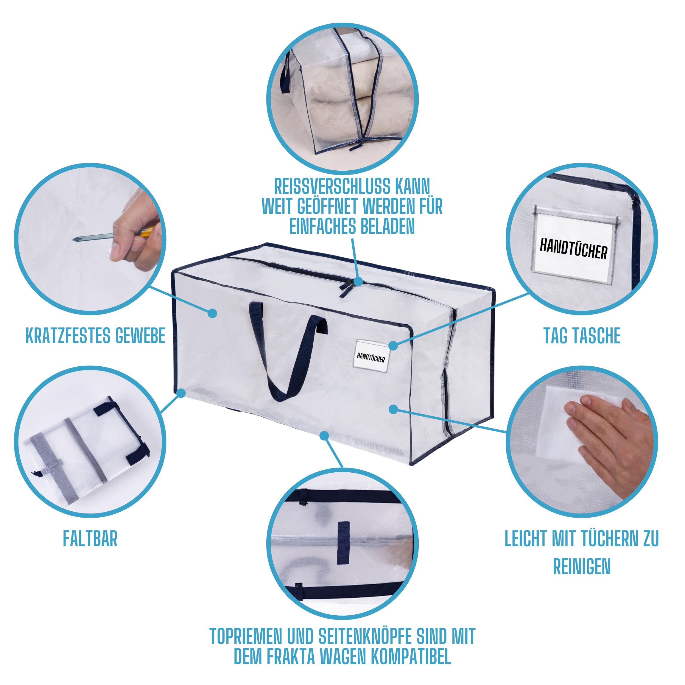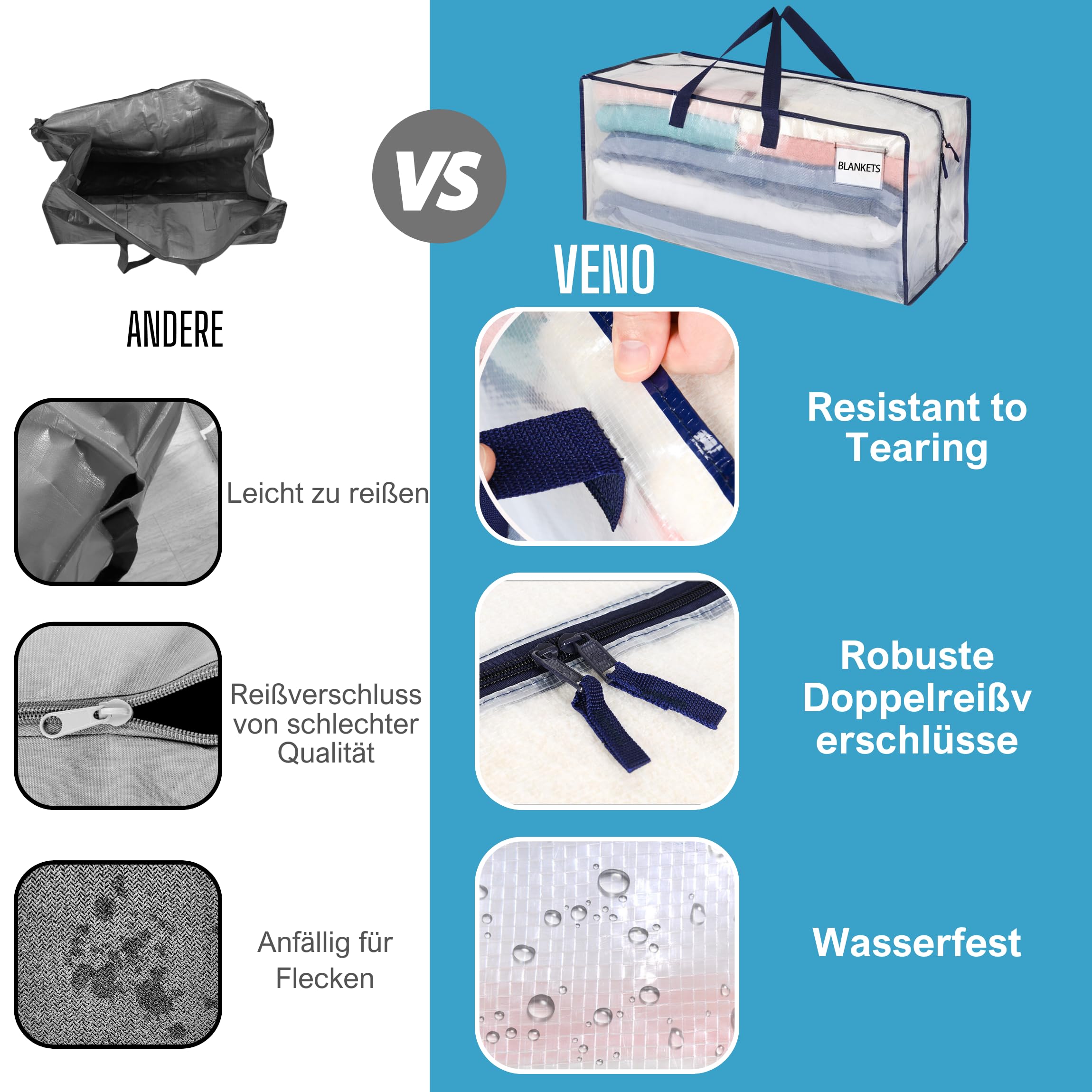 VENO Extra grosse, robuste, wiederverwendbare Aufbewahrungsbeutel sind unglaublich langlebig und vielseitig. Mit robusten Poly-Gurtbandgriffen sind sie die perfekte Alternative zu Umzugskartons. Diese Taschen sind ideal für die Aufbewahrung von Bettwäsche, Kissen, Decken, Kleidung (mit Aufhängern), Büchern, Schuhen und Urlaubsdekorationen. Sie verfügen über einen durchgehenden Reissverschluss für einfaches Be- und Entladen und bieten mehrere Tragemöglichkeiten, einschliesslich Rucksackgurte und untere Gurte für ultimative Flexibilität. Verwenden Sie sie als Alternative zu Ikea-Taschen mit Reissverschlüssen oder traditionellen Umzugsartikeln, wodurch sie perfekte Packtaschen für den Umzug sind. Diese strapazierfähigen Umzugstaschen können bis zu 22,7 kg tragen, passend für mittelgrosse und grosse Umzugskartons. Sie sind ideal für Studenten, Familien in Wohnungen und alle, die nach effizienten Aufbewahrungs- und Umzugslösungen suchen. Wählen Sie VENO um Ihren Umzug zu optimieren und die Umwelt zu schützen.